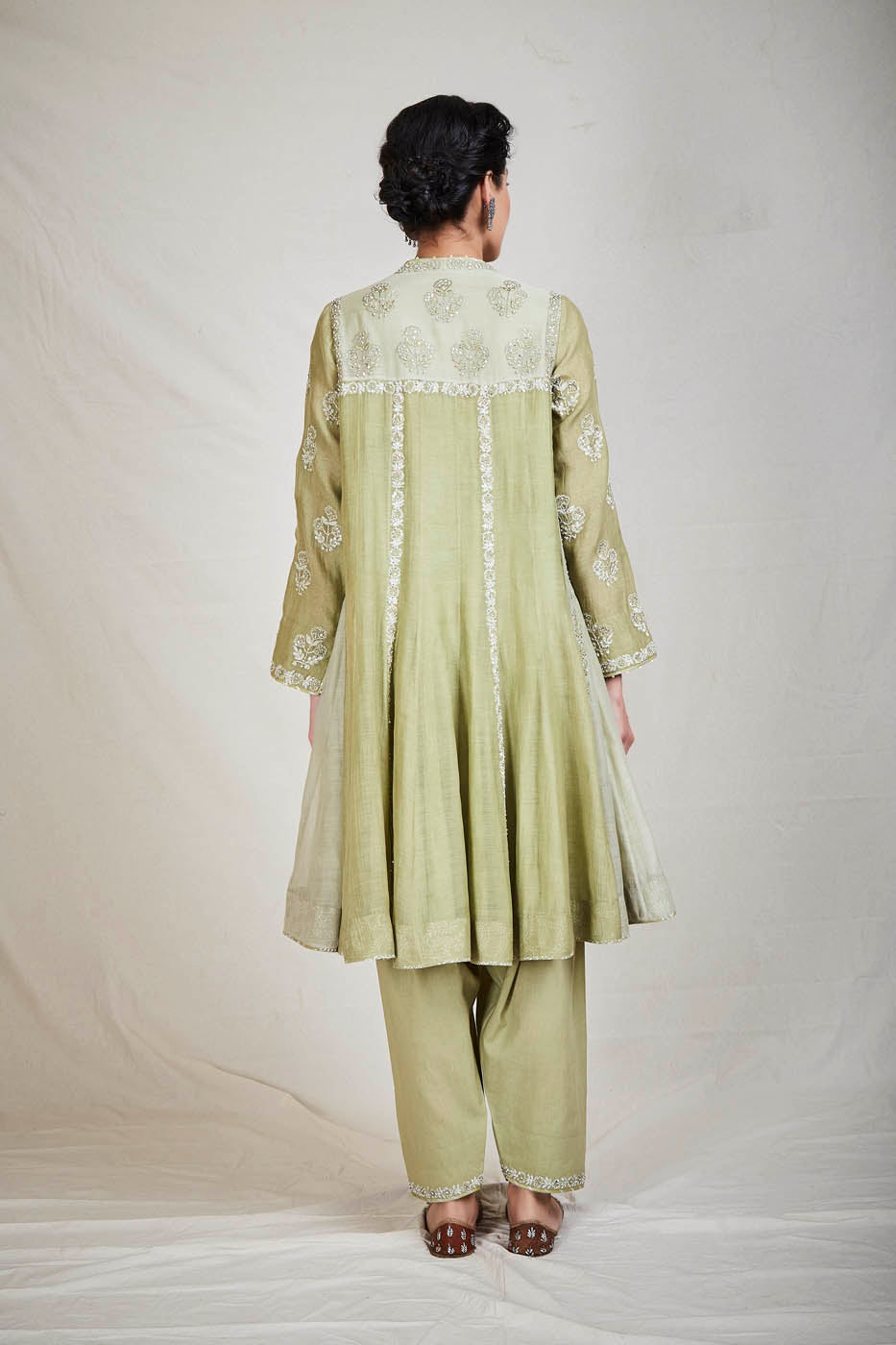 This set features an olive colour mul anarkali embroidered with floral and paisley butis and a pair of cotton salwar. It comes with a mukaish embroidered mul dupatta.