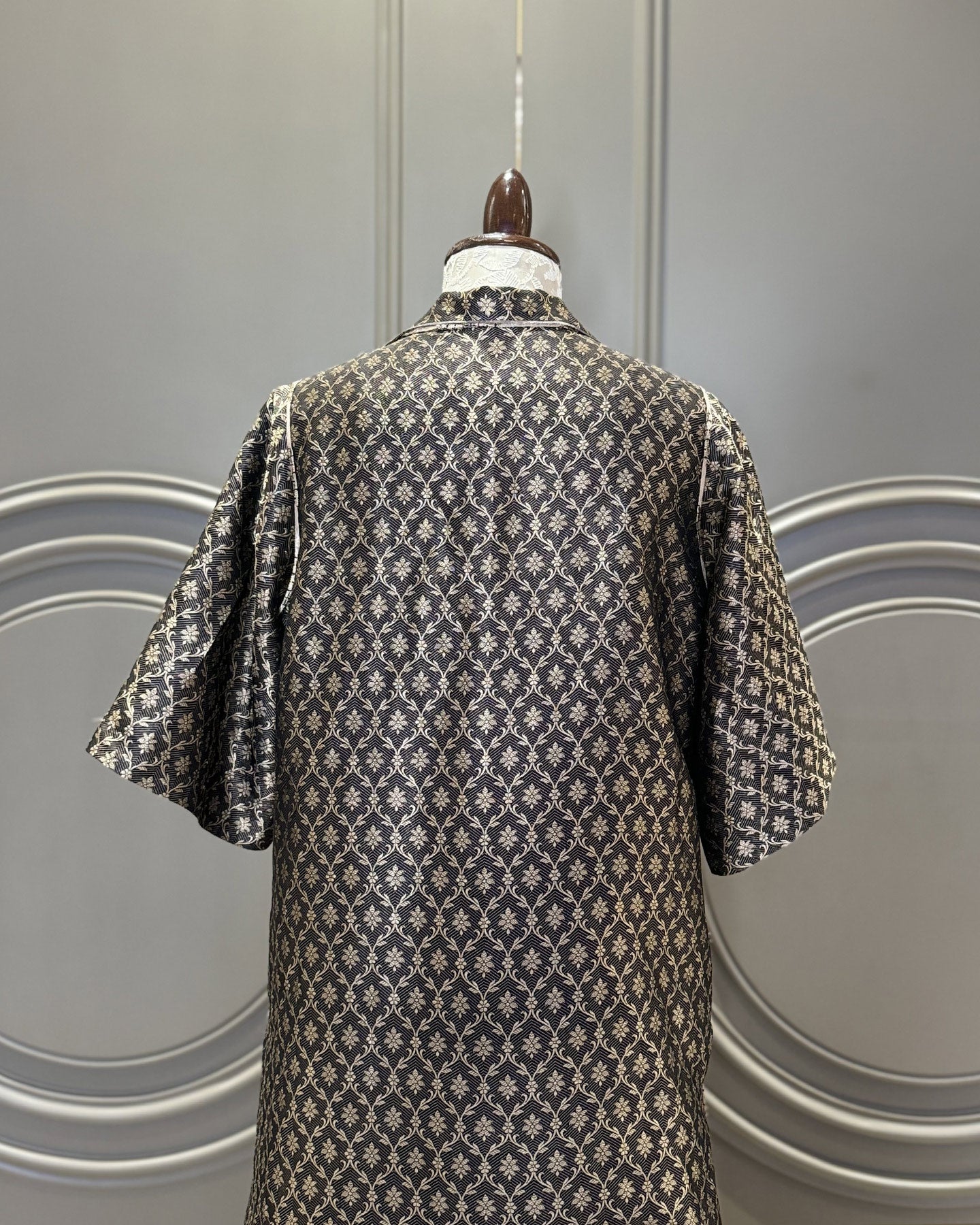 Discover our Handwoven Banarasi Brocade Blazer Set in a sleek black hue, adorned with an intricate floral golden woven pattern. This ensemble seamlessly blends style and functionality, with front pockets, side slits, and a distinctive kimono sleeve design. The notch lapel collar adds timeless elegance, while linen tissue silk detailing at the hemlines offers a subtle, refined finish. Elevate your look with this unique black blazer set, where tradition meets modernity in perfect harmony.