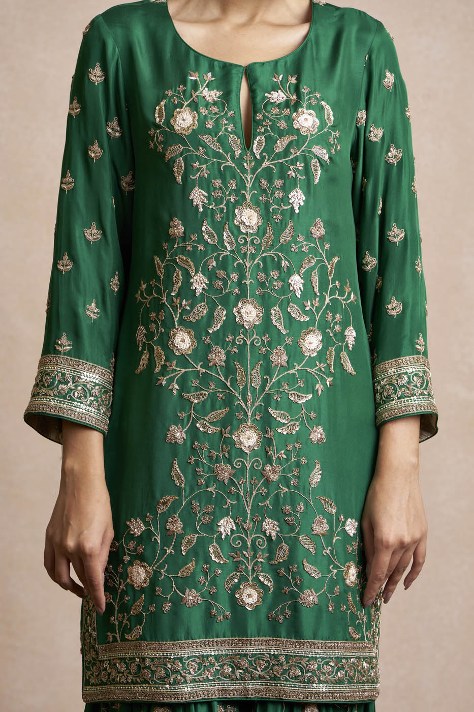 This set features a mid length kurta paired with a gharara and a beige organza dupatta.