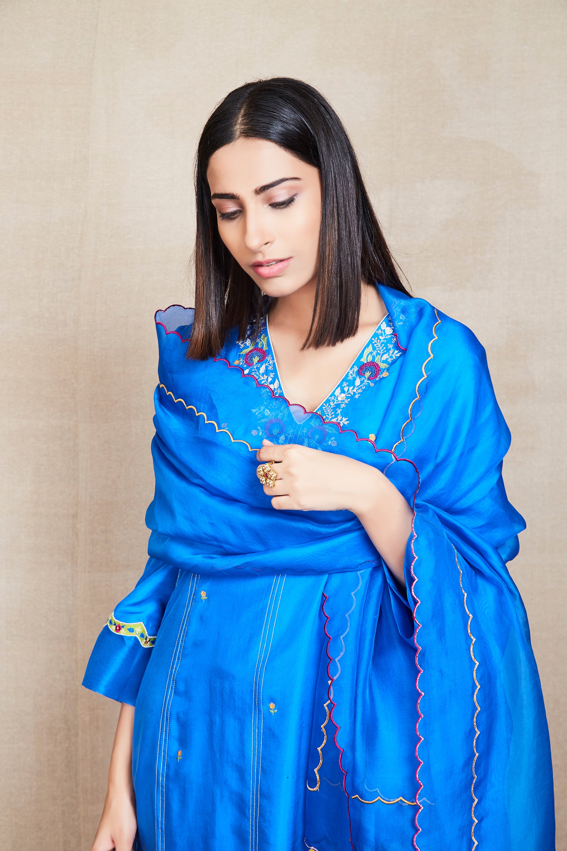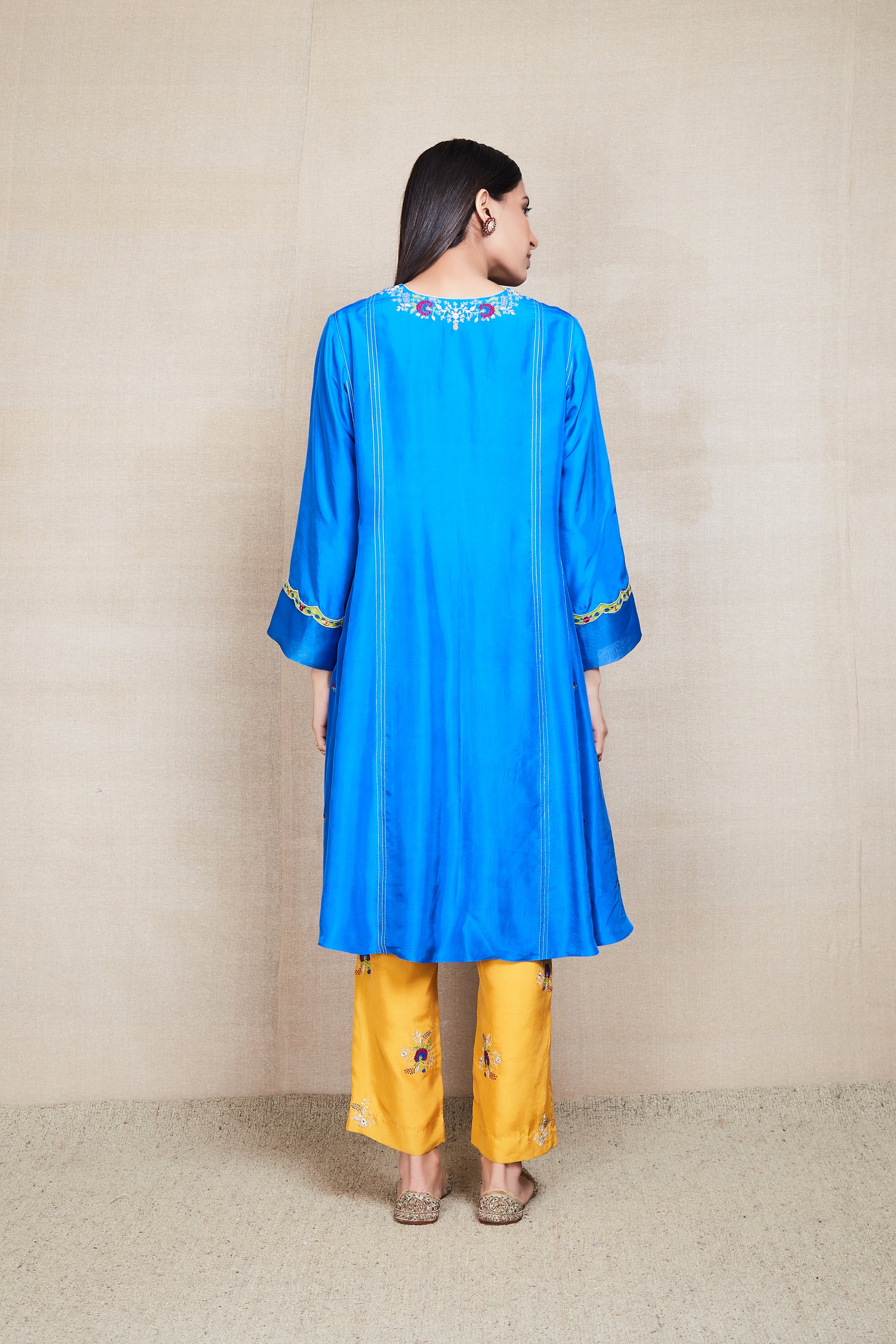 This is a blue silk kurta enhanced with floral butis and floral appliqué work motifs on the sleeves. It comes with a pair of embroidered goldenrod silk pants and a blue organza scalloped dupatta.