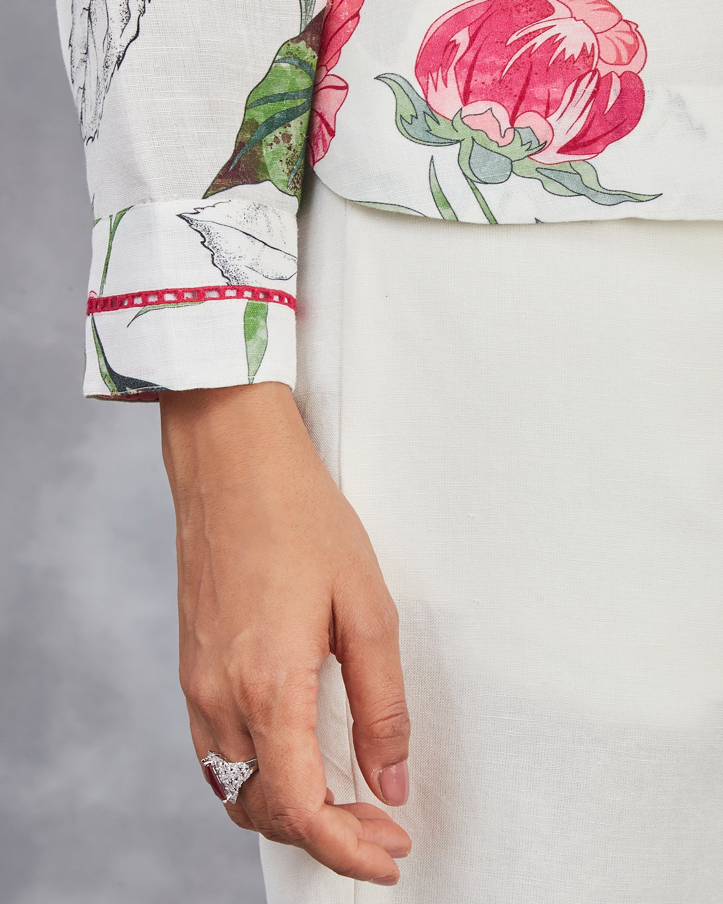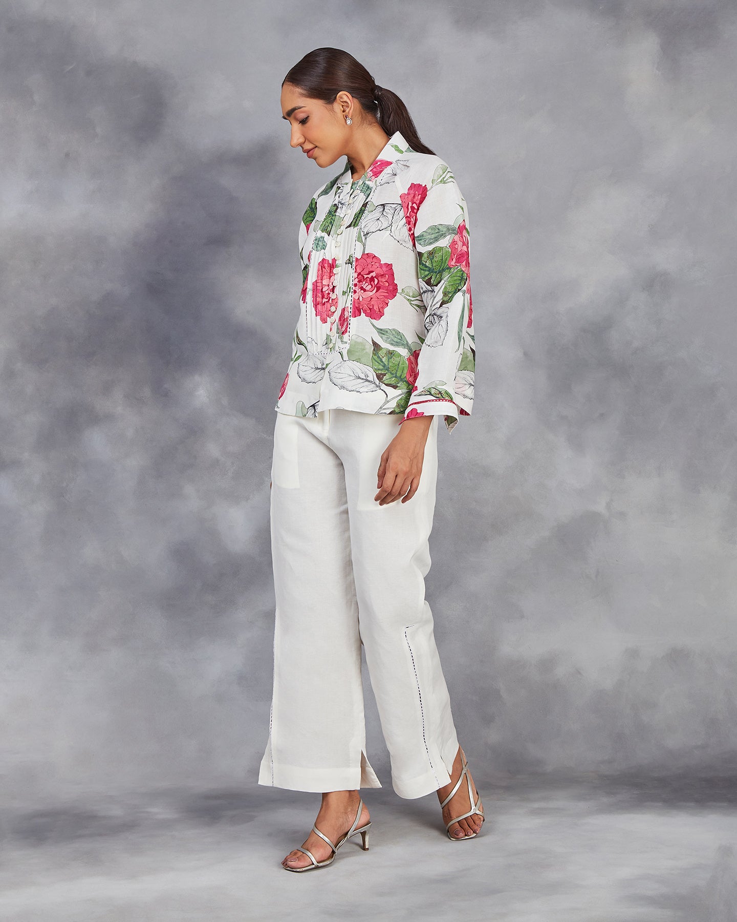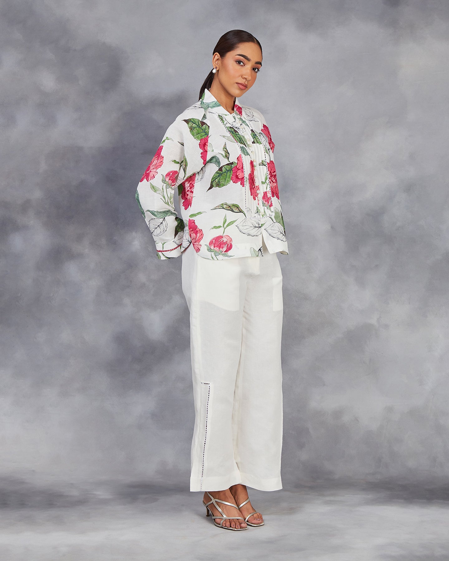 This is an elegant pure linen co-ordinate set in white with digitally printed roses. The top features band collar, beautiful pintuck and button detailing, full sleeves with cuffs, and delicate beading. Paired with plain relaxed fit pants with small slits and delicte beading.