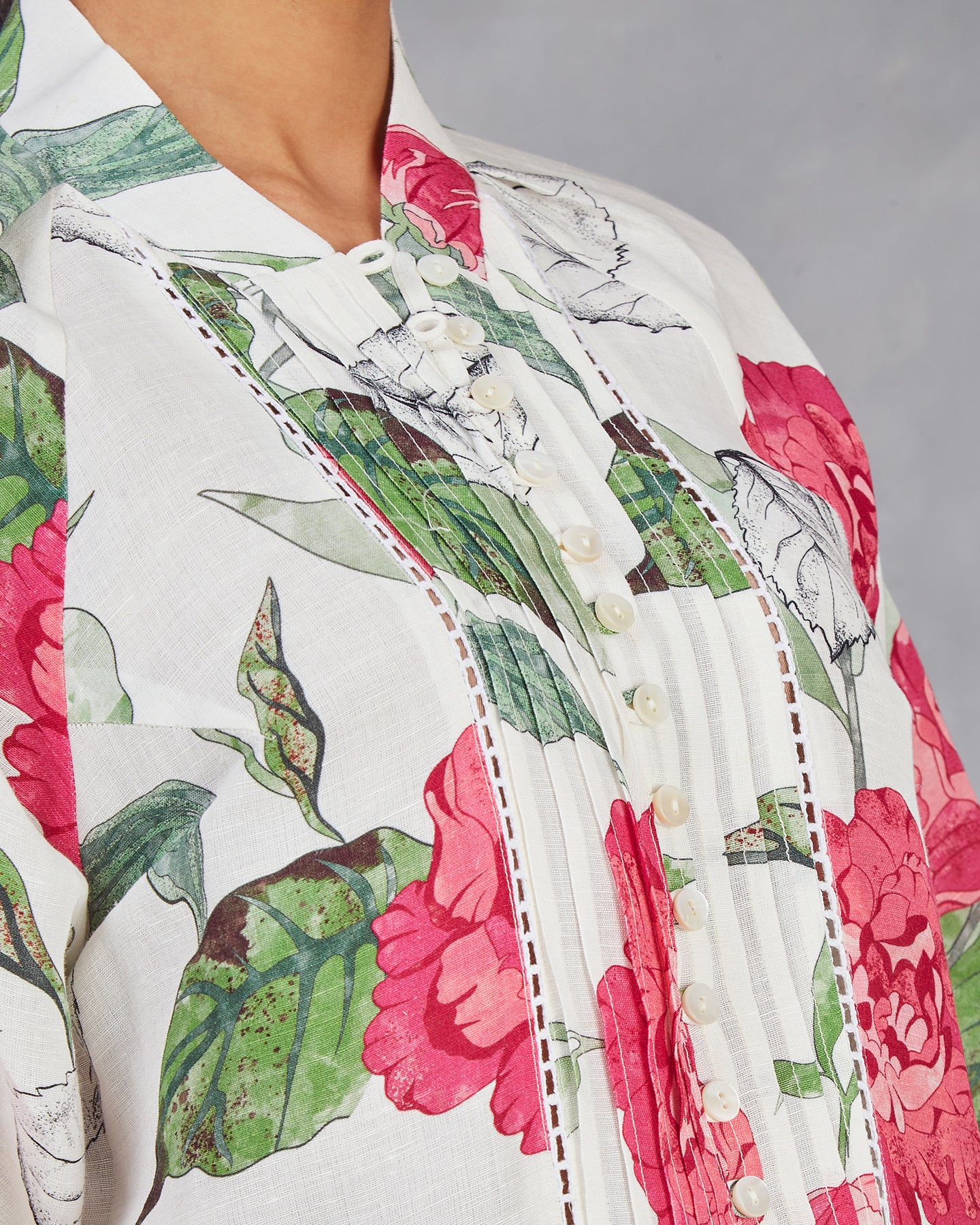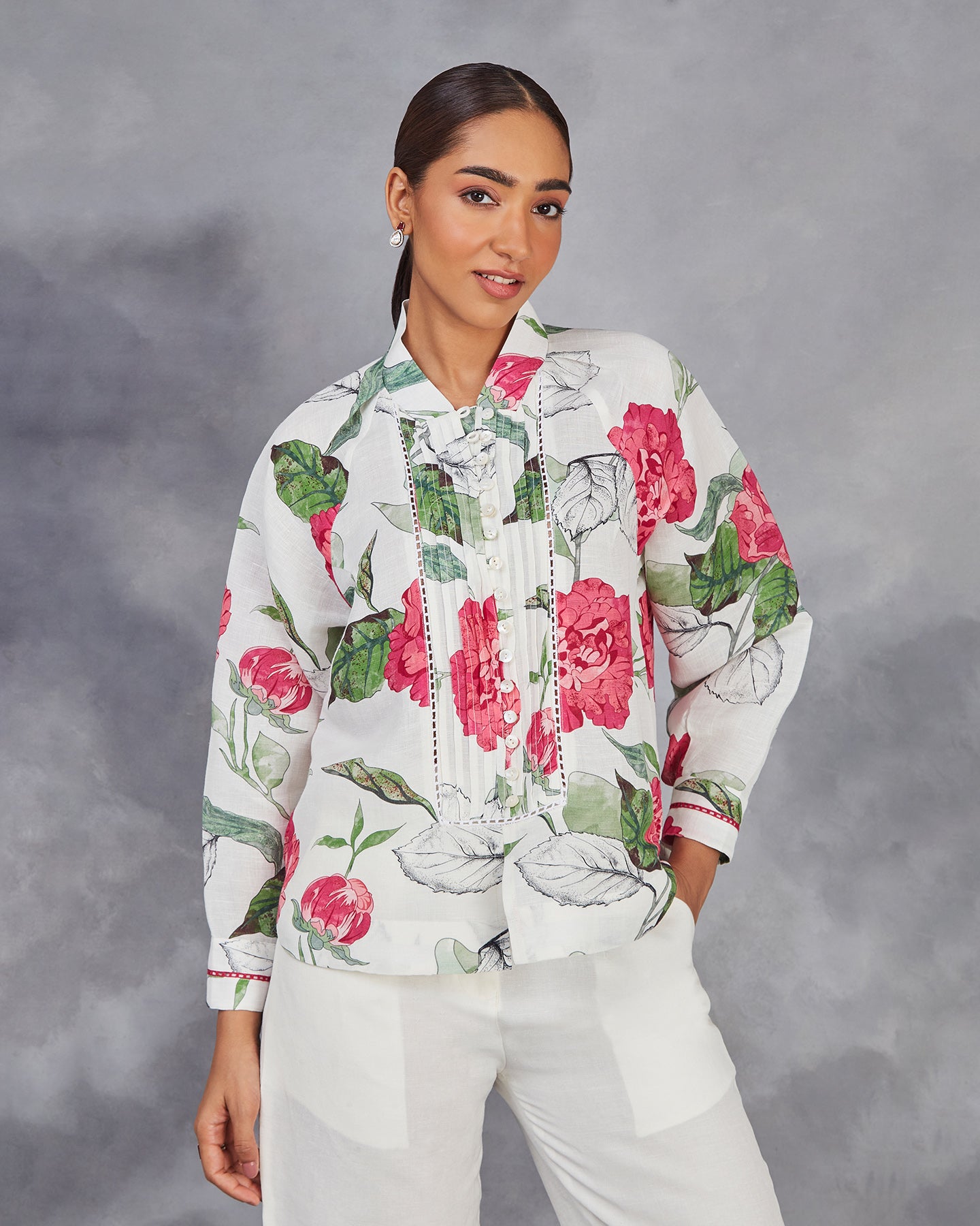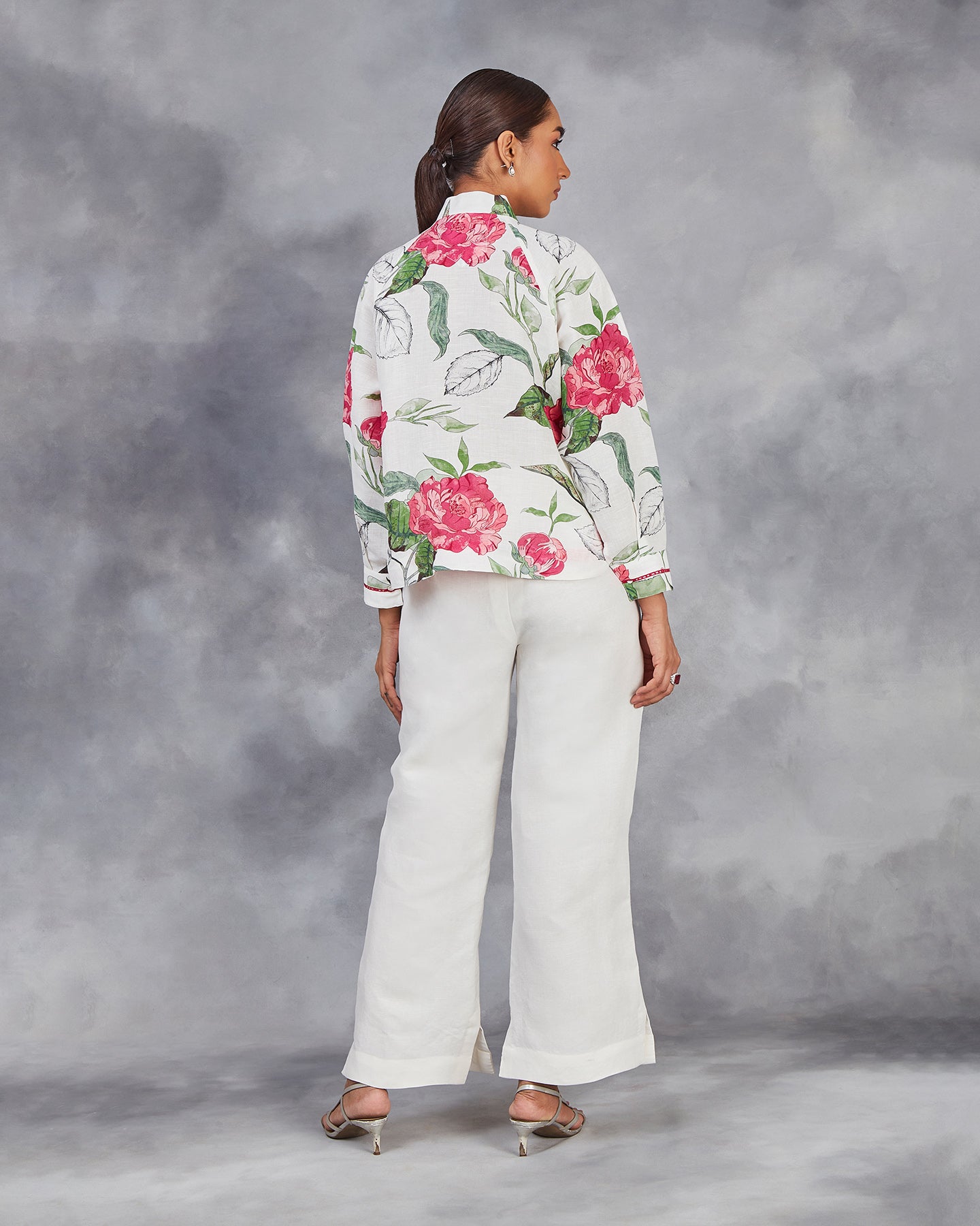 This is an elegant pure linen co-ordinate set in white with digitally printed roses. The top features band collar, beautiful pintuck and button detailing, full sleeves with cuffs, and delicate beading. Paired with plain relaxed fit pants with small slits and delicte beading.