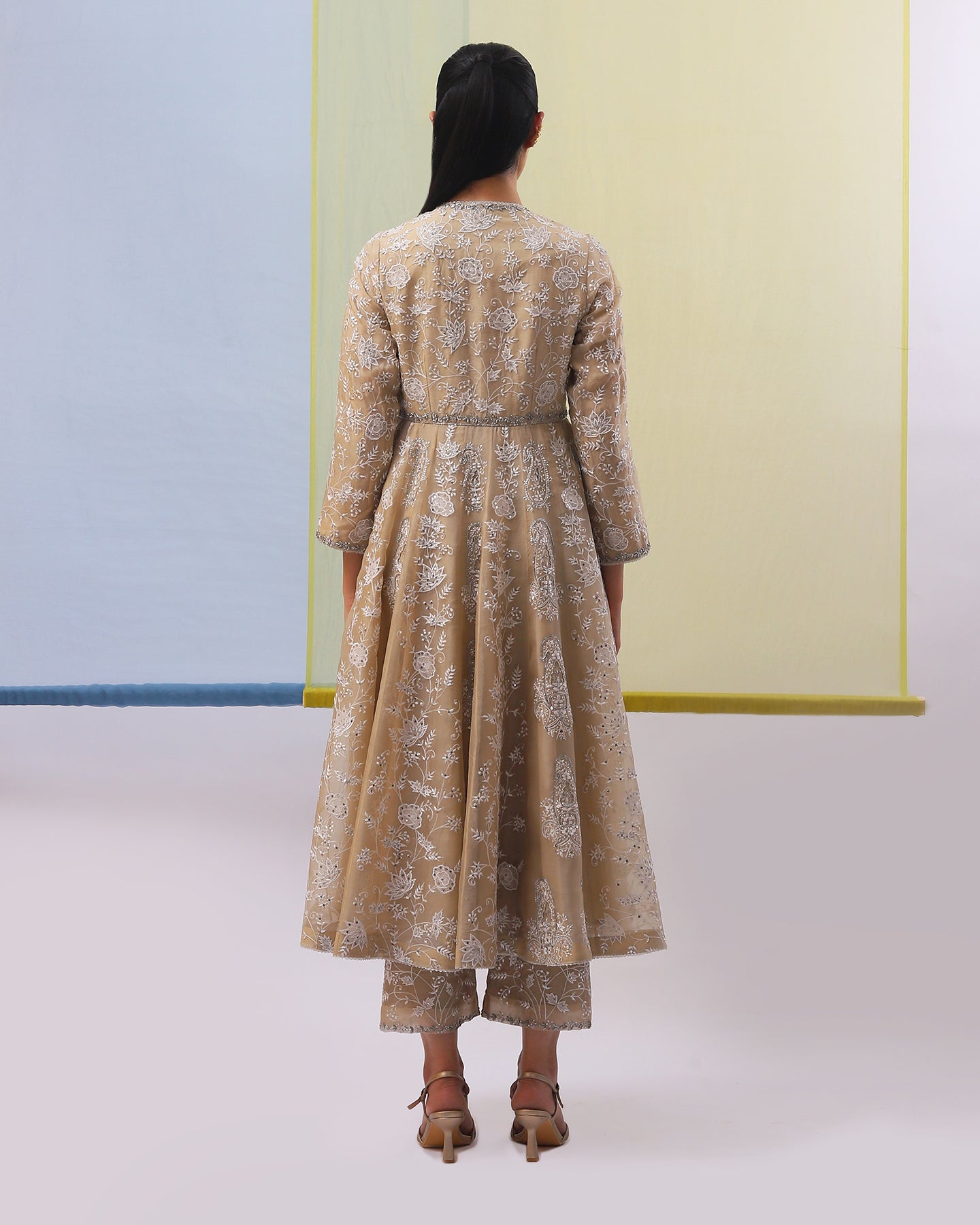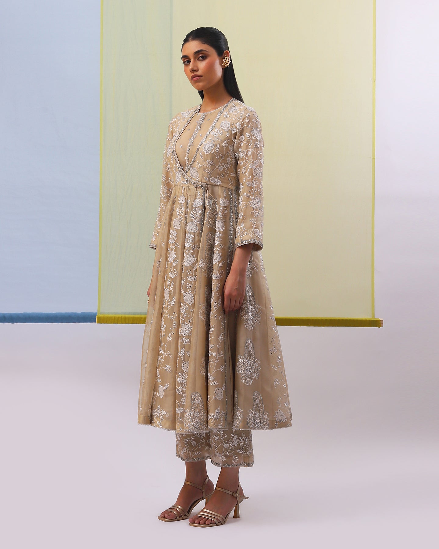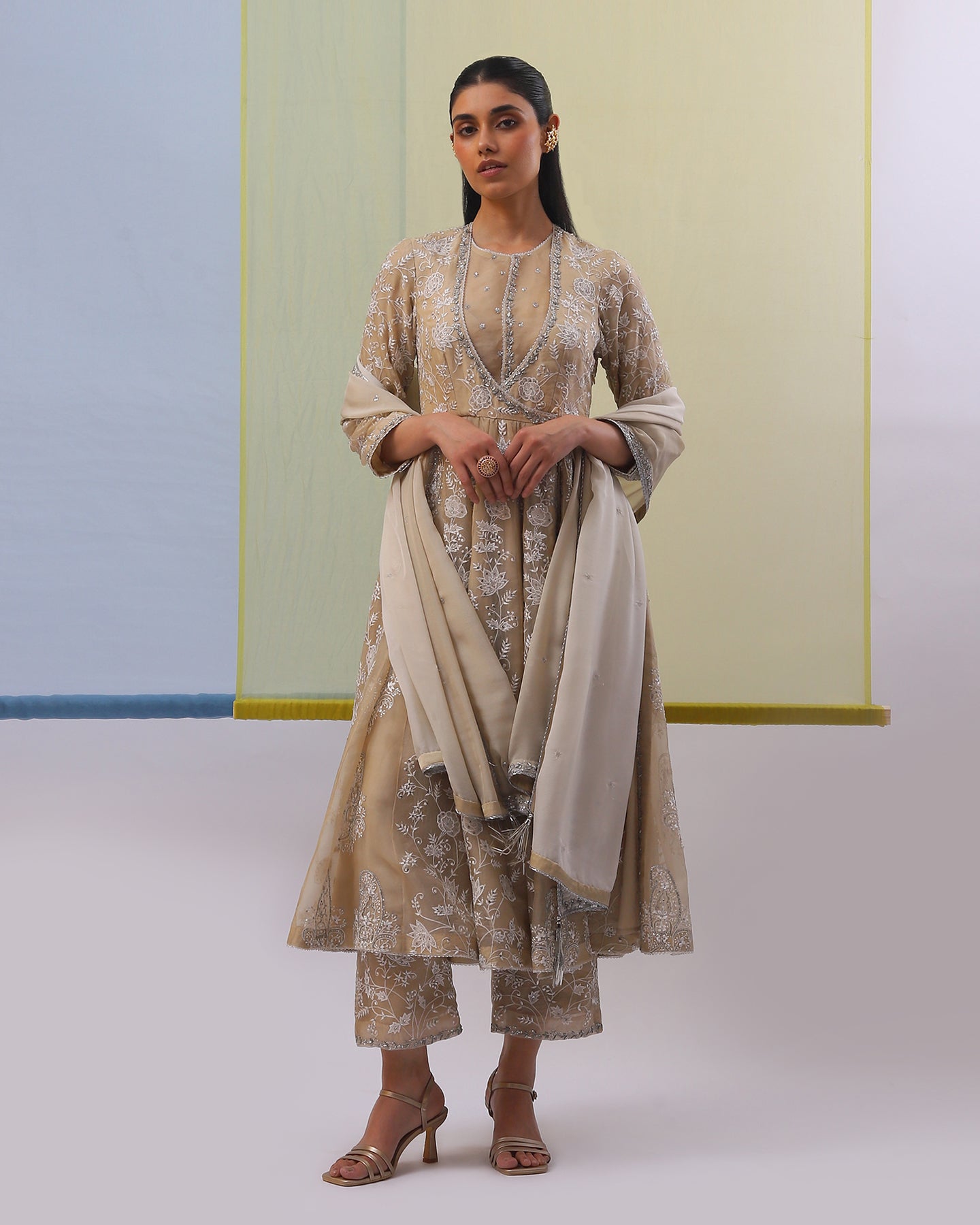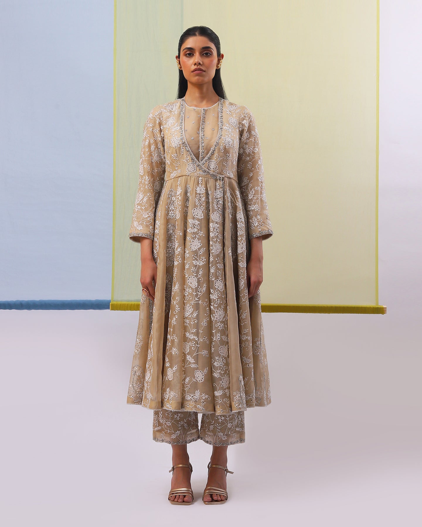 Elevate your wardrobe with this exquisite long angrakha set in sophisticated beige, crafted from pure silk organza and pure flat chiffon. The angrakha features a touch neck, full sleeves, and intricate off-white organza applique work with floral jaal embroidery, sequins, and silver dabka accents. Matching straight pants in pure silk organza with coordinating embroidery and a pure flat chiffon dupatta in an ombre blend of off-white and beige, embellished with hand-embroidered dabka and sequin borders and motifs, complete this refined ensemble.
