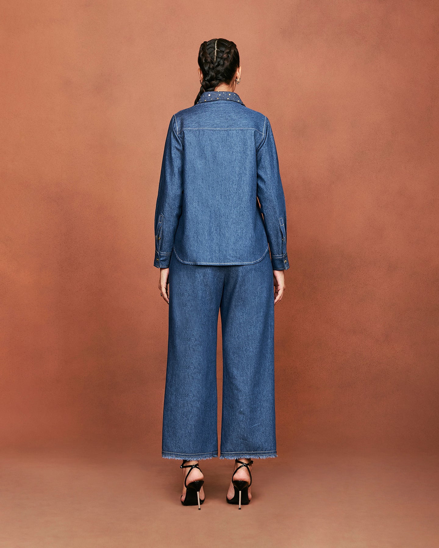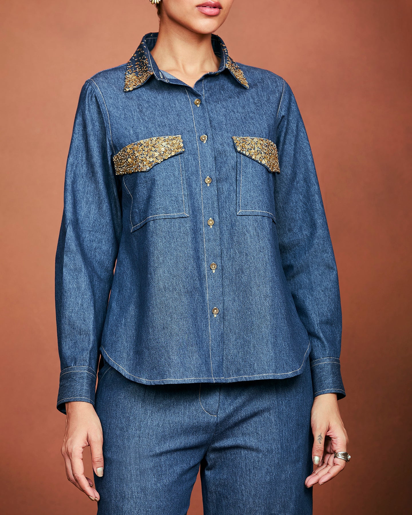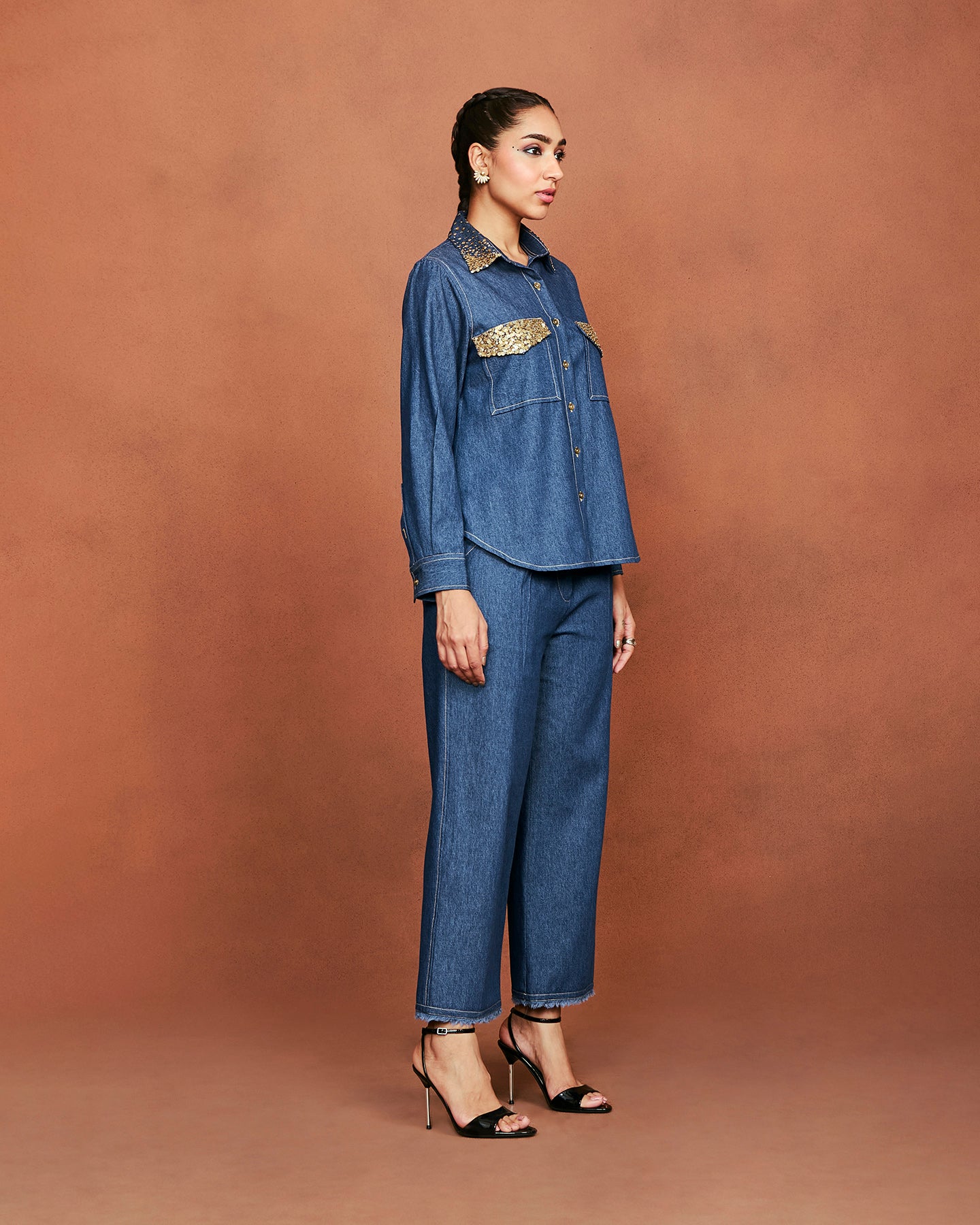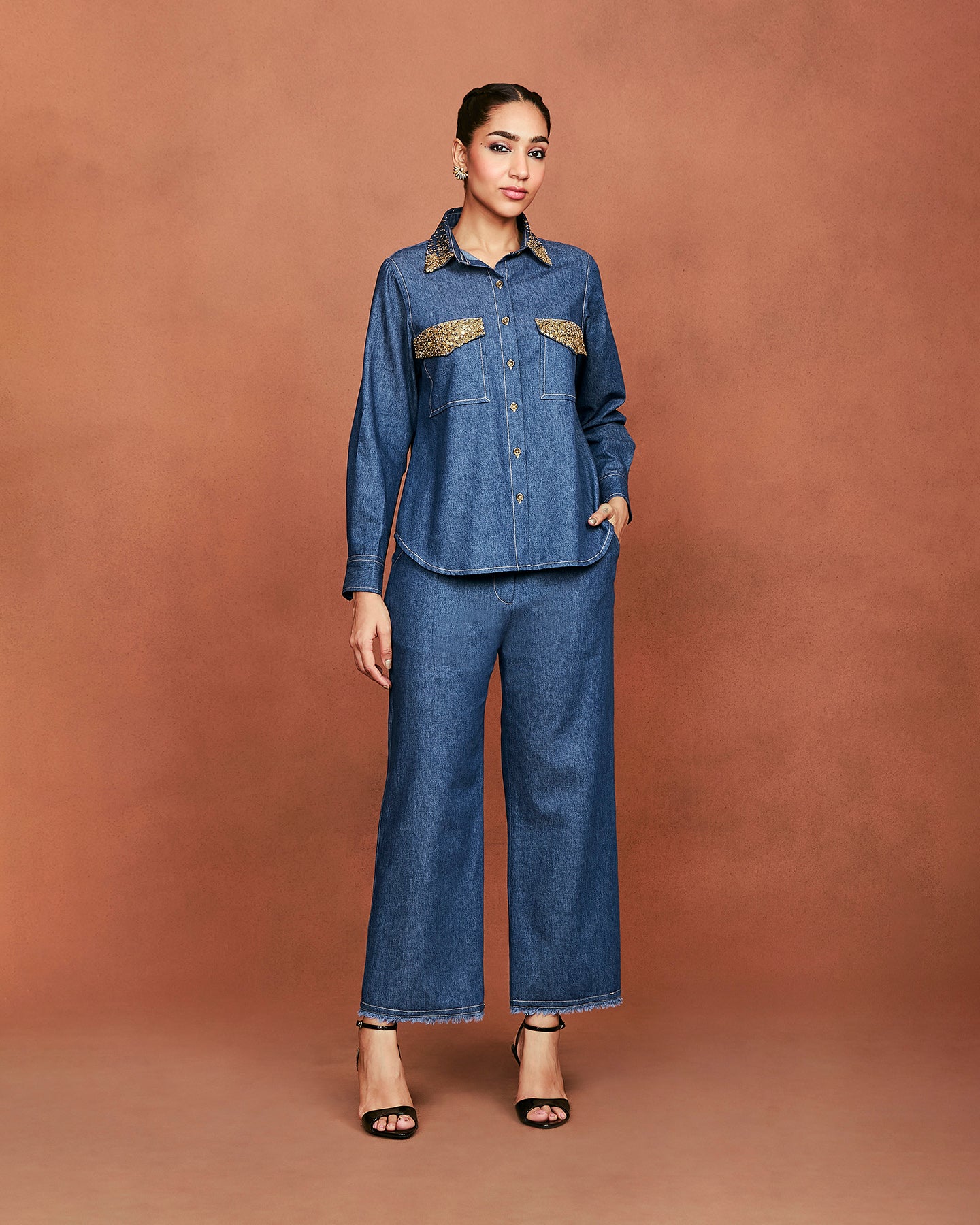 This is a blue denim co-ordinate set. The shirt has a classic shirt collar, front placket, front pockets and cuff sleeves. It is paired with straight fit pants featuring side pockets. The set is adorned with sequin embroidery, bead work, and cotton thread work.