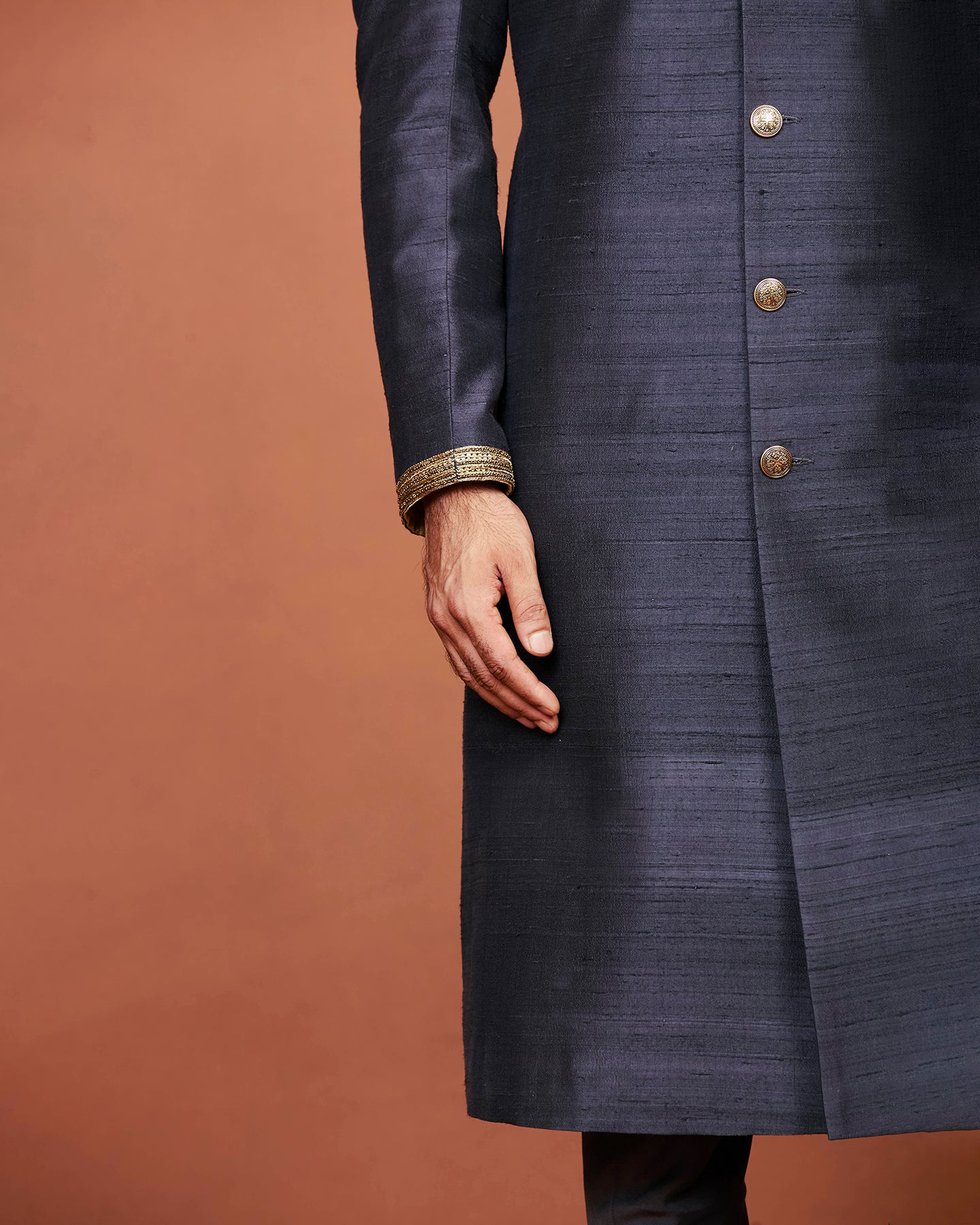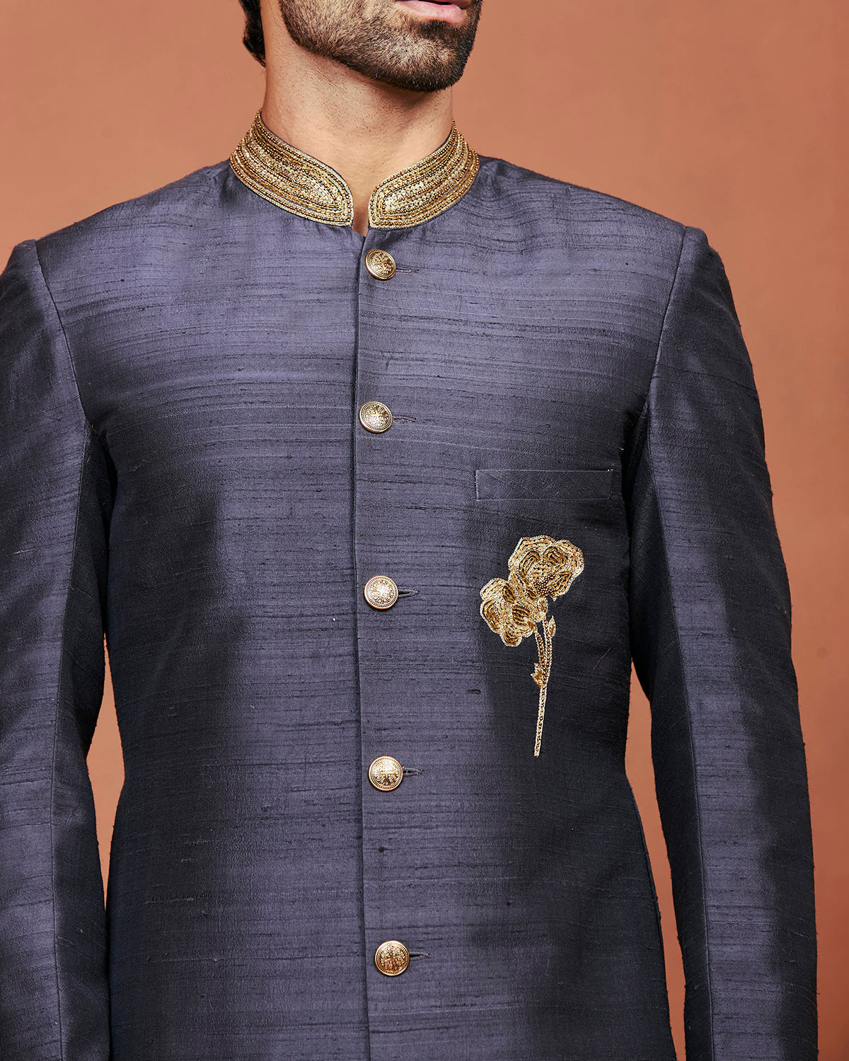 A charcoal grey silk achkan is paired with a matching pure silk kurta and churidhar. The set is adorned with delicate embroidery handcrafted using zardozi and aari technique with zari, dabka, sequins and beads.