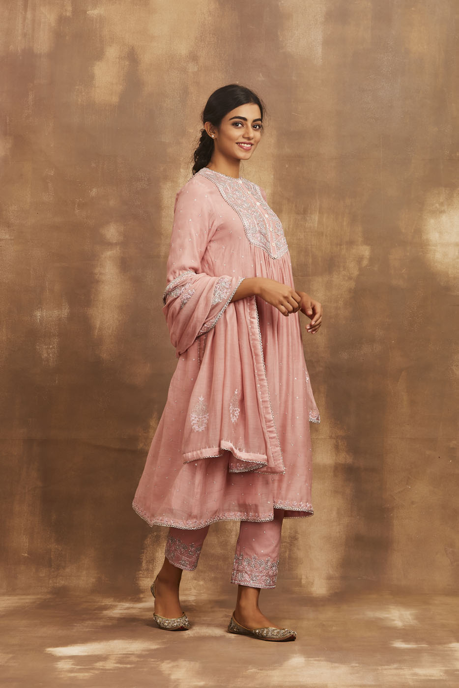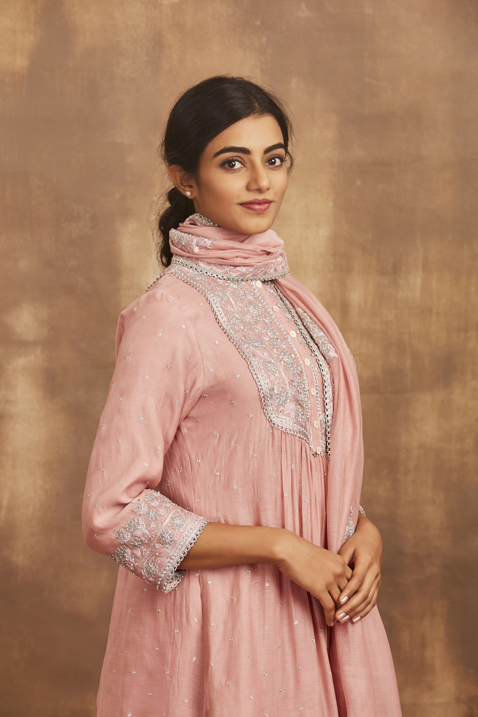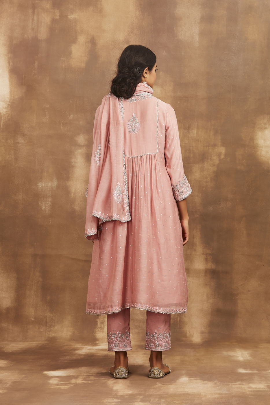 This set features floral zari embroidered kurta and pants with mul dupatta.