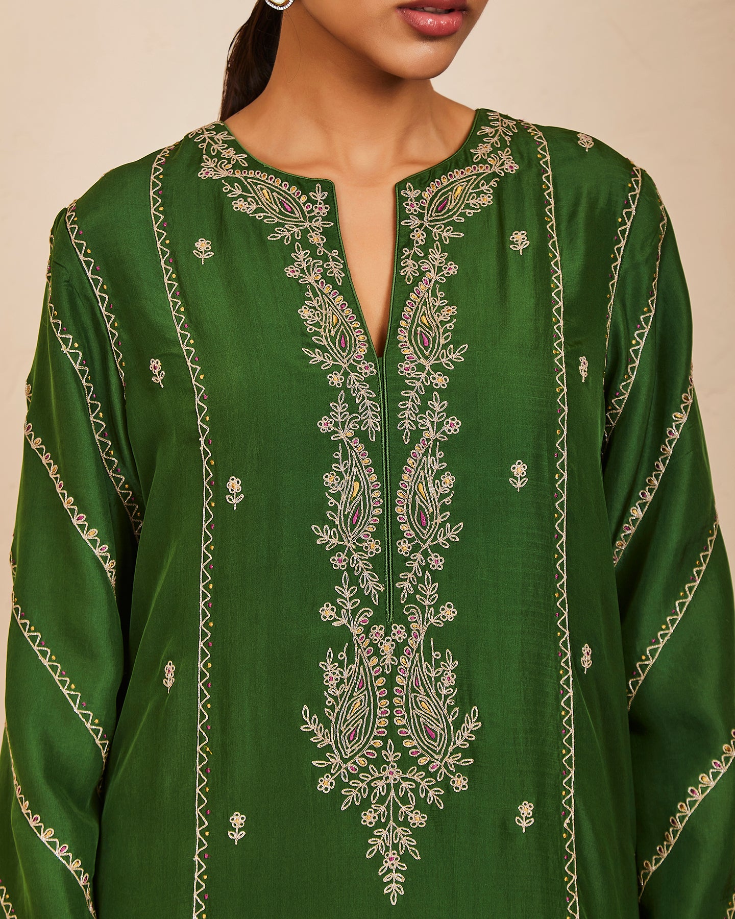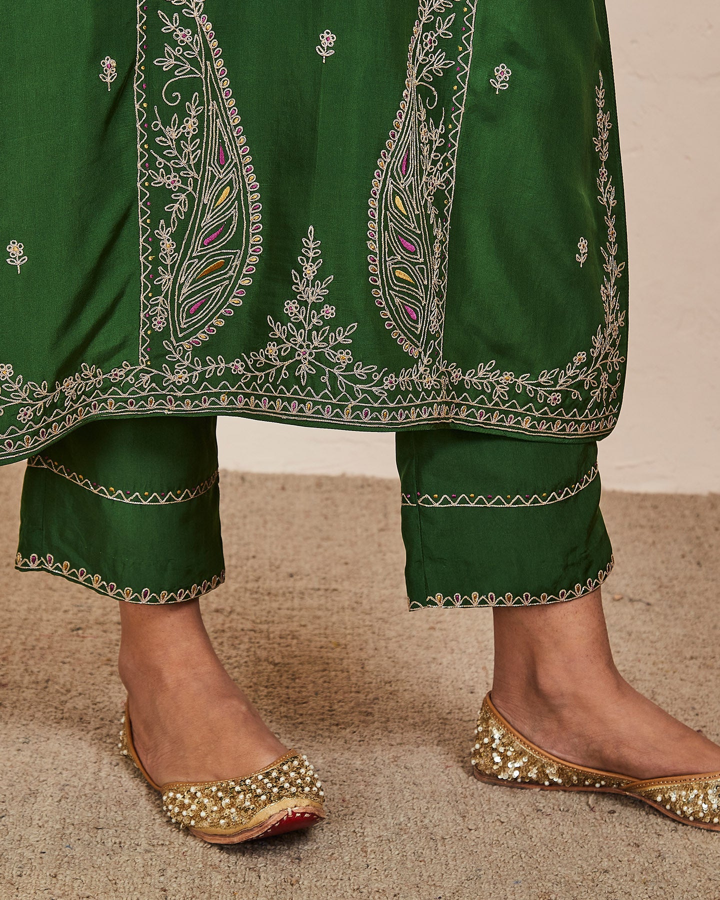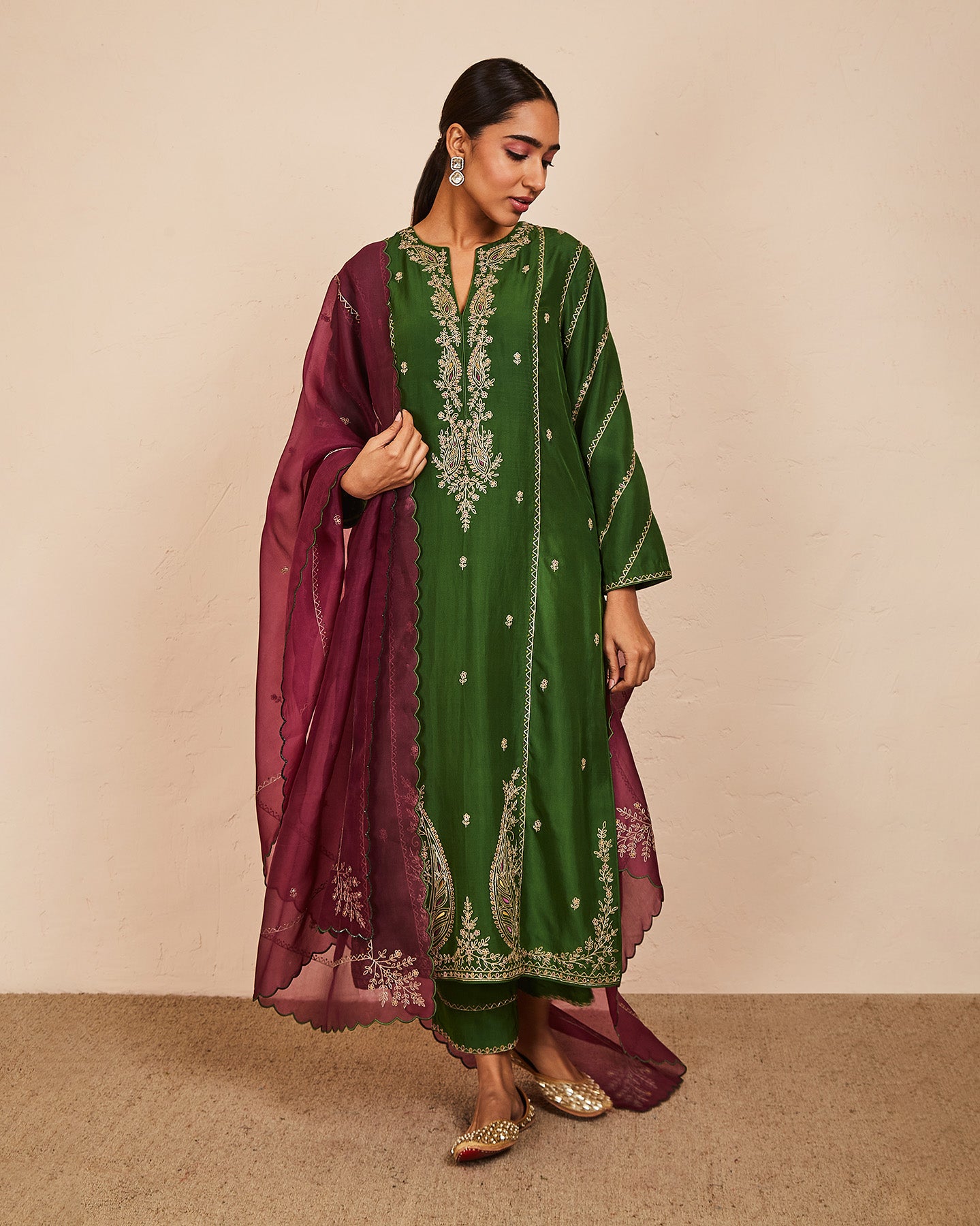 This is a green silk kurta with a pair of matching trousers and a contrasting wine colour dupatta. All finely embroidered with silk threads and zari.