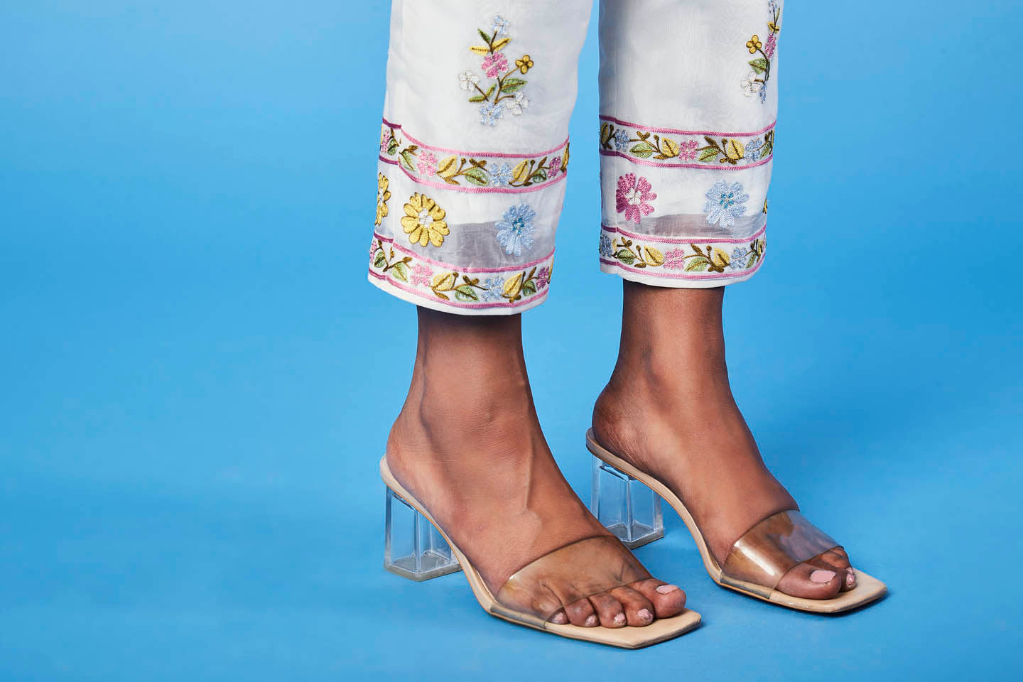 This 0ff-white organza kalidar kurta has been enhanced with multi-coloured floral embroidery. It comes with a pair of embroidered pants and an embroidered georgette dupatta.