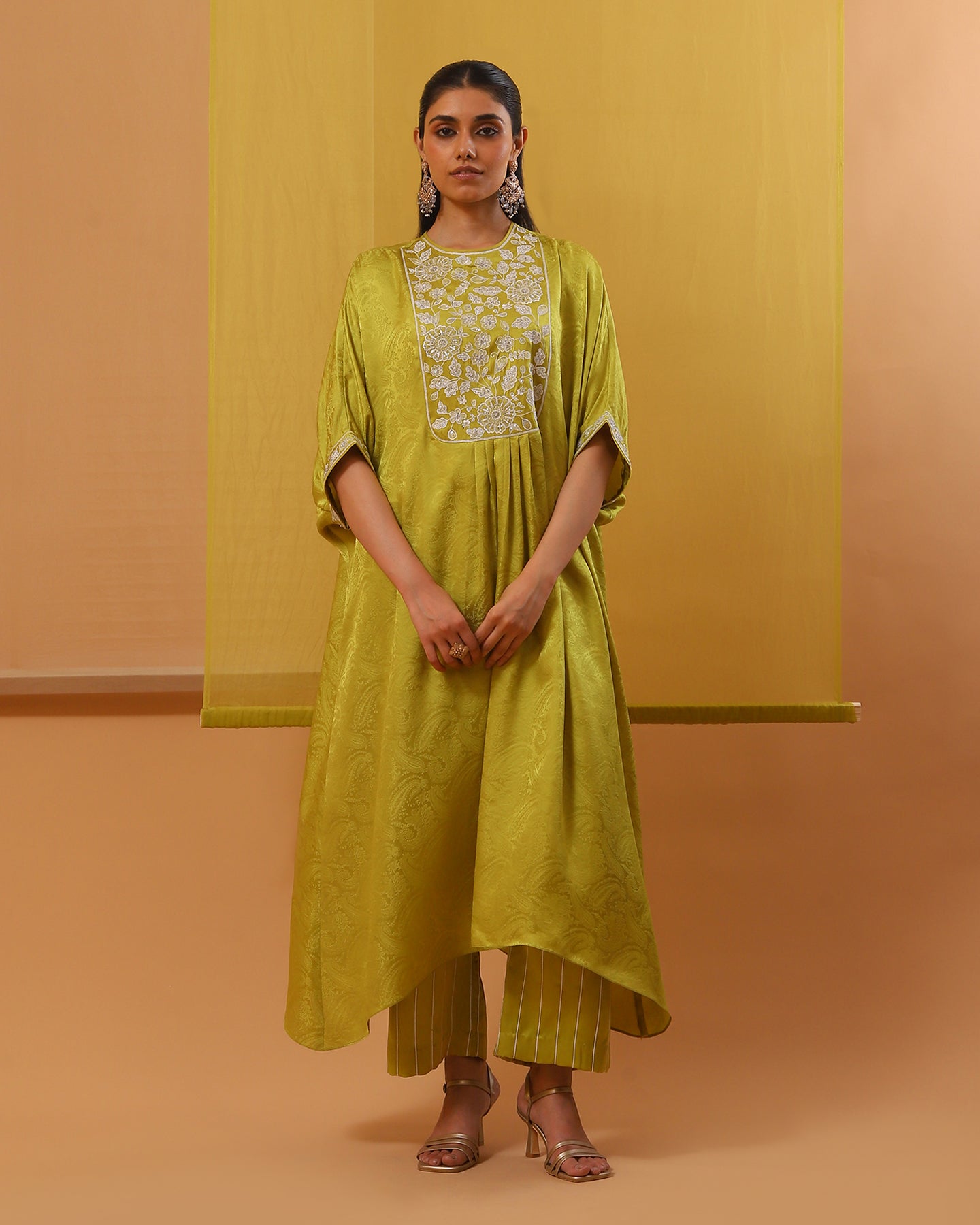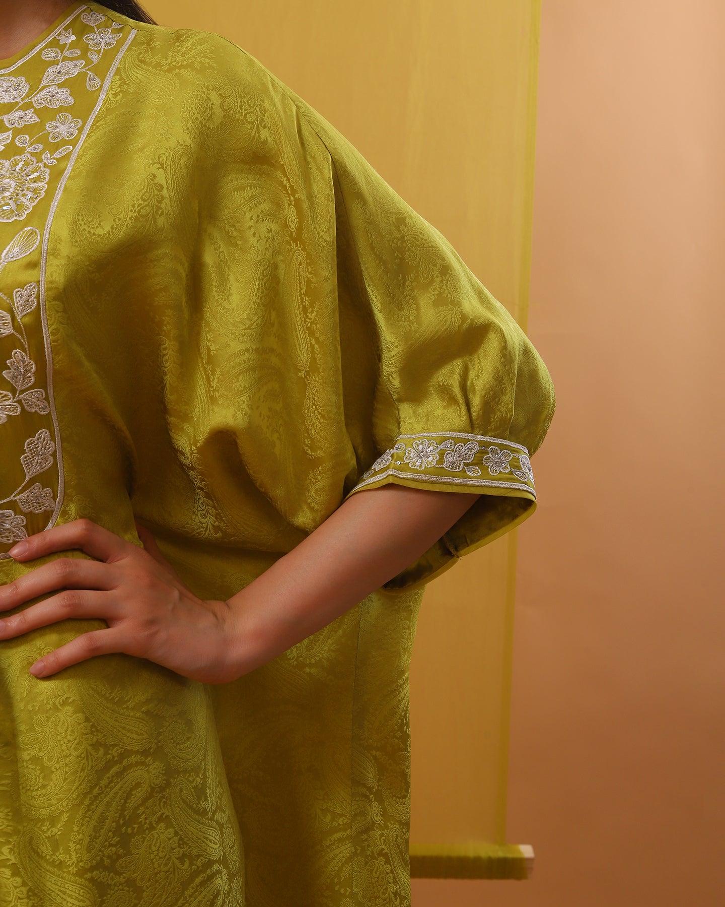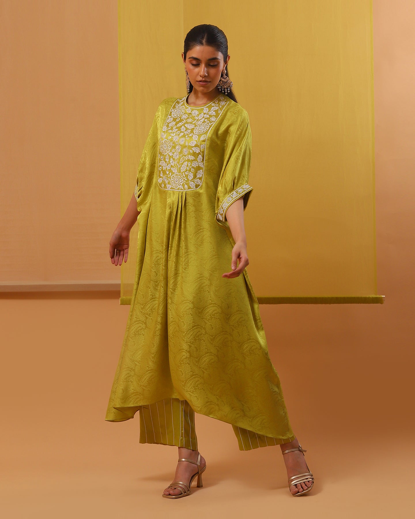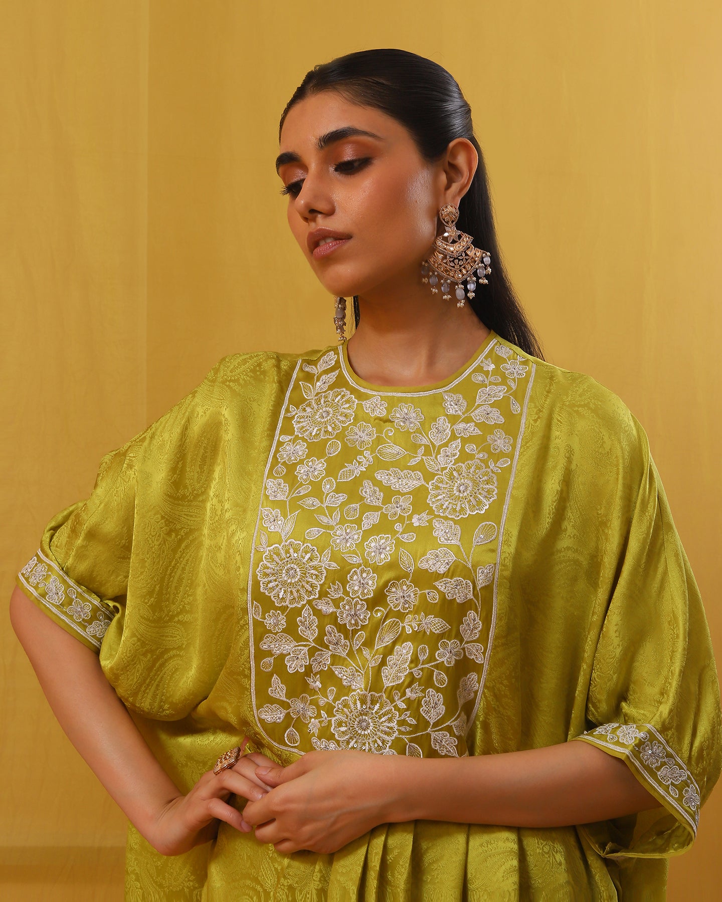 In the realm of verdant dreams, behold this enchanting lime green asymmetrical kaftan set, a fusion of elegance and allure. Crafted from pure satin jacquard, the kaftan boasts a touch neck and gathered sleeves with cuffs adorned with floral pattern embroidery in off-white silk thread, delicately embellished with silver sequins. Paired with straight-fit pure silk satin pants adorned with embroidered vertical lines, the ensemble embodies a timeless romance. Completing this vision is a matching lime green pure flat chiffon scarf, its edges bordered with delicate motifs, weaving a tale of sophistication and enchantment.
