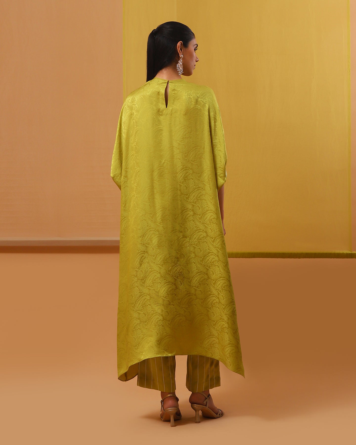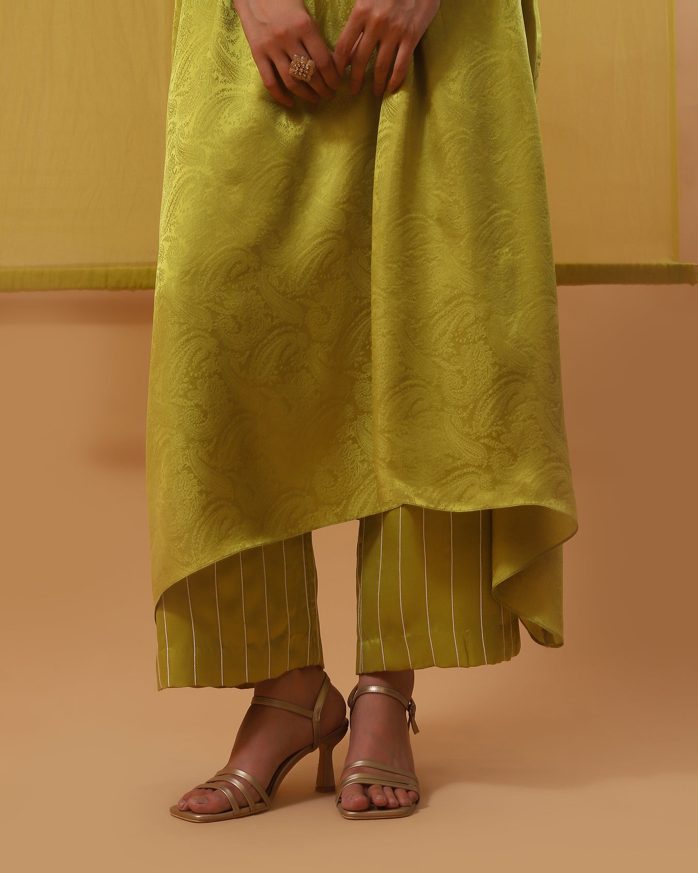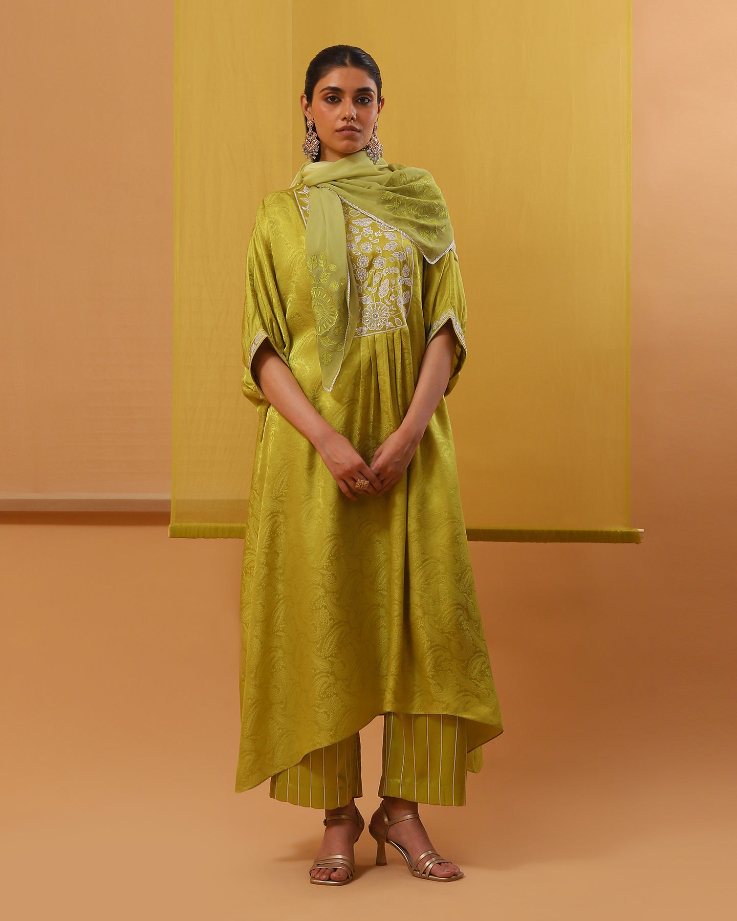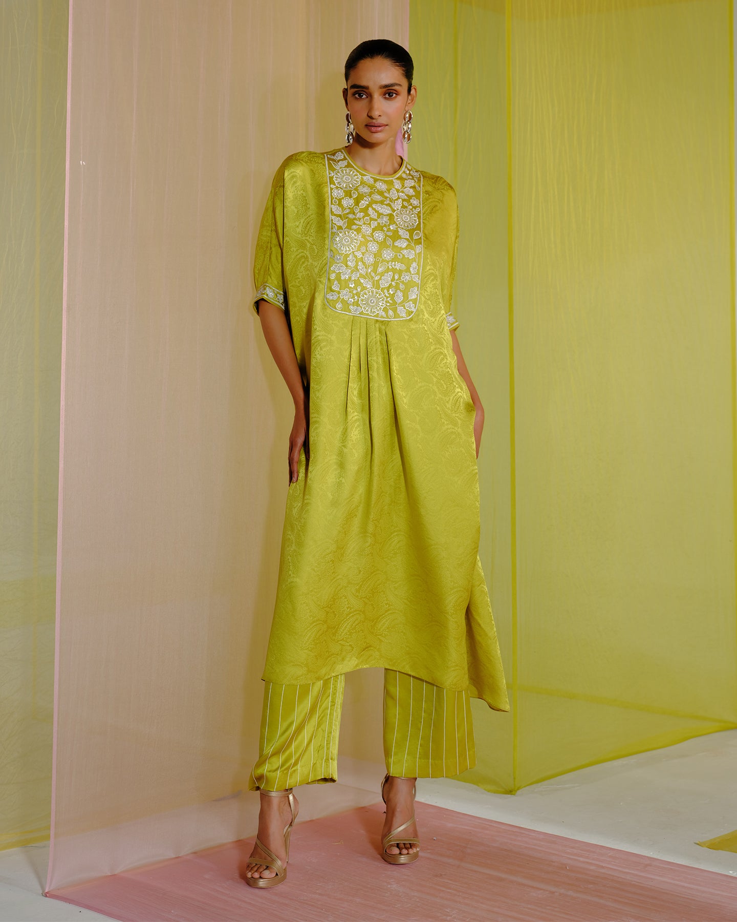 In the realm of verdant dreams, behold this enchanting lime green asymmetrical kaftan set, a fusion of elegance and allure. Crafted from pure satin jacquard, the kaftan boasts a touch neck and gathered sleeves with cuffs adorned with floral pattern embroidery in off-white silk thread, delicately embellished with silver sequins. Paired with straight-fit pure silk satin pants adorned with embroidered vertical lines, the ensemble embodies a timeless romance. Completing this vision is a matching lime green pure flat chiffon scarf, its edges bordered with delicate motifs, weaving a tale of sophistication and enchantment.