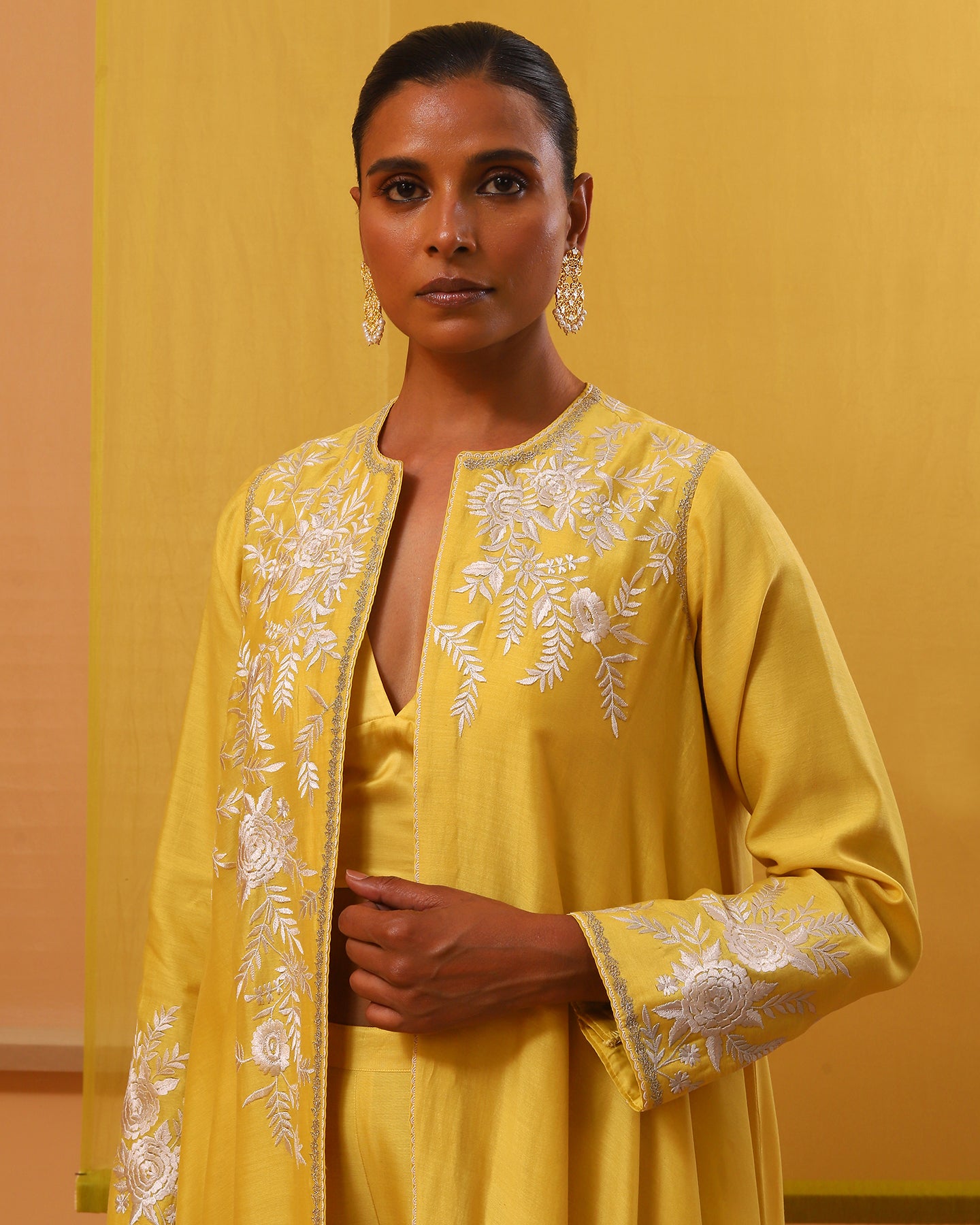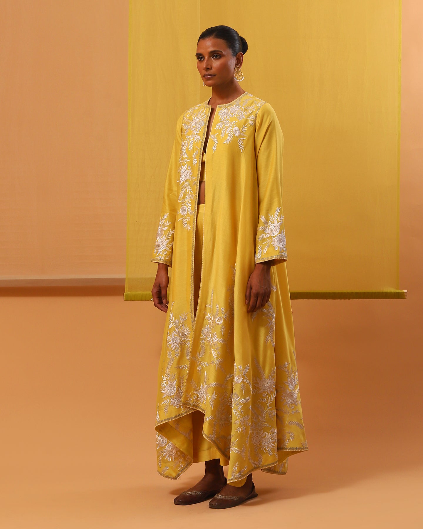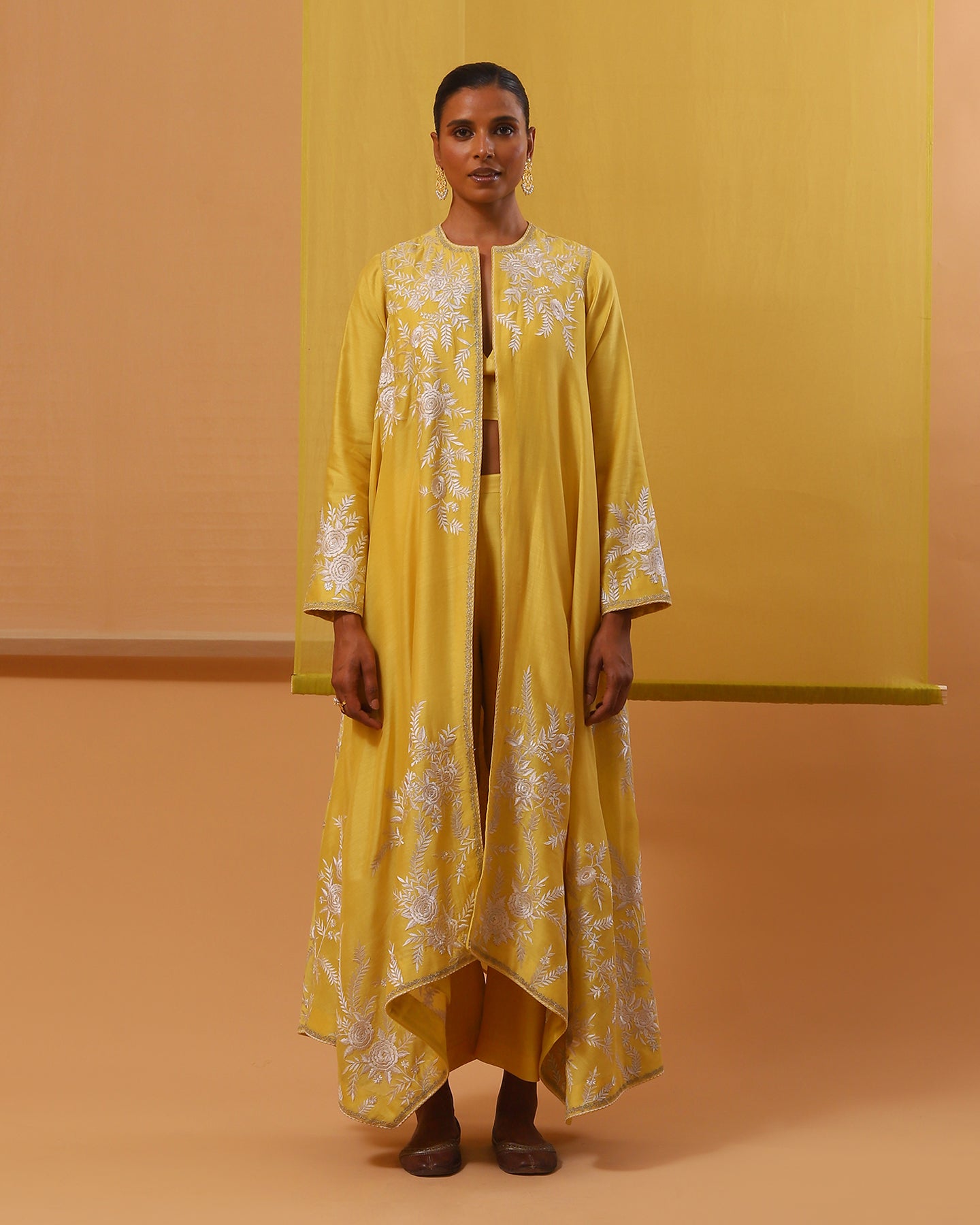 Introducing our enchanting yellow handwoven silk chanderi jacket set, a masterpiece of allure and sophistication. The asymmetrical cape-style jacket opens in the front and has full sleeves. It is adorned with delicate off-white and beige gara embroidery, intertwining silk threads to weave tales of elegance. Each hemline is kissed by silver zari work, casting a spell of opulence. Paired with matching luxurious handwoven silk chanderi straight-fit pants and a stylish pure silk satin bustier. This ensemble is a symphony of romance and timeless beauty, perfect for those who wish to dance through life in exquisite style.