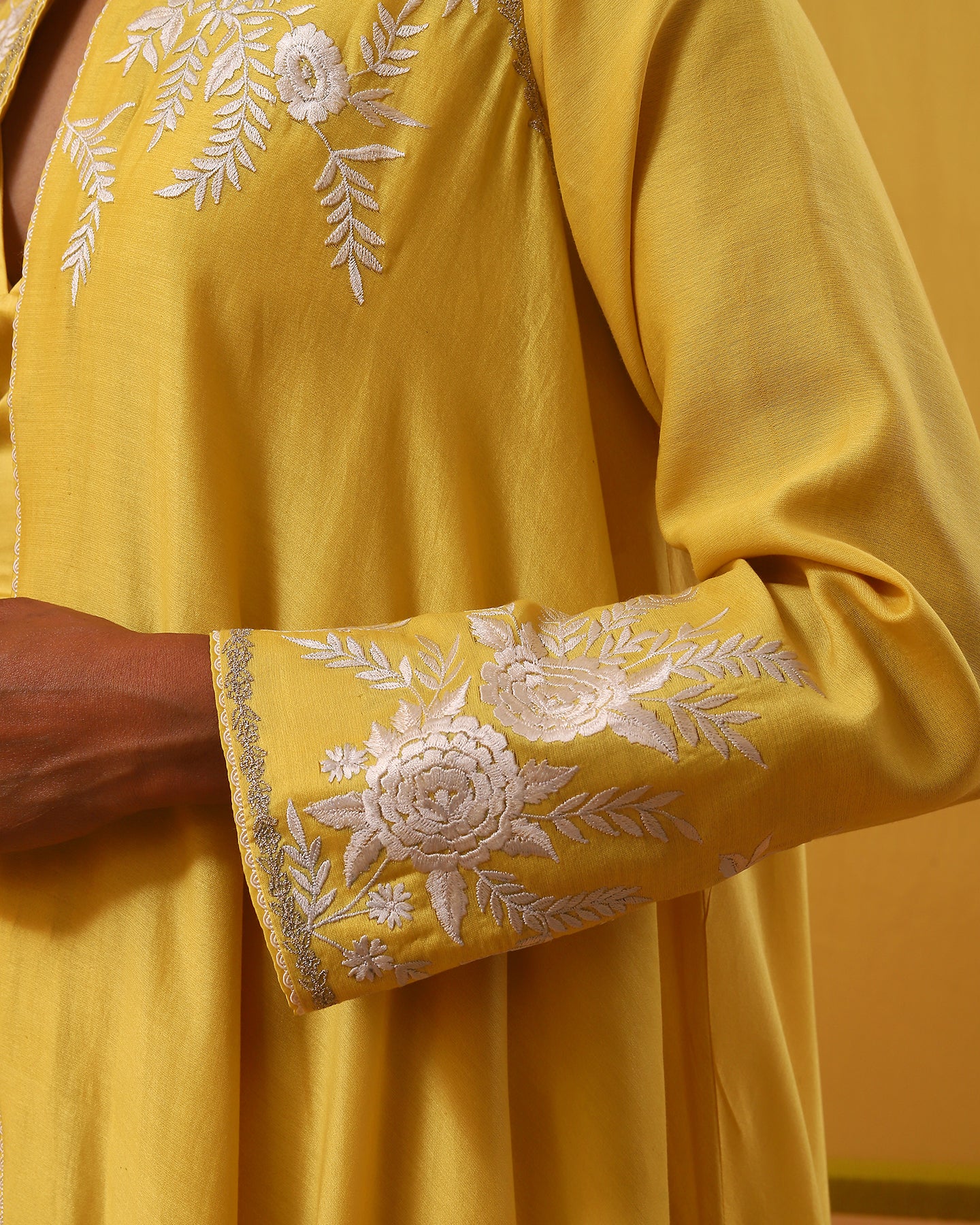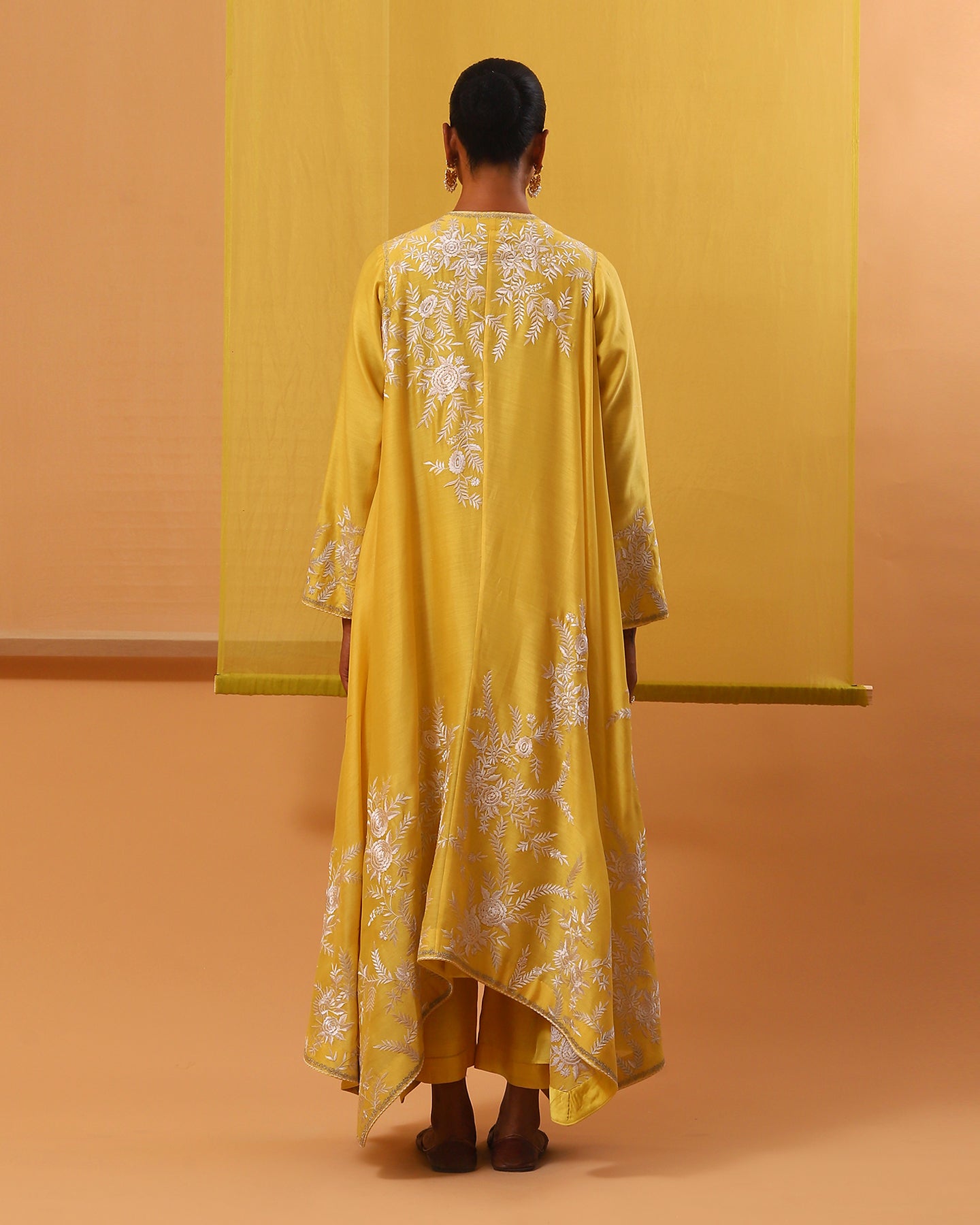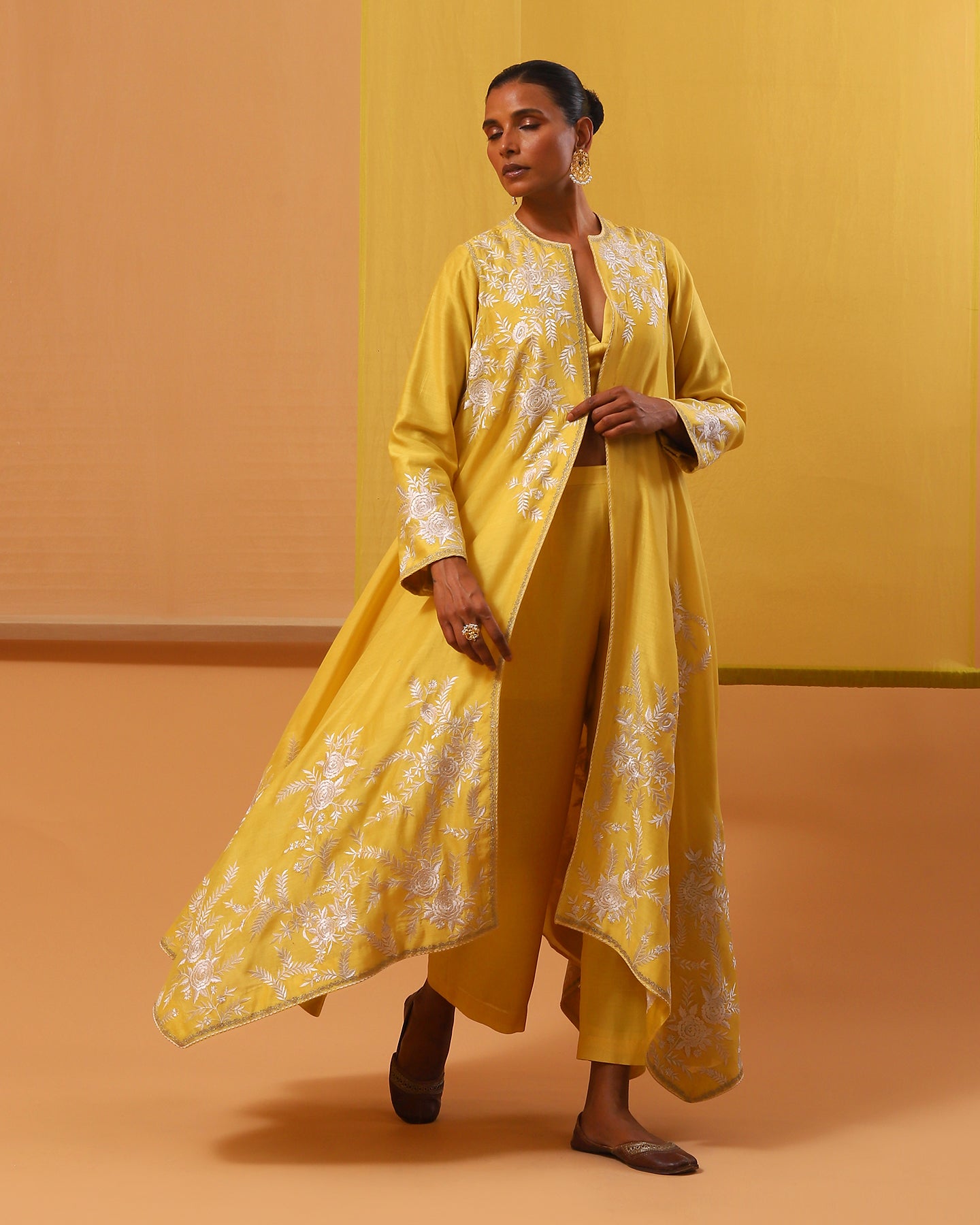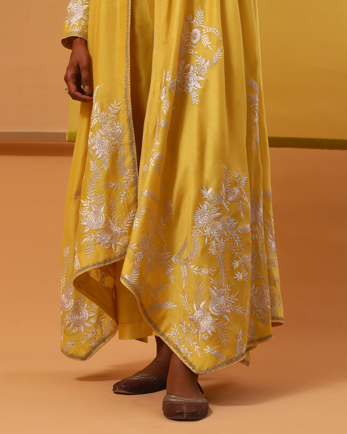Introducing our enchanting yellow handwoven silk chanderi jacket set, a masterpiece of allure and sophistication. The asymmetrical cape-style jacket opens in the front and has full sleeves. It is adorned with delicate off-white and beige gara embroidery, intertwining silk threads to weave tales of elegance. Each hemline is kissed by silver zari work, casting a spell of opulence. Paired with matching luxurious handwoven silk chanderi straight-fit pants and a stylish pure silk satin bustier. This ensemble is a symphony of romance and timeless beauty, perfect for those who wish to dance through life in exquisite style.