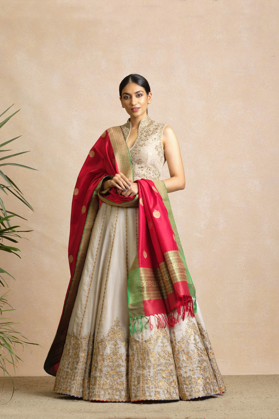 This set features beige embroidered lehenga and gold banarasi embroidered blouse enhanced with a separate red banarasi dupatta. The cost of the banarasi dupatta will be additional.