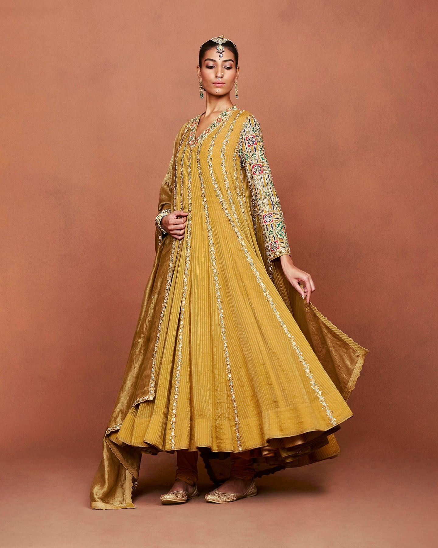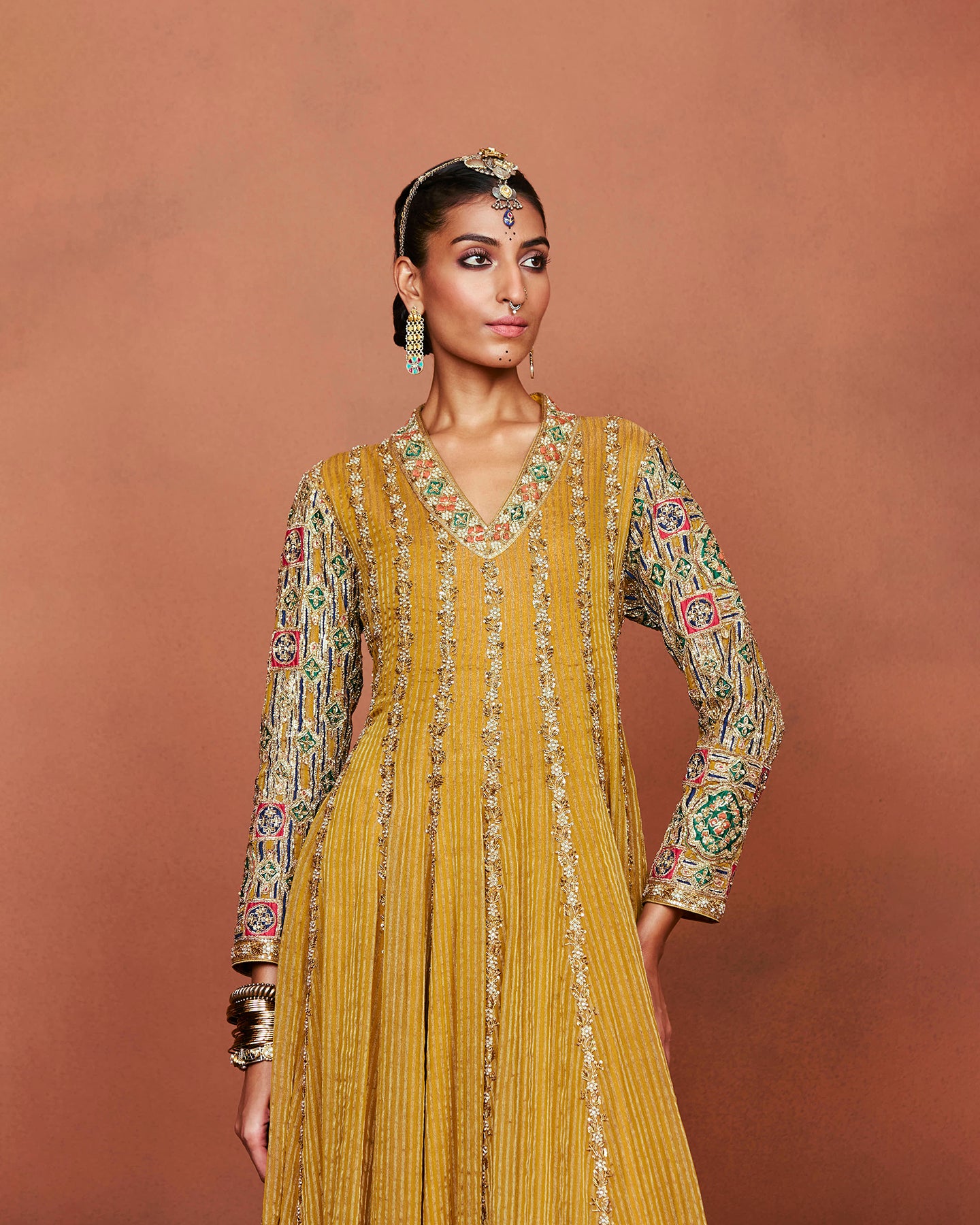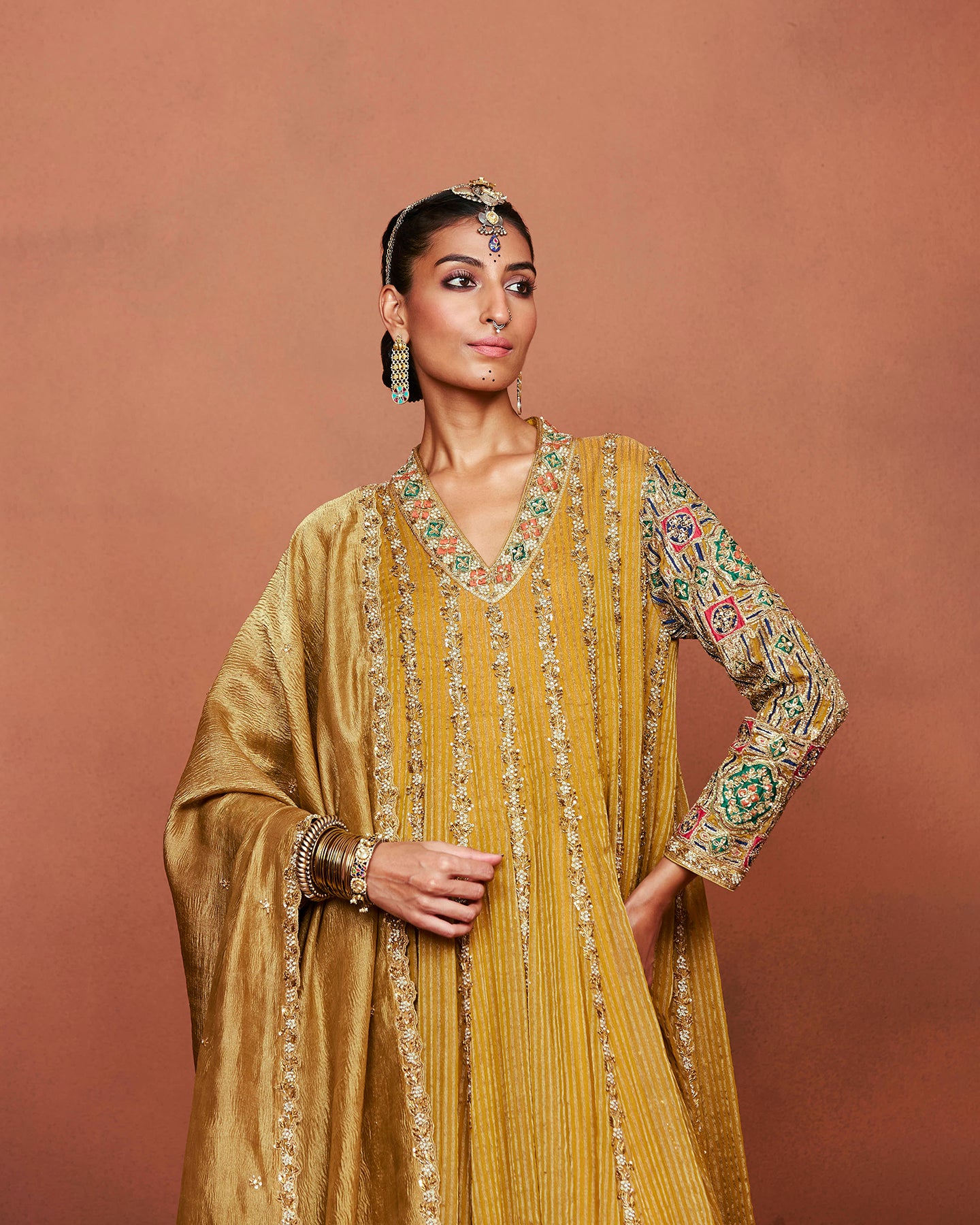 This mustard kalidar stripe georgette tissue long anarkali features a V-neckline and full sleeves. It comes with a pair of matching pure lycra crêpe churidhar and a gold crushed crêpe tissue dupatta. The set showcases a tribal inspired geometric and floral pattern. Embroidered using zardozi technique with multi-colour appliqué, pitta work, dabka, sequins, zari, silk threads, and pearls.