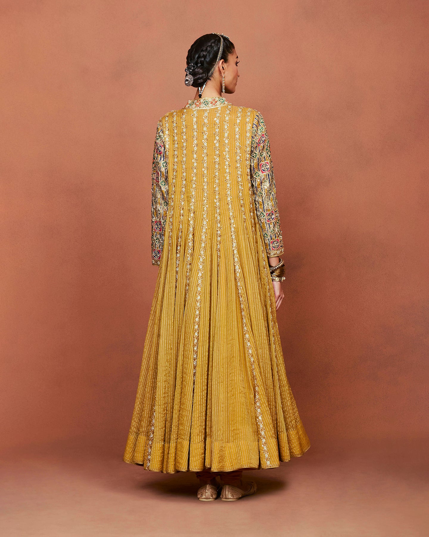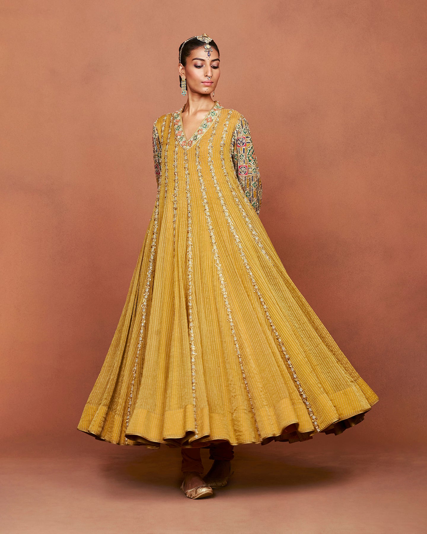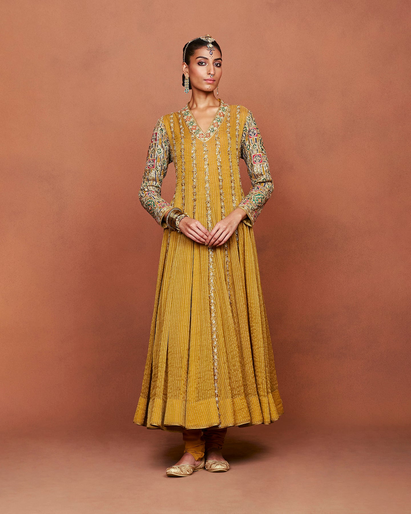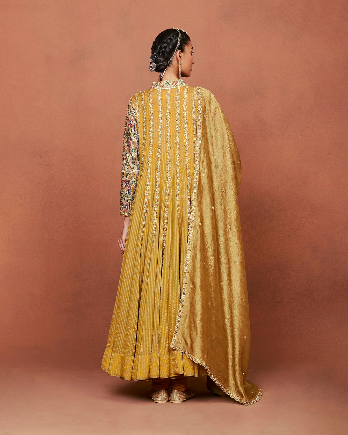 This mustard kalidar stripe georgette tissue long anarkali features a V-neckline and full sleeves. It comes with a pair of matching pure lycra crêpe churidhar and a gold crushed crêpe tissue dupatta. The set showcases a tribal inspired geometric and floral pattern. Embroidered using zardozi technique with multi-colour appliqué, pitta work, dabka, sequins, zari, silk threads, and pearls.