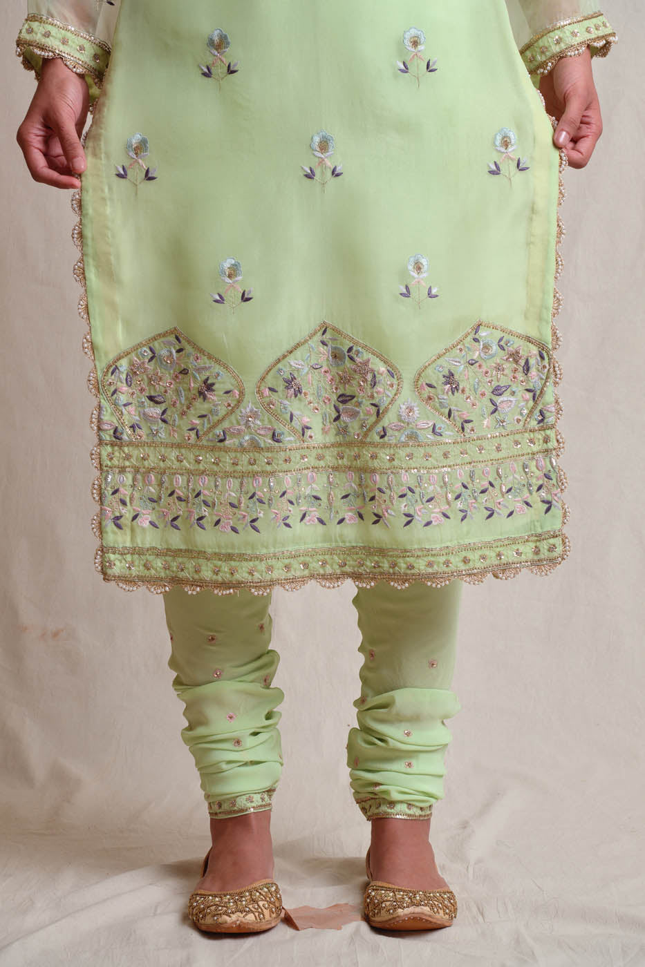 This set features a green straight kurta with a heavy embroidery on the hem, embroidered churidar and an embroidered geogrette dupatta.