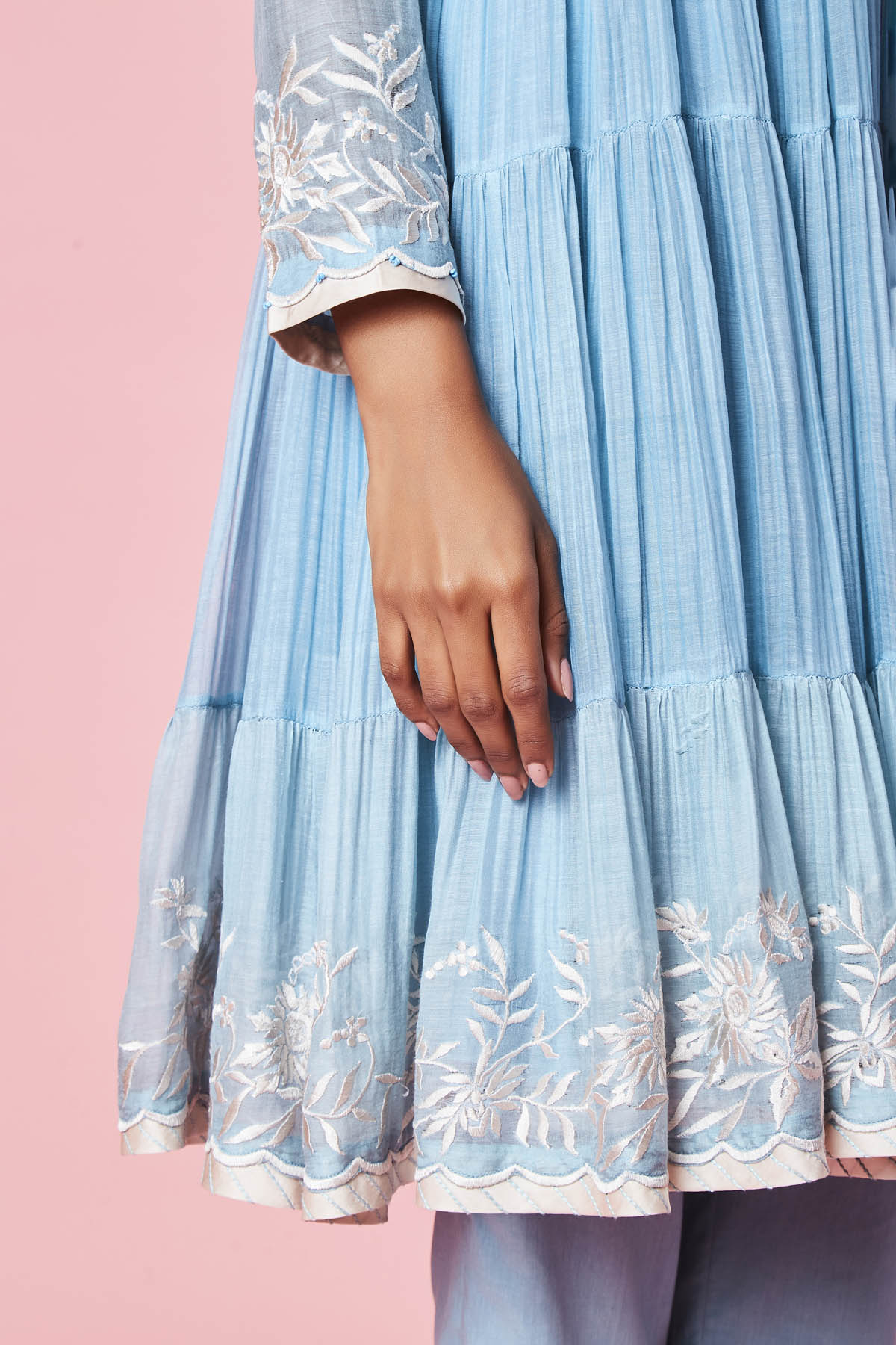 This blue mul short anarkali has embroidered multi-coloured Parsi motif and it comes with a pair of cotton trousers.