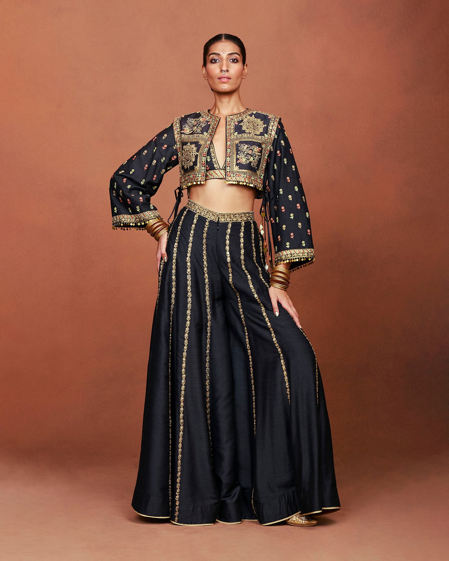 This is a black handwoven munga silk sharara. Paired with a matching bell sleeve blouse and a raw silk gilet. The set showcases a tribal inspired geometric and floral pattern. Embroidered using cotton thread and zari aari work, sequins, pitta work, beads, and antique gold coins.
