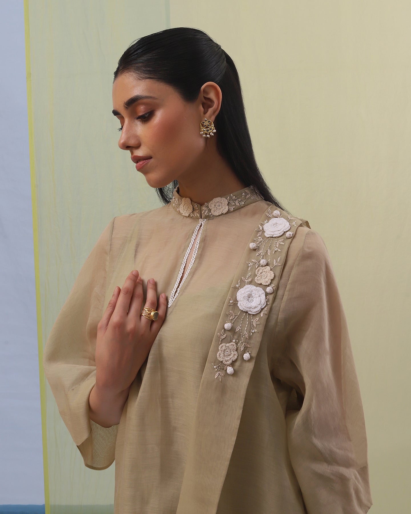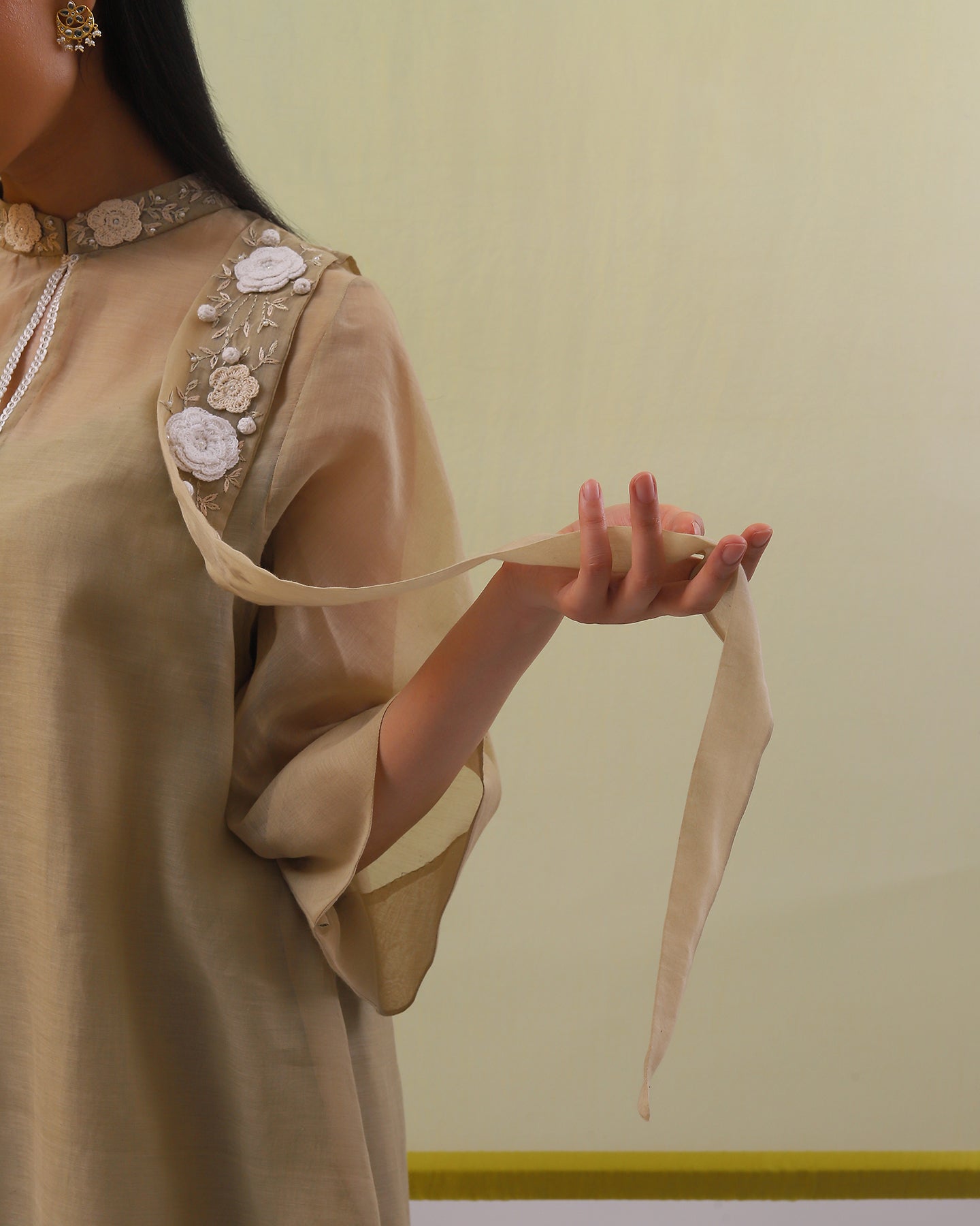 Step into the spotlight with our elegant beige handwoven chanderi mulmul co-ordinate set. The A-line top boasts of bell sleeves, stand collar, and a long fabric band attached on the left shoulder. It is exquisitely adorned with off-white and beige cotton thread embroidered 3D flowers, making it a masterpiece of grace. Paired with straight-fit pants, this ensemble exudes sophistication, promising to leave a lasting impression at any special occasion.