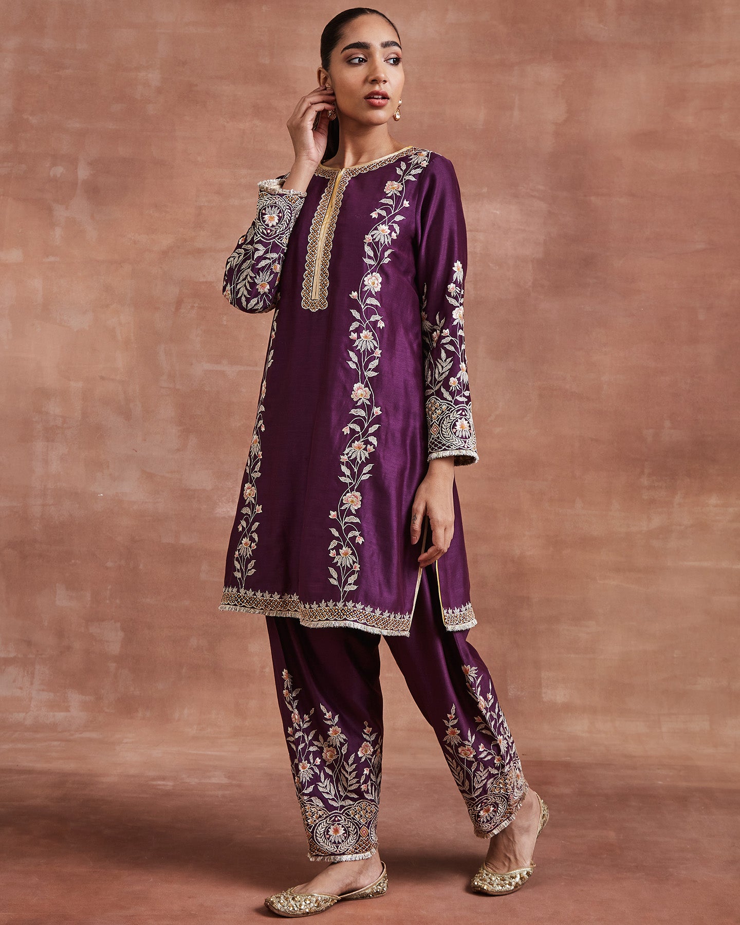 Experience regal charm with our Purple Chanderi Suit Set, the kurta is adorned with gold zari, silk thread embroidery, and finished elegantly with an old gold kiran. Completing the look is a pair of matching chanderi salwar and a stunning purple hand-woven cotton chanderi silk dupatta with scallops and a zari border.