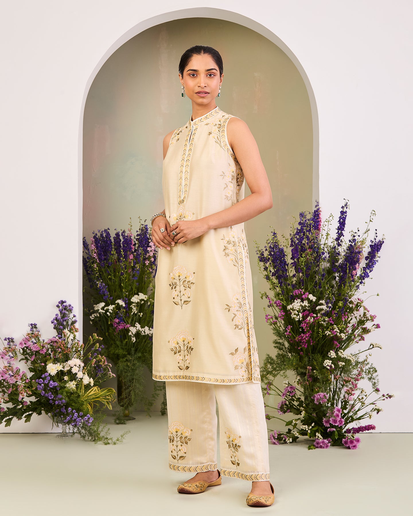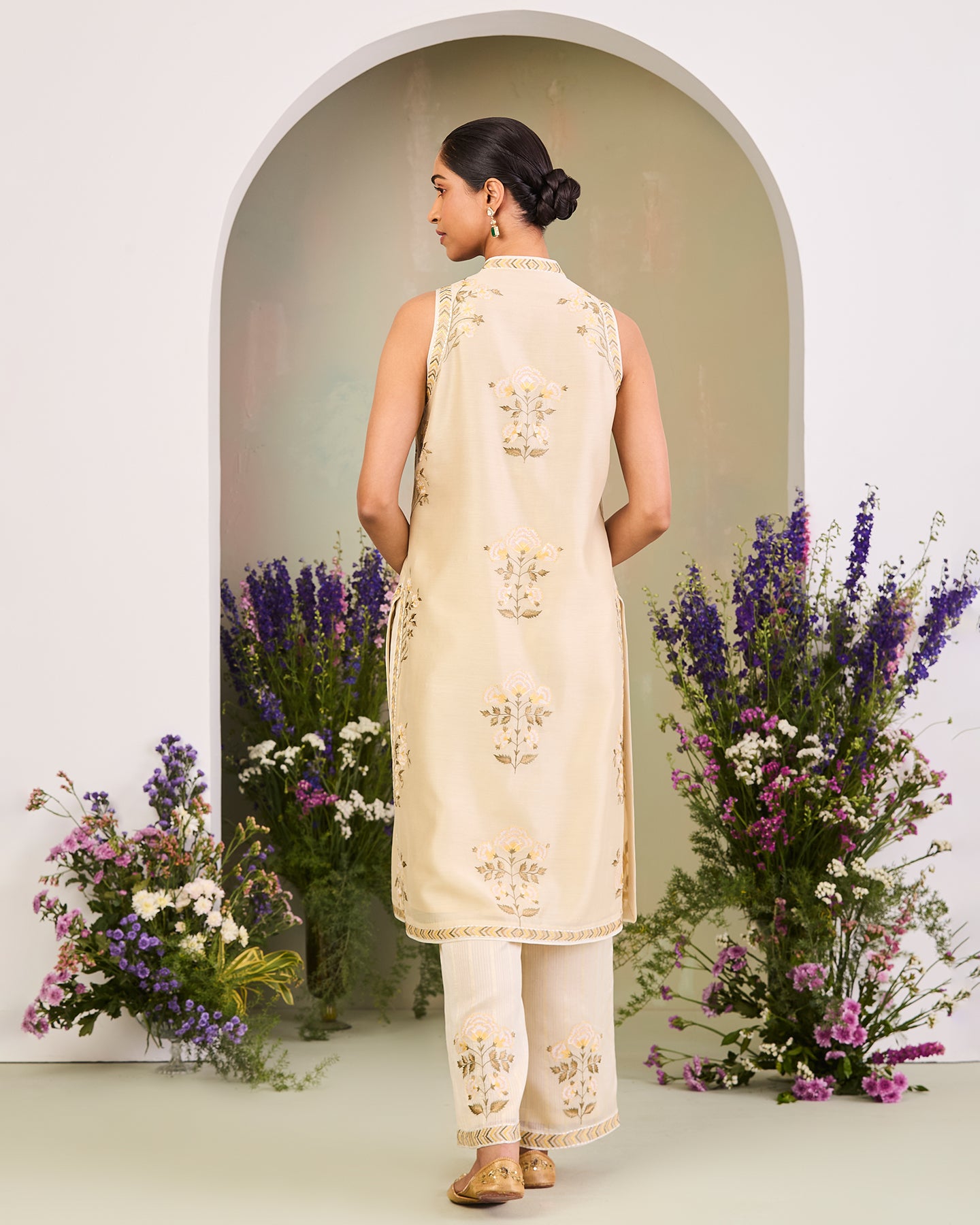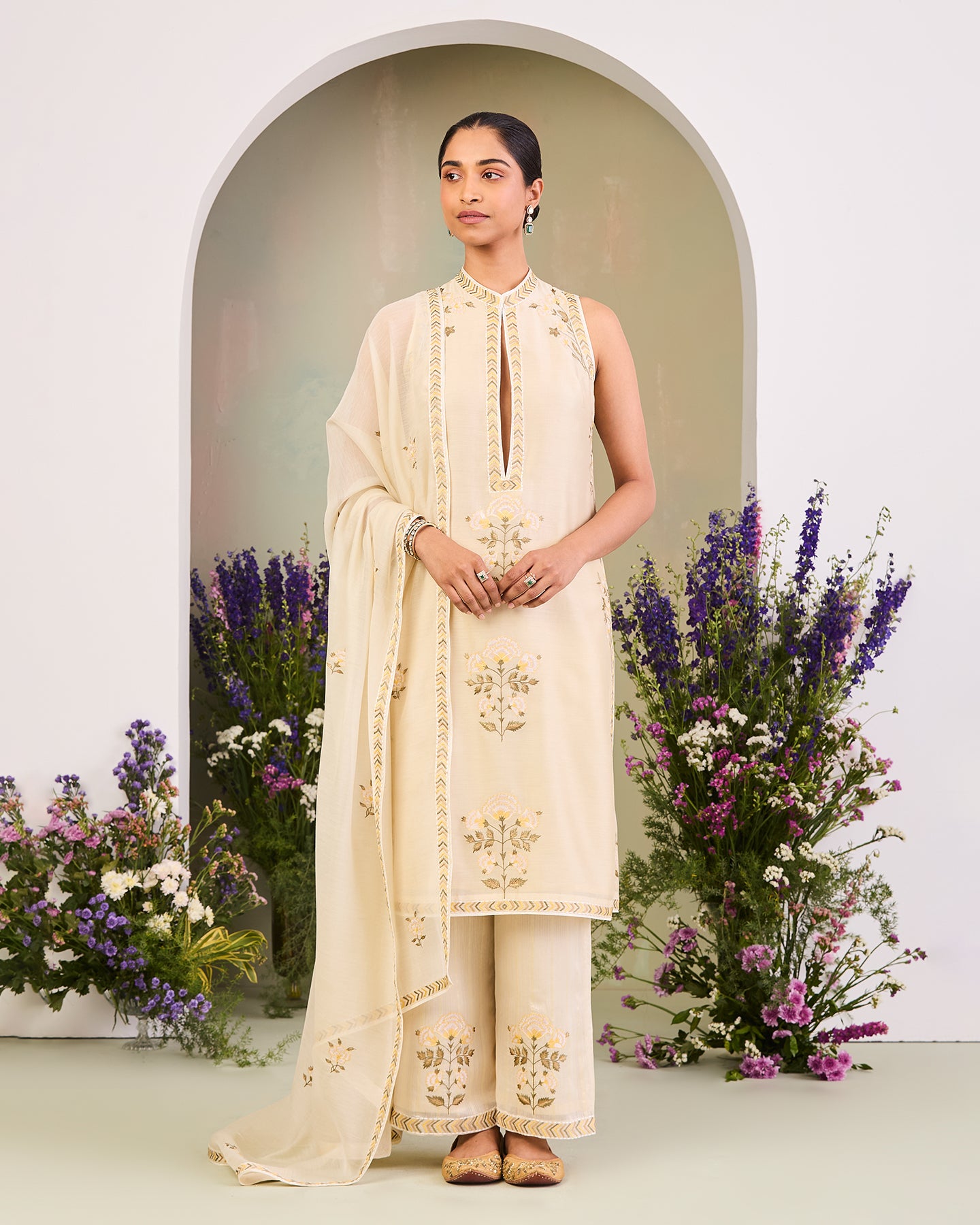 This is a light yellow handwoven silk chanderi sleeveless kurta with a mandarin collar and a deep slit. It comes with a pair of matching handwoven silk chanderi satin striped straight-fit pants, and a handwoven chanderi mulmul dupatta. The ensemble is adorned with multi-coloured silk thread embroidered floral motifs and finished with a contrast piping.