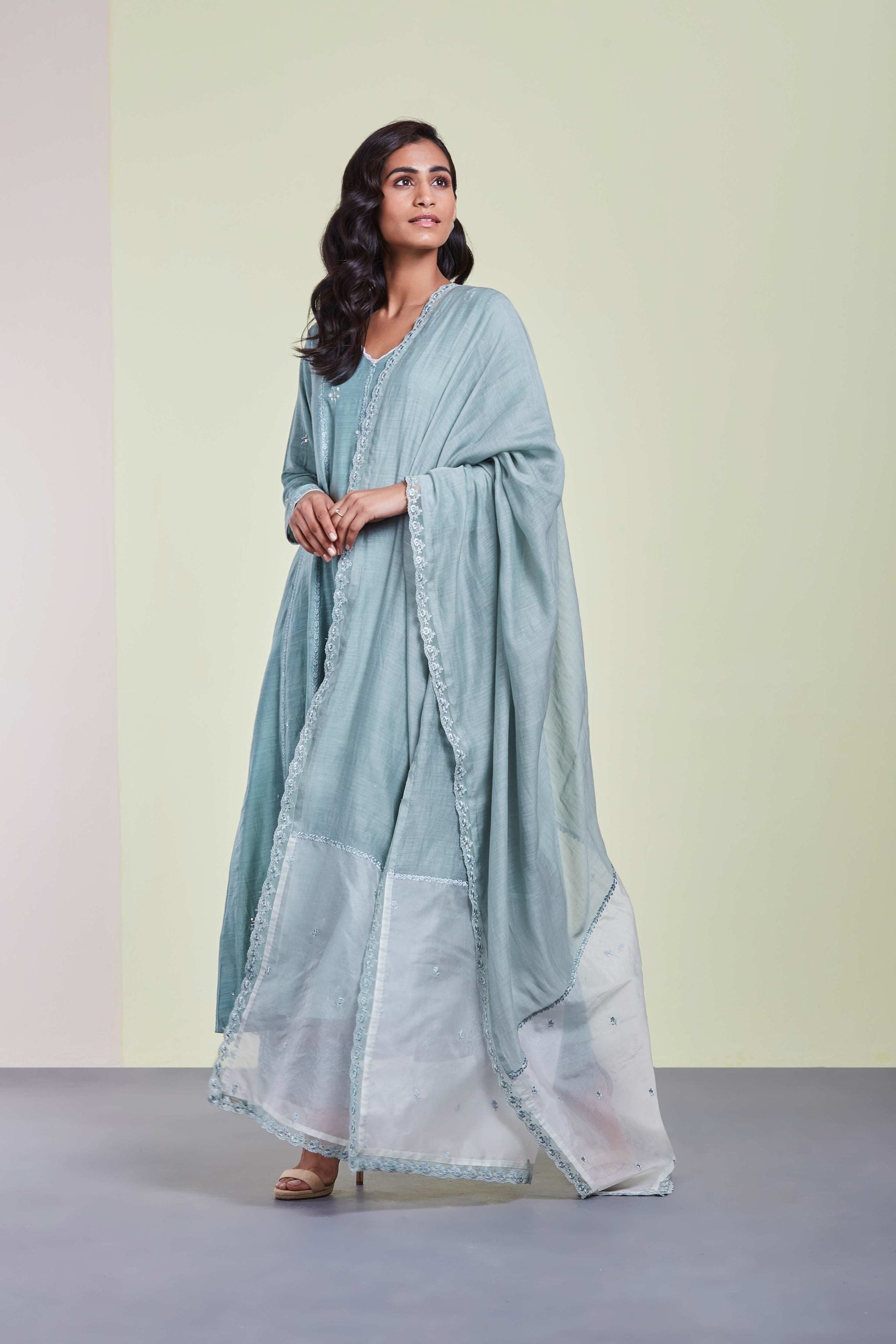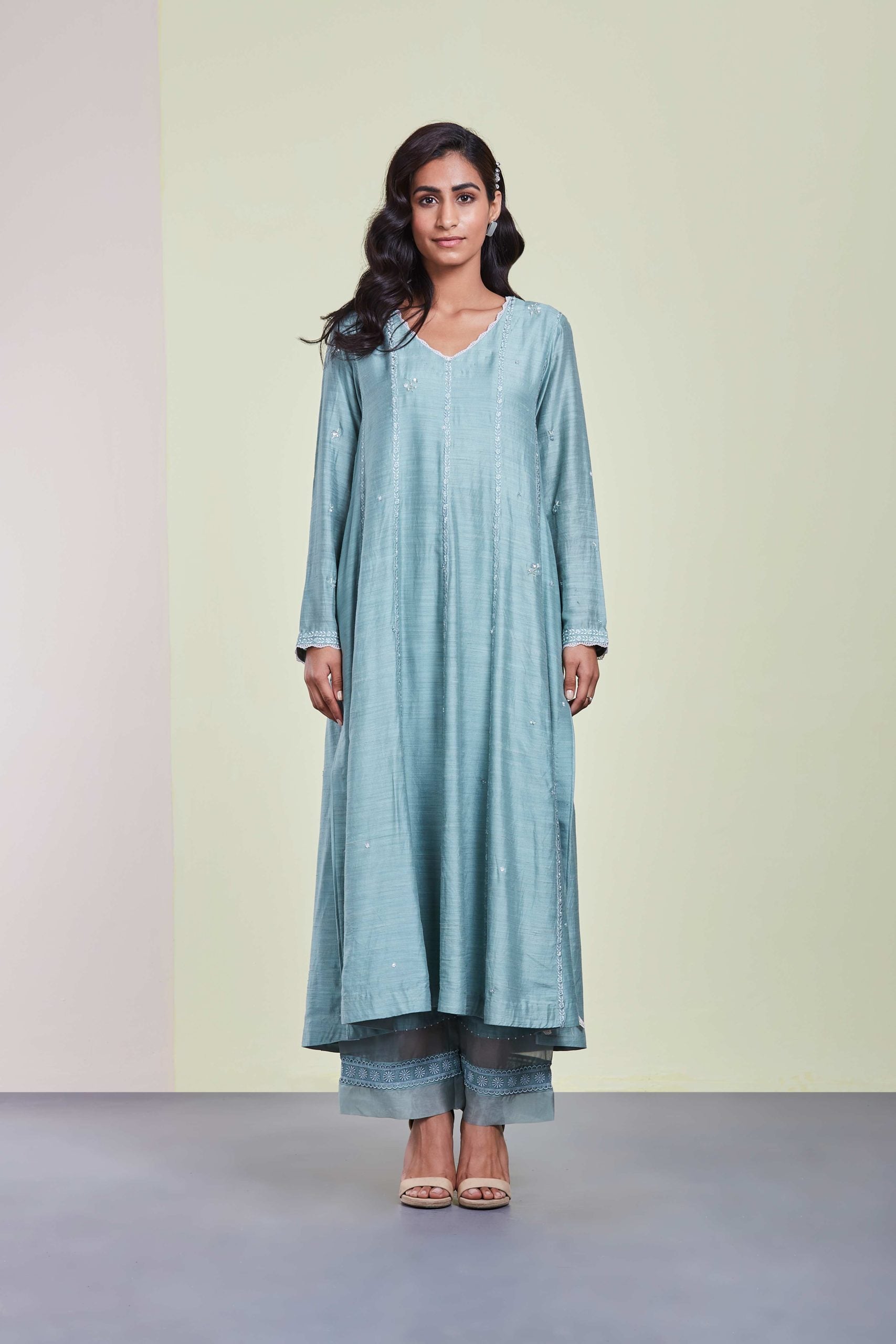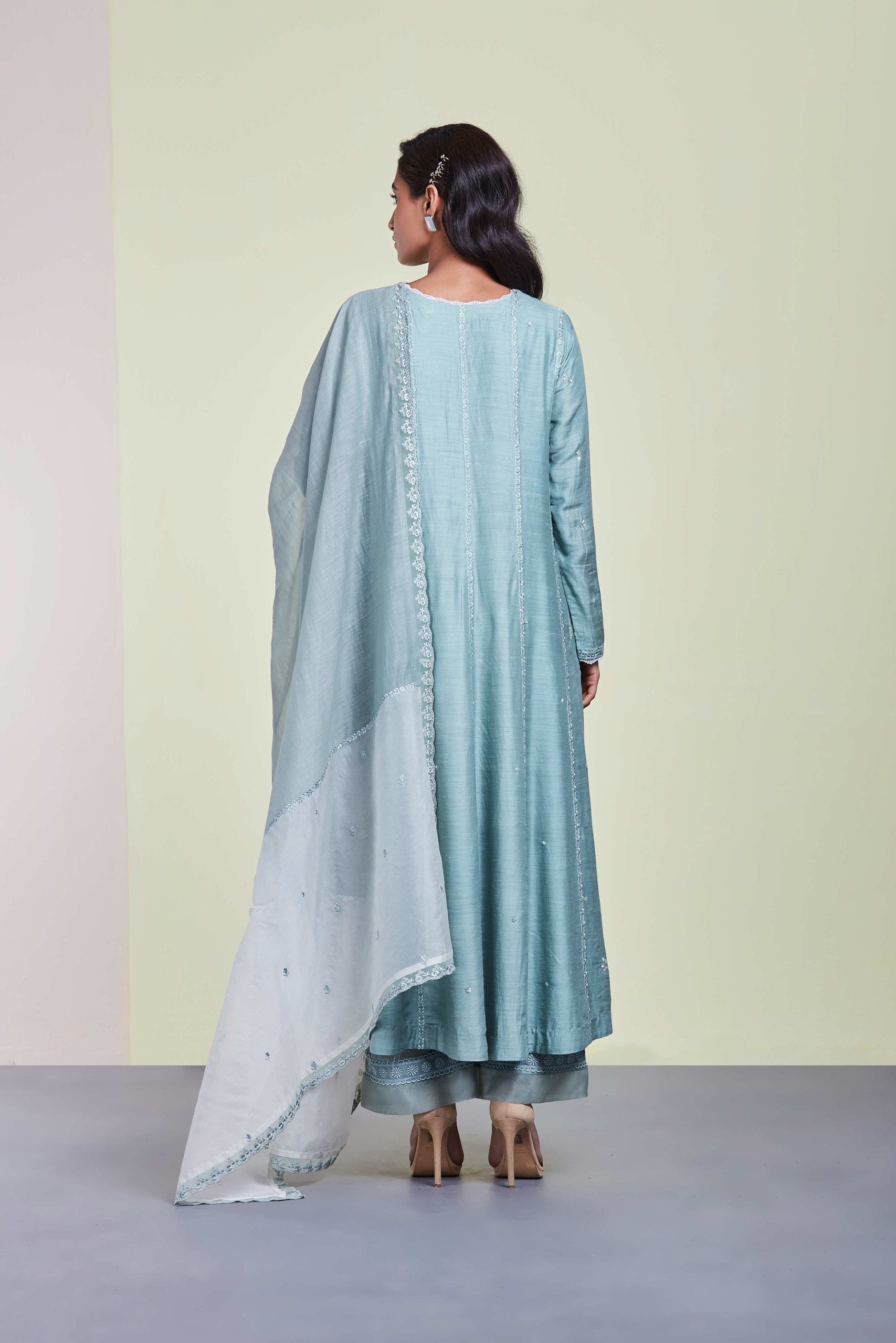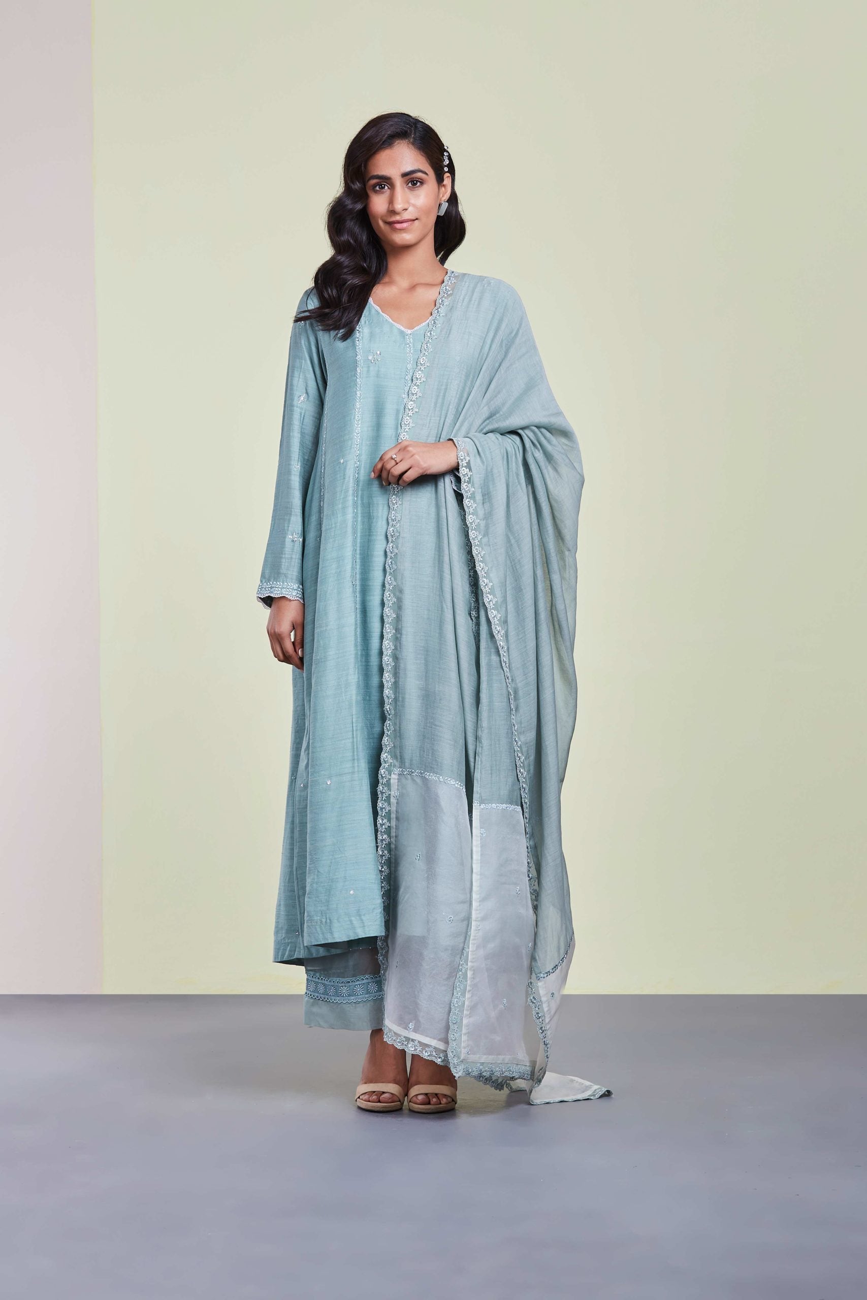 This set features blue surf tussar embroidered kurta and a pair of blue surf palazzo pants. It comes along with an embroidered blue surf and ivory dupatta.