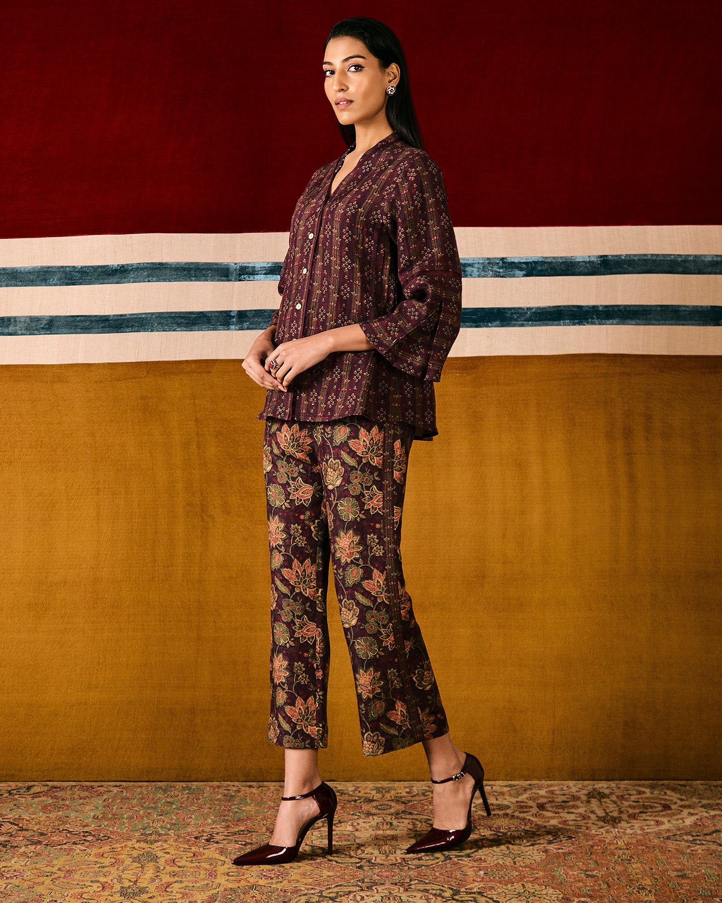This wine colour pure linen co-ordinate set features an exclusive in-house chintz print. The front-open shirt has a V-neckline with a Chinese collar, pintucks, and box pleated three-quarter sleeves. It is paired with straight-fit pants with pockets. The set is finished with silk organza piping, and enhanced with threads and beads.