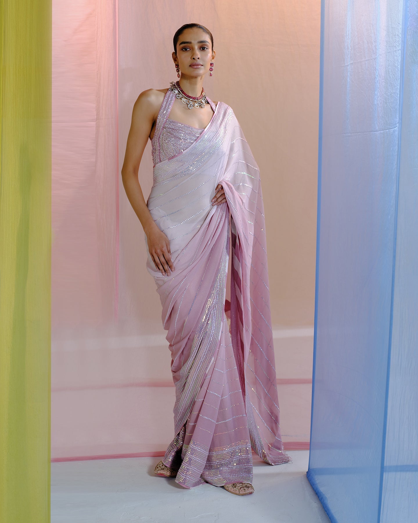 Drape yourself in elegance with our pure shimmer georgette saree in ombre soft pink. Adorned with intricately hand embroidered tonal sequins, this saree exudes sophistication. Enhanced by double-colour blocked pure silk satin piping, and Swarovski crystal tassels for added charm, it's a masterpiece of refined beauty. Complete your look with our stylish halter neck blouse in matching pure raw silk, featuring delicate sequins, pearls, and beads embroidery, for a truly enchanting ensemble.