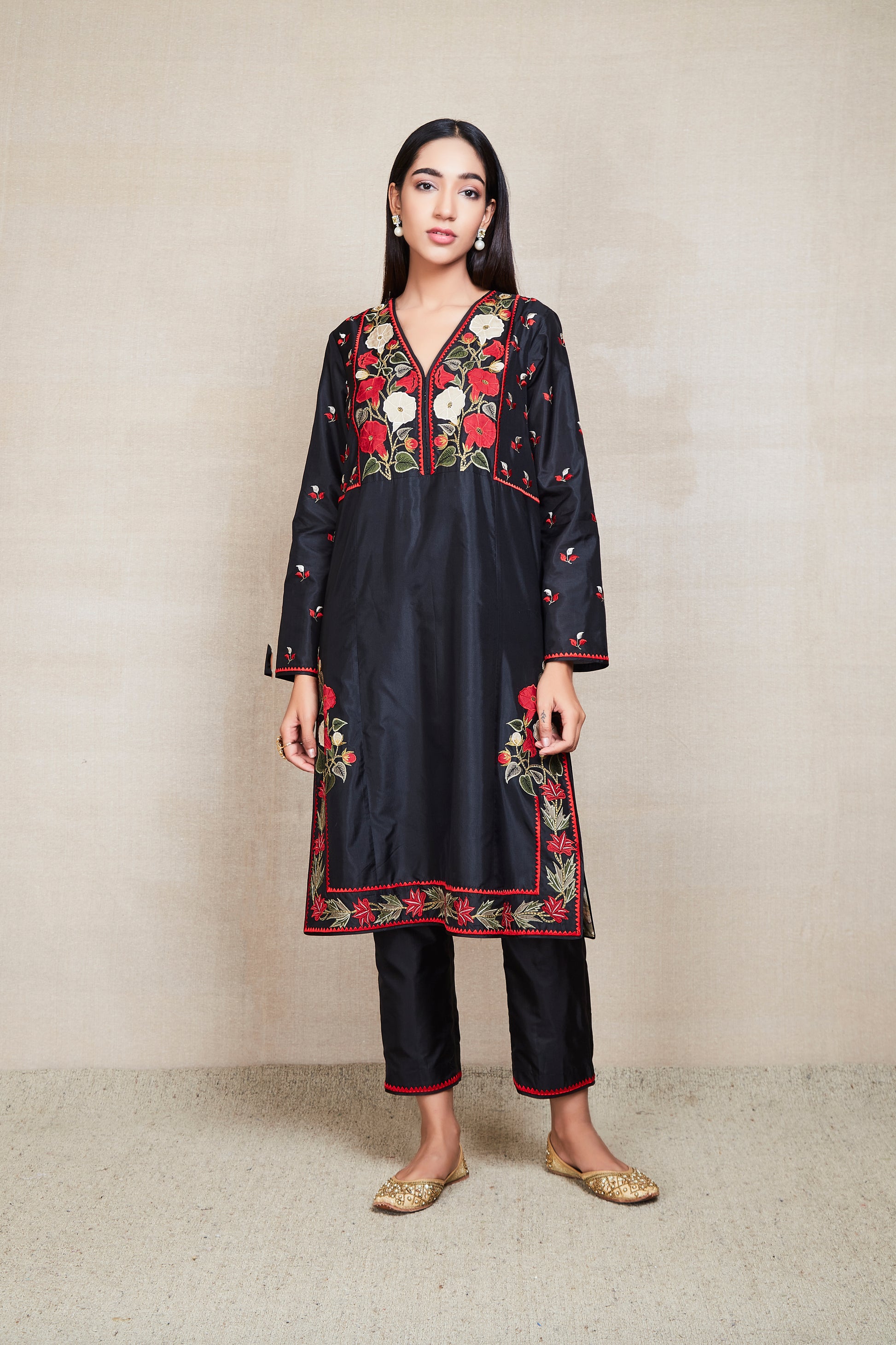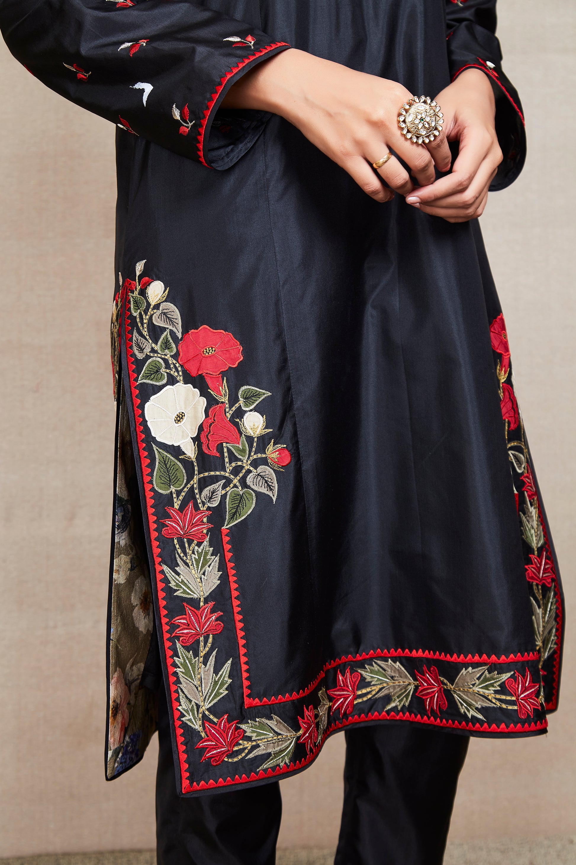 This is a black silk kurta enhanced with floral appliqué work motifs. It comes with a pair of matching silk pants and a black georgette dupatta.