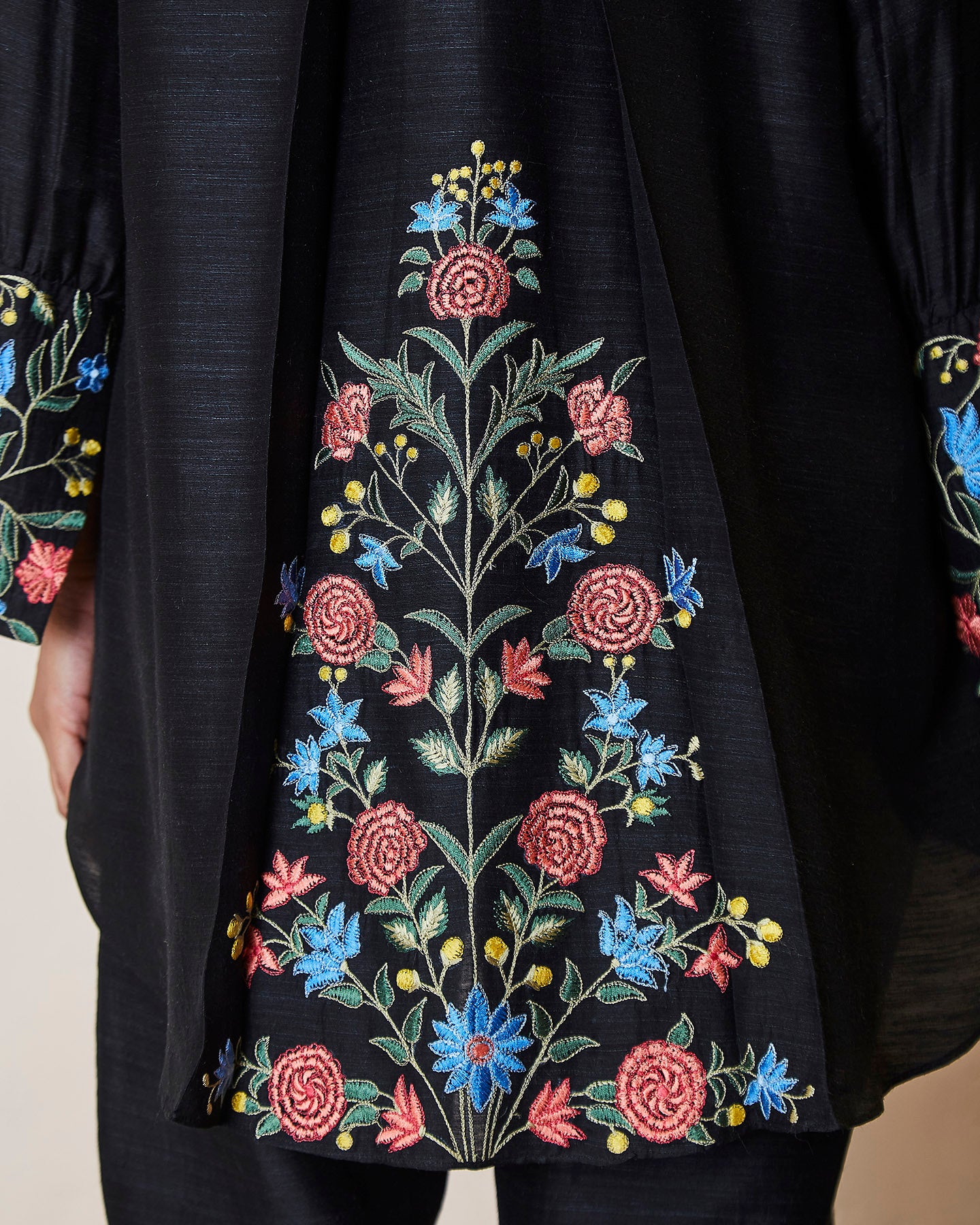 A black co-ordinate set comprising of a shirt and a pair of pants. Adorned with beautifully embroidered silk floral bootis.