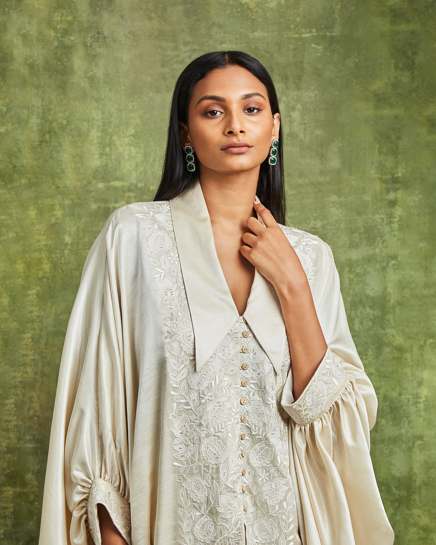 Introducing our stunning Off-White Silk Satin Asymmetrical Coordinate Set, designed to turn heads. The intricate tonal thread work adds a touch of sophistication and elevates the overall look. Crafted with care, this ensemble exudes elegance and modernity. Make a fashion statement with this exquisite silk satin co-ord set, perfect for any special occasion.