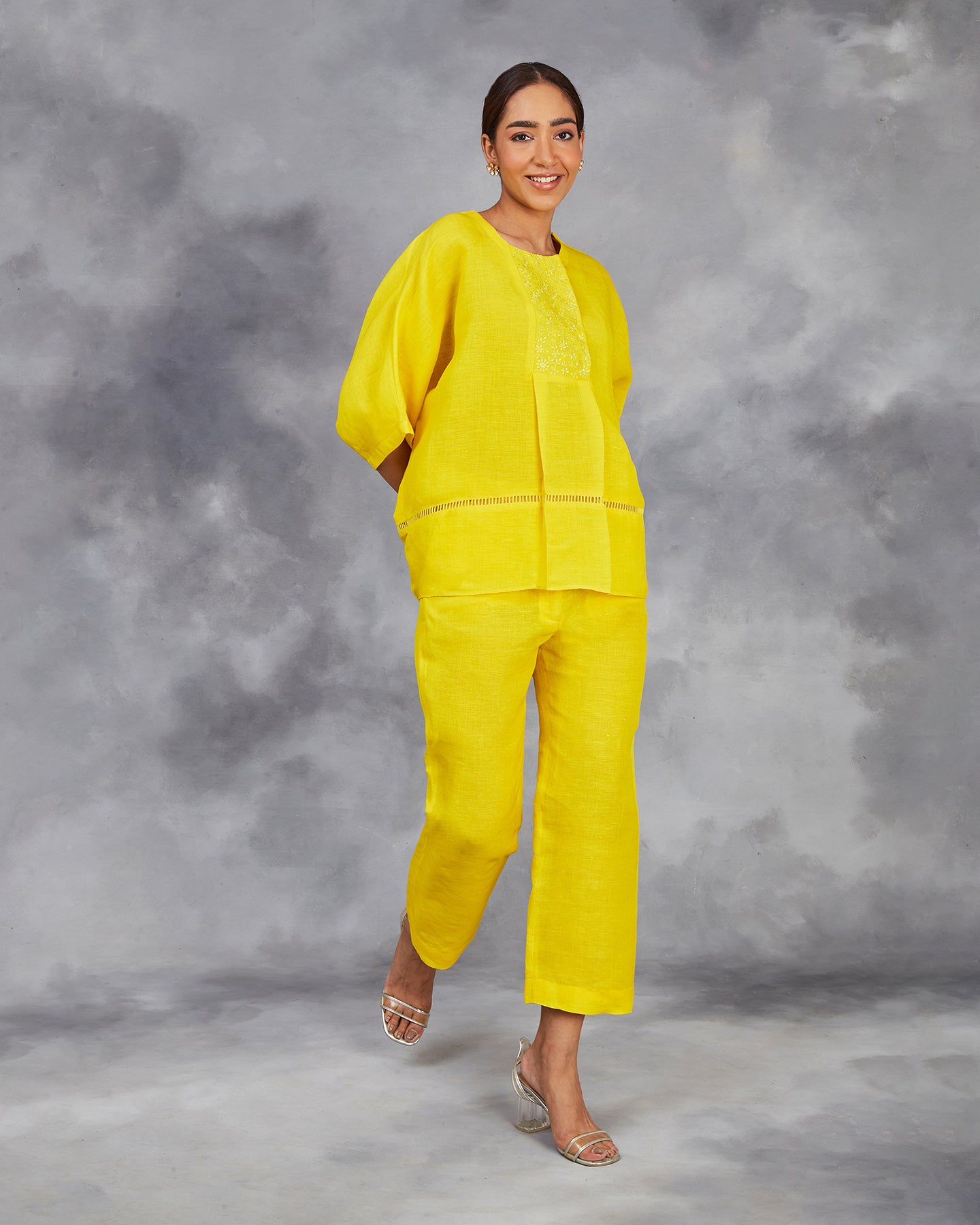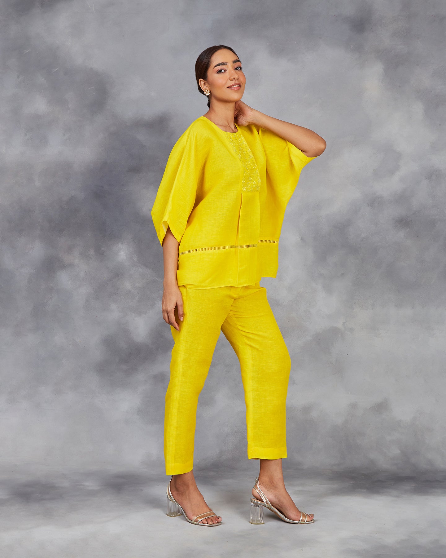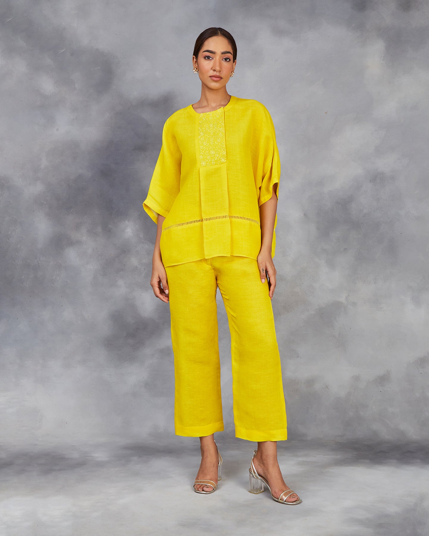 A radiant yellow pure linen co-ordinate set. The top features a touch neck and kimono sleeves. It is adorned with tonal silk thread embroidery and delicate beading. Paired with matching straight fit pants. This set beautifully blends vibrant style with elegant embellishments.