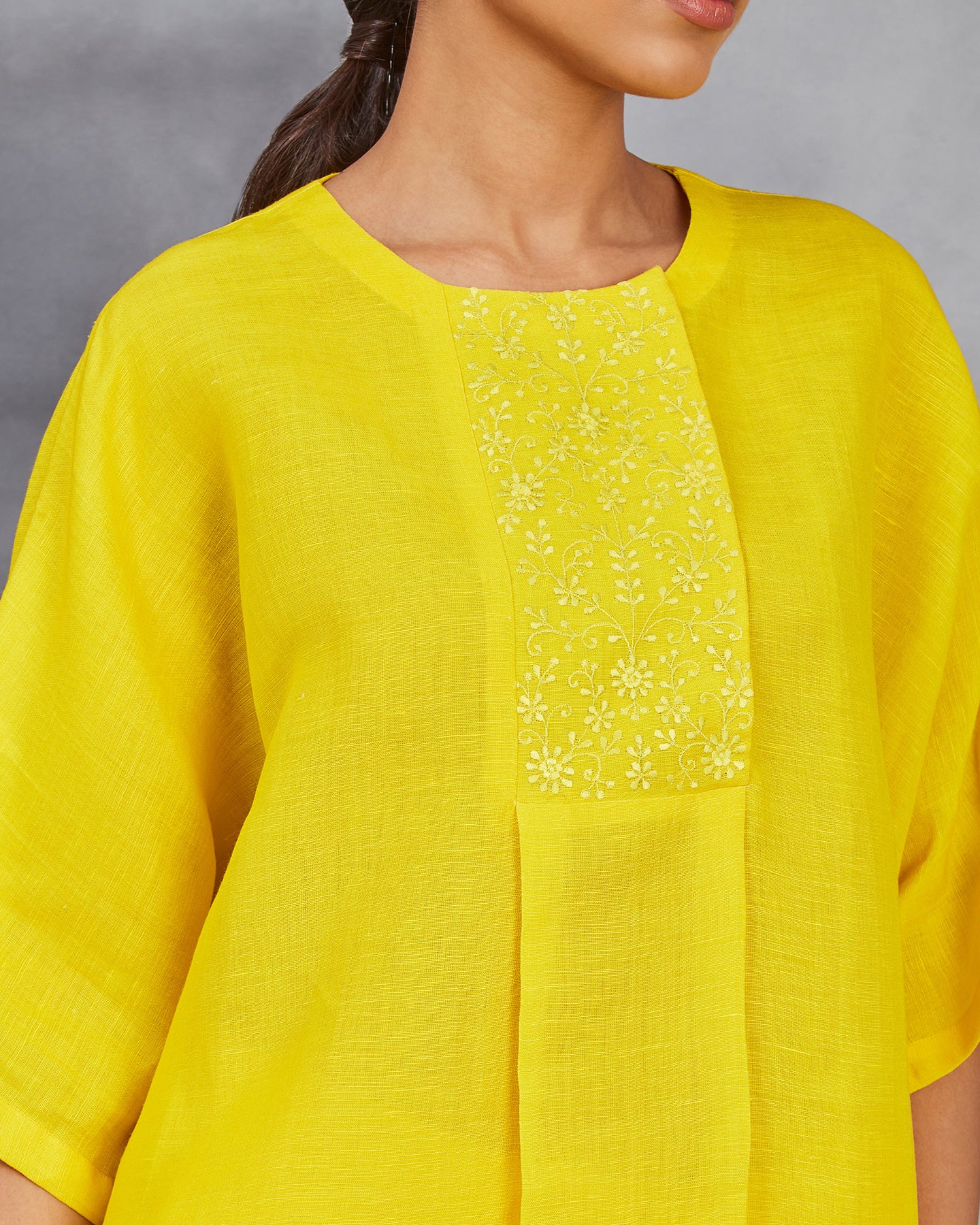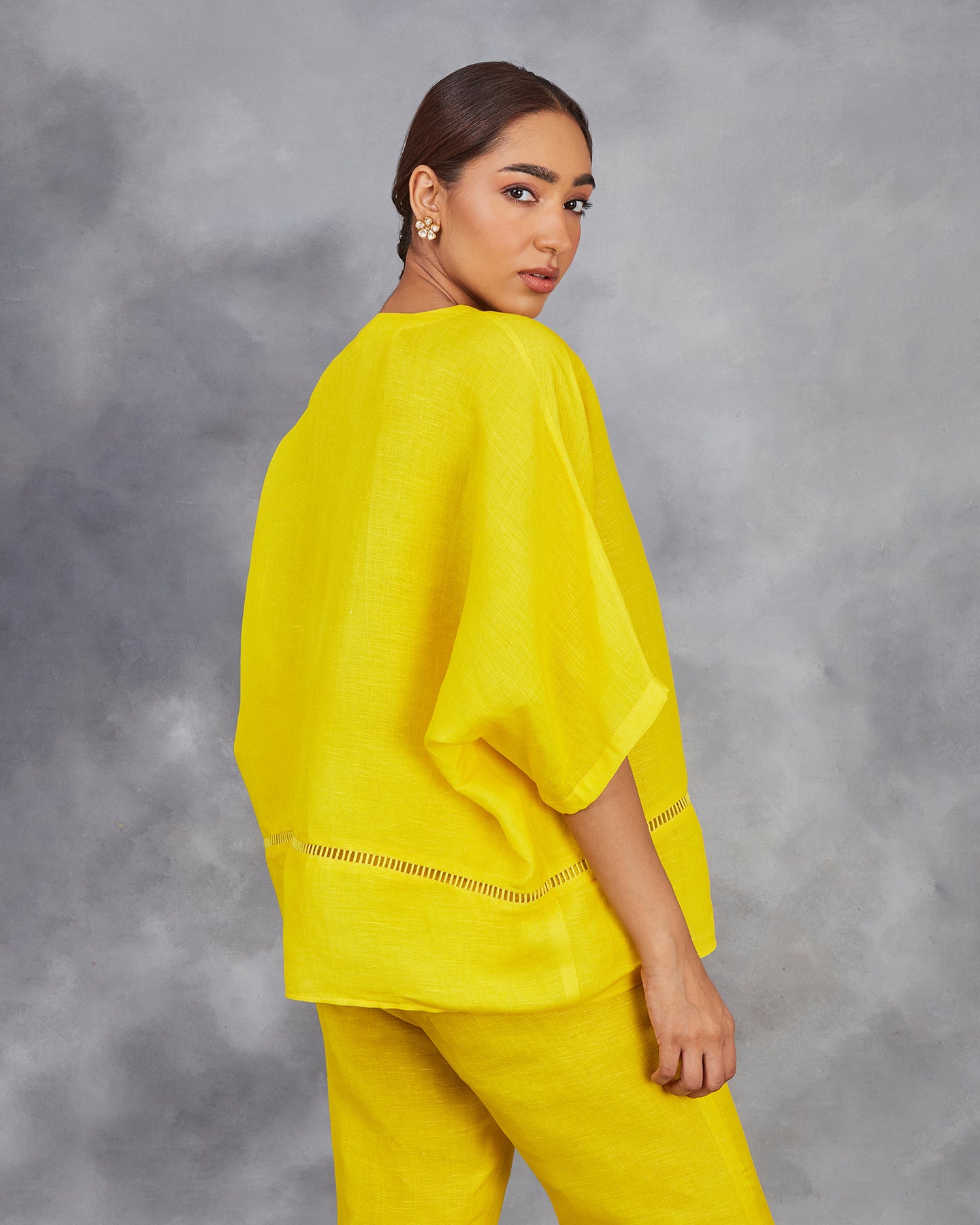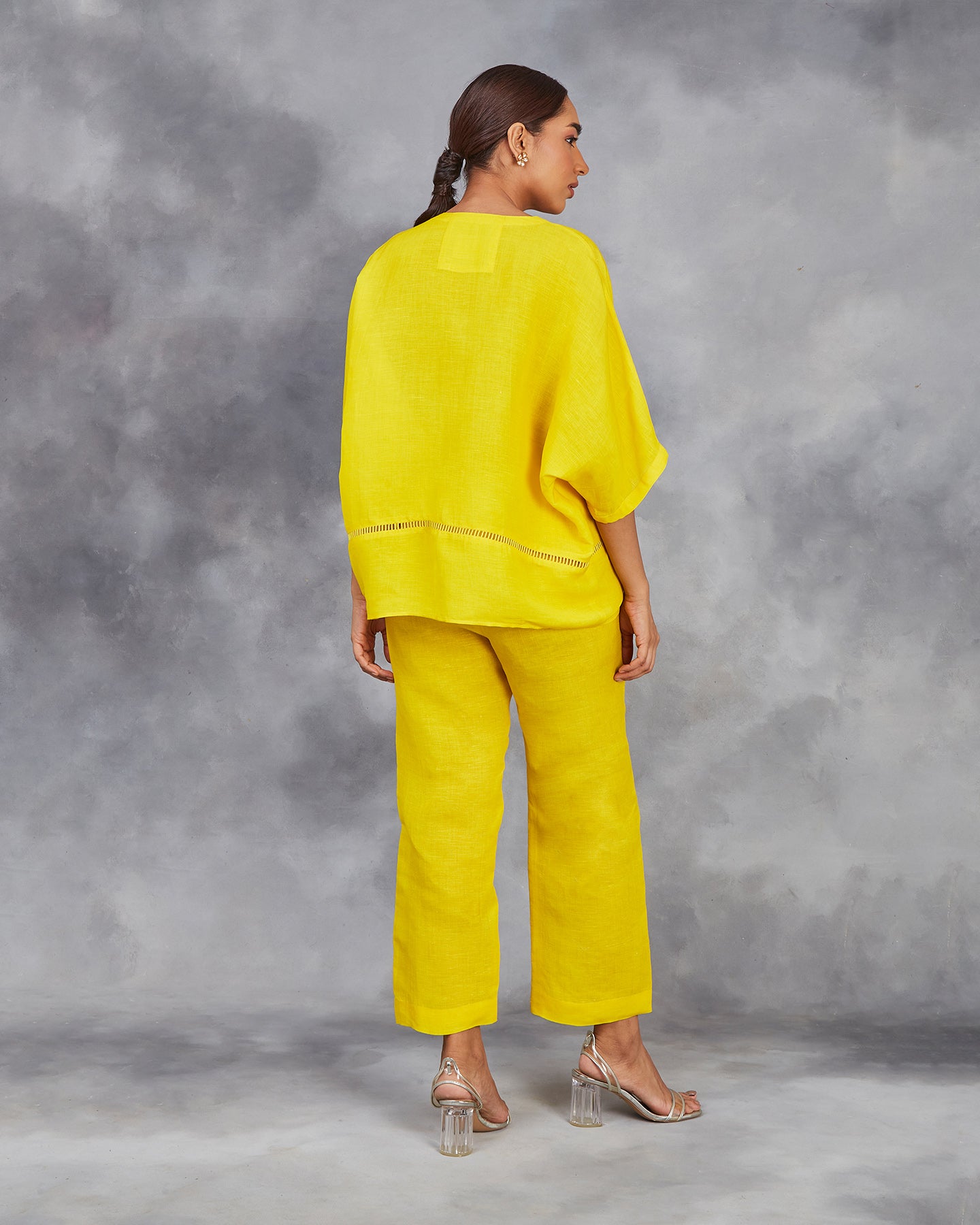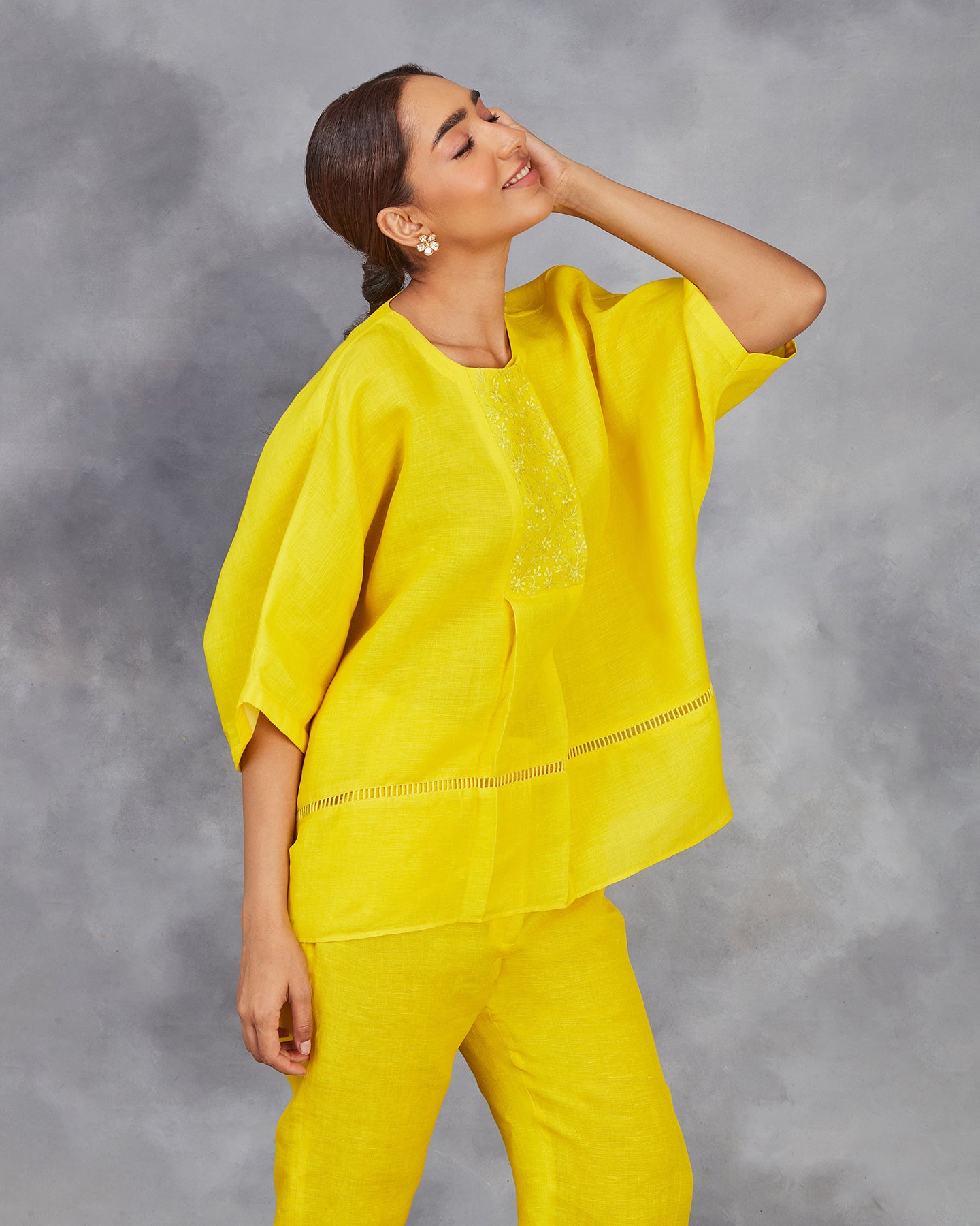 A radiant yellow pure linen co-ordinate set. The top features a touch neck and kimono sleeves. It is adorned with tonal silk thread embroidery and delicate beading. Paired with matching straight fit pants. This set beautifully blends vibrant style with elegant embellishments.