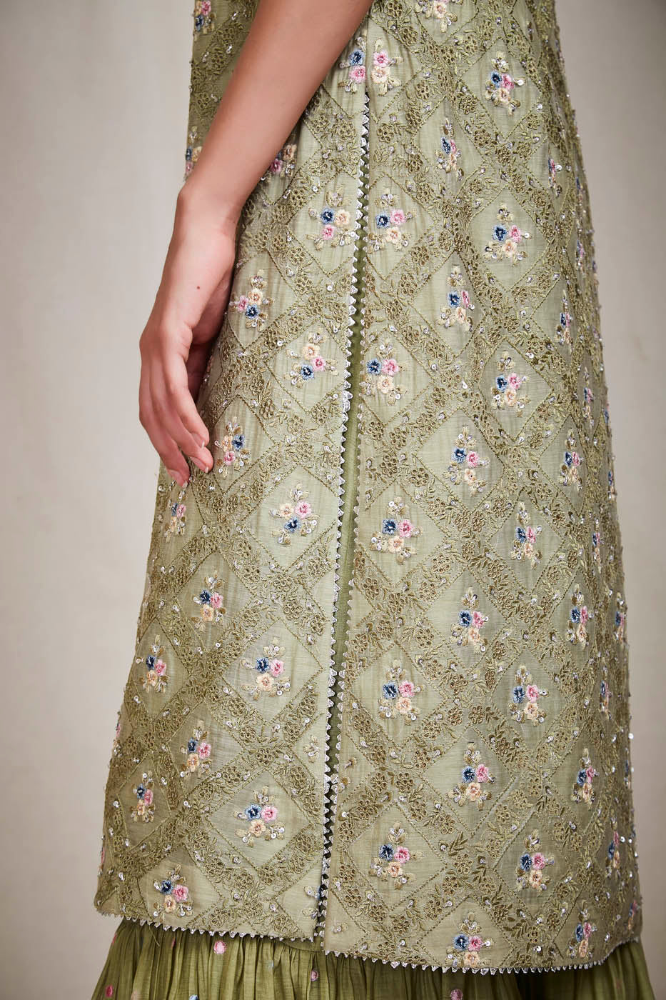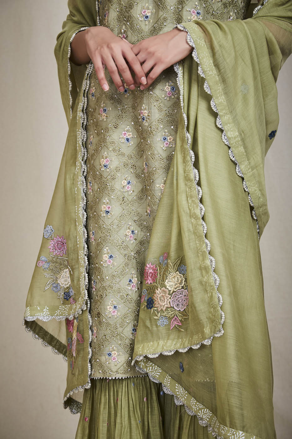 This set features an olive colour mul kurta enhanced with embroidered floral motifs, a pair of palazzo pants and a mul dupatta.
