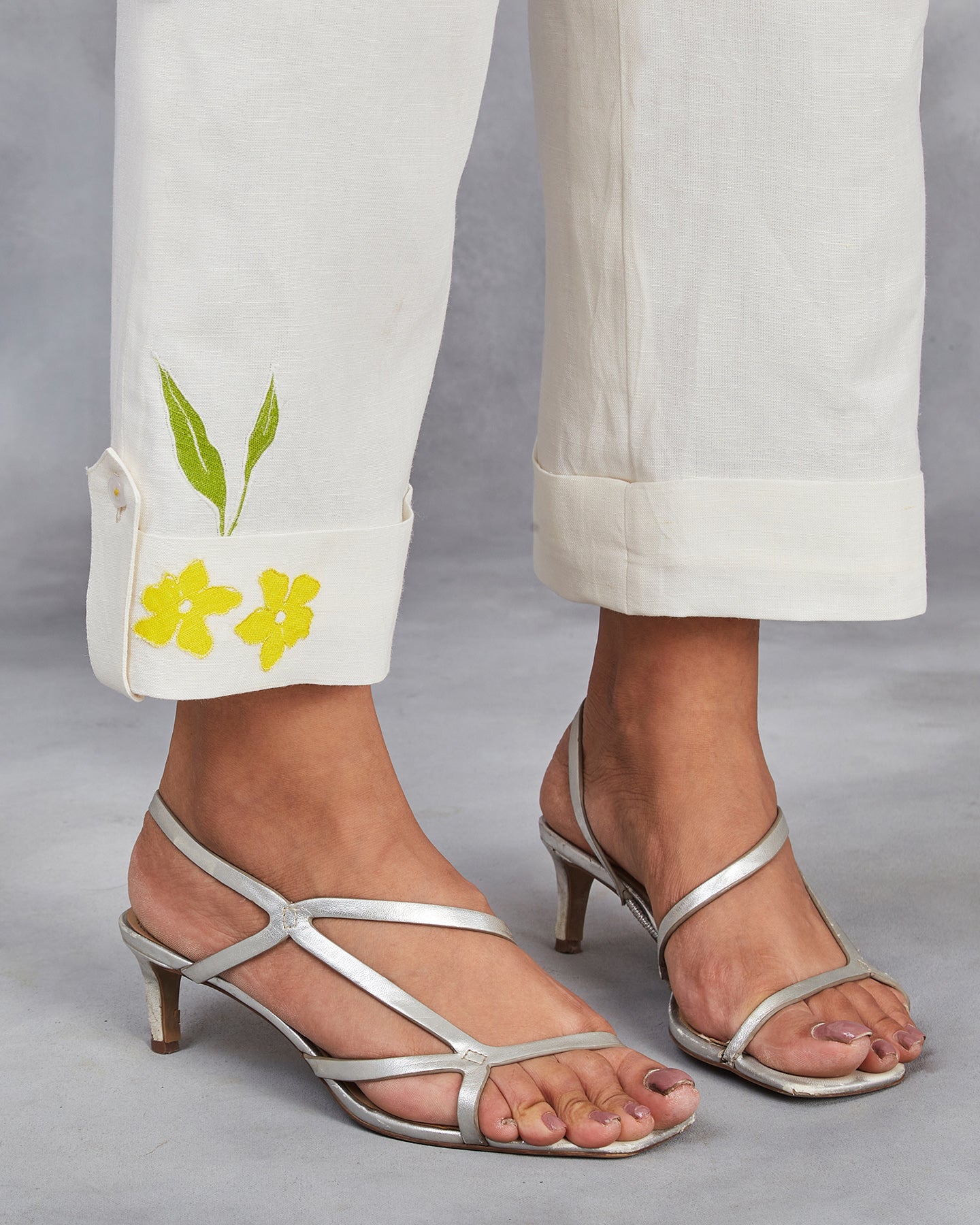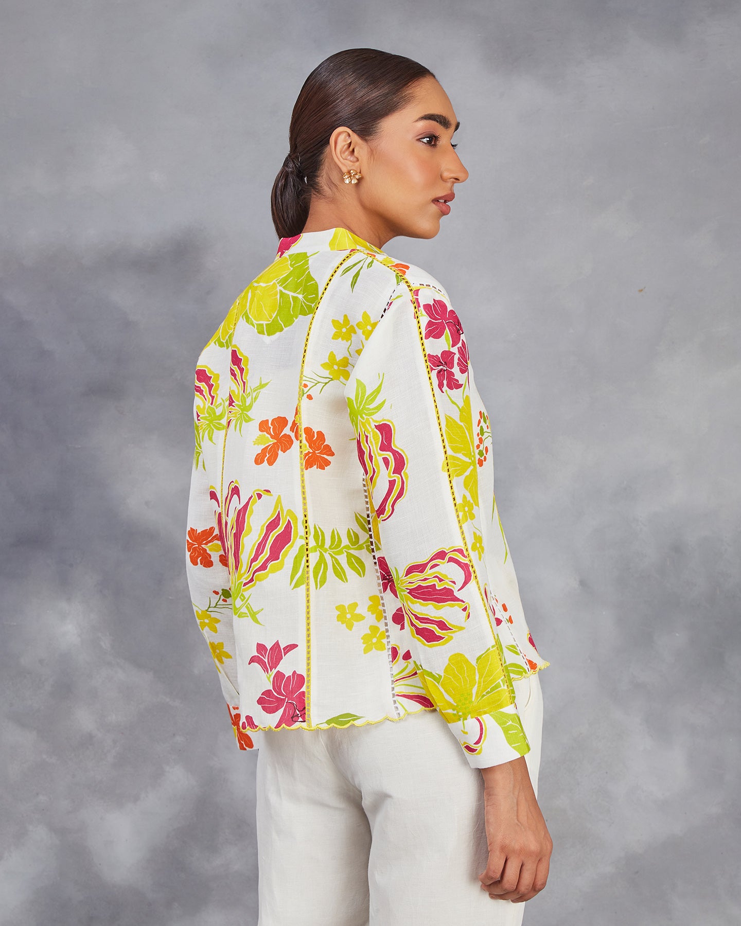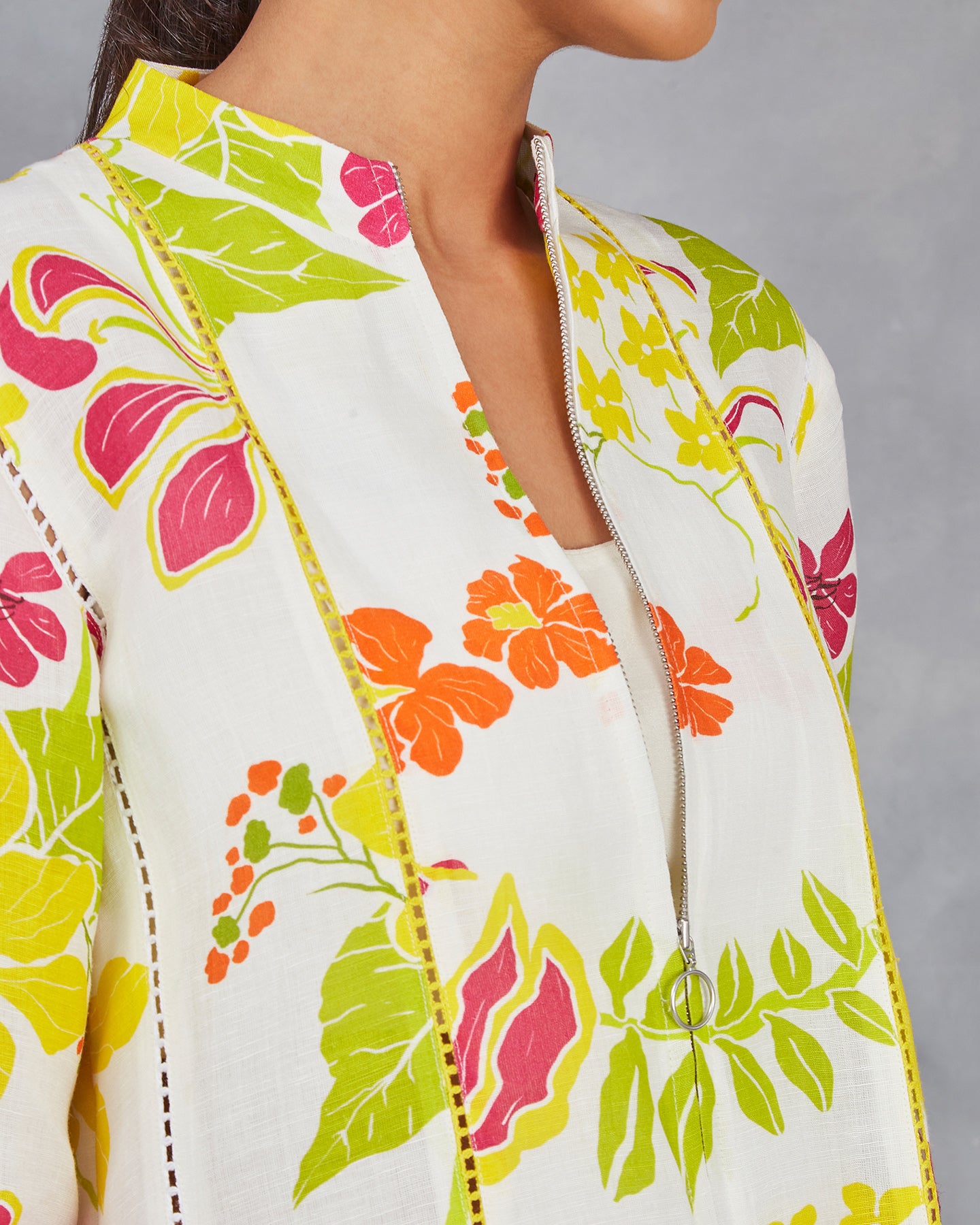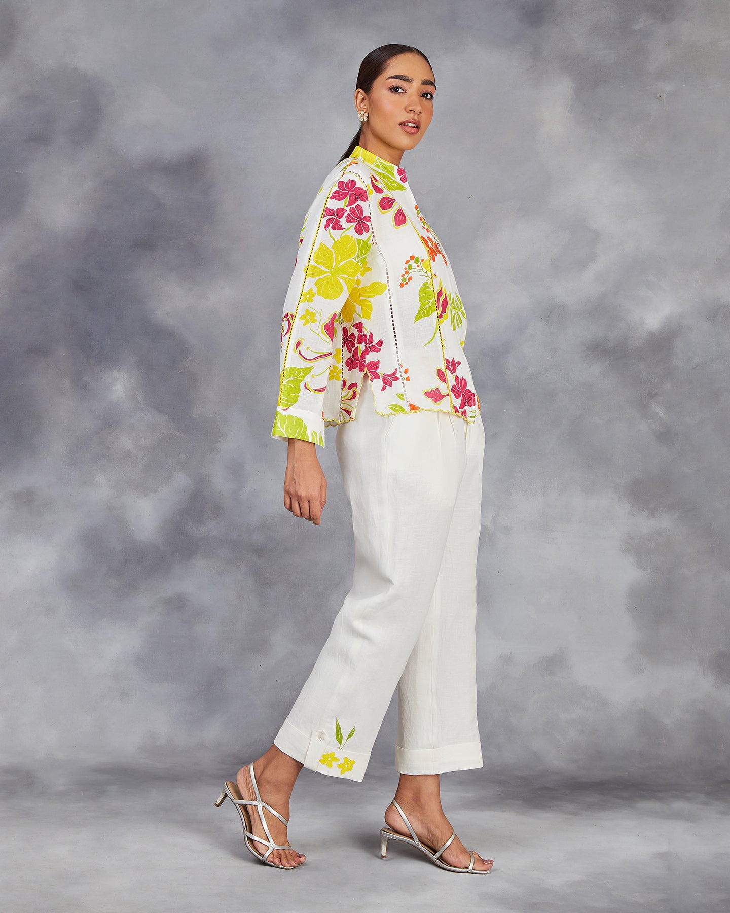 This is a stylish digitally printed off-white pure linen co-ordinate set. The jacket style top features a stand collar, front zip, full sleeves with cuffs, beading and a scalloped hemline. Adorned with a beautiful in-house hibiscus digital print. It is paired with straight pants which have a rolled-up hemline and appliqued floral motifs.