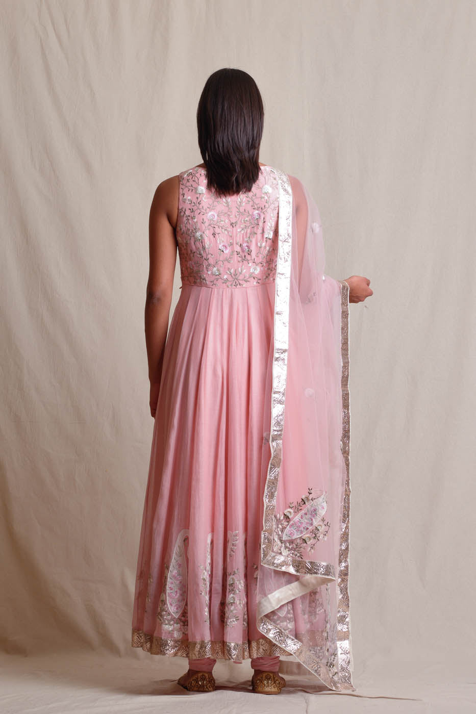 Featuring a pink anarkali in handloom cotton with silk thread embroidered paisley motifs along with a lycra crepe churidar and an embroidered tulle dupatta.