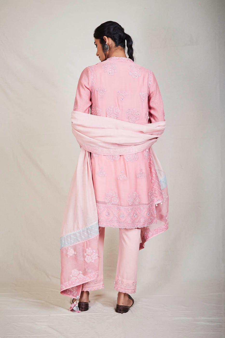 This set features a pink mul kurta enhanced with floral butis and a geometric pattern embroidery, a pair of cotton pants and a mul dupatta.