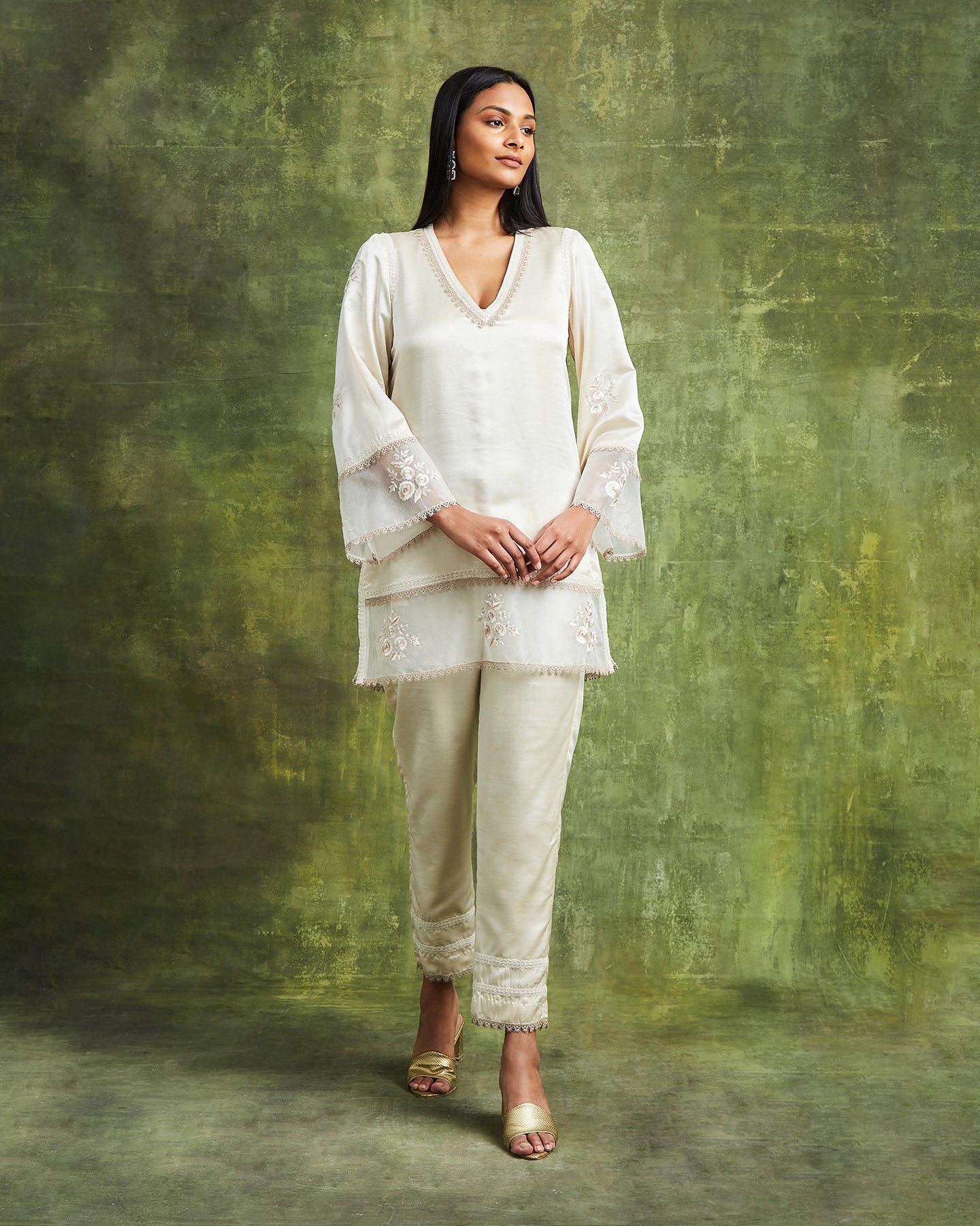 Introducing our stunning Off-White Silk Satin Co-ord Set, a true epitome of luxury and elegance. This set features beautifully embroidered silk thread florals on organza, showcasing meticulous craftsmanship. The delicate lace detailing adds an extra touch of femininity and grace. Crafted with the finest quality silk satin, this co-ord set exudes sophistication and style. Embrace the timeless beauty of this ensemble and make a lasting impression at any special occasion or event. Elevate your wardrobe with this off-white silk satin co-ord set and exude confidence and charm wherever you go.