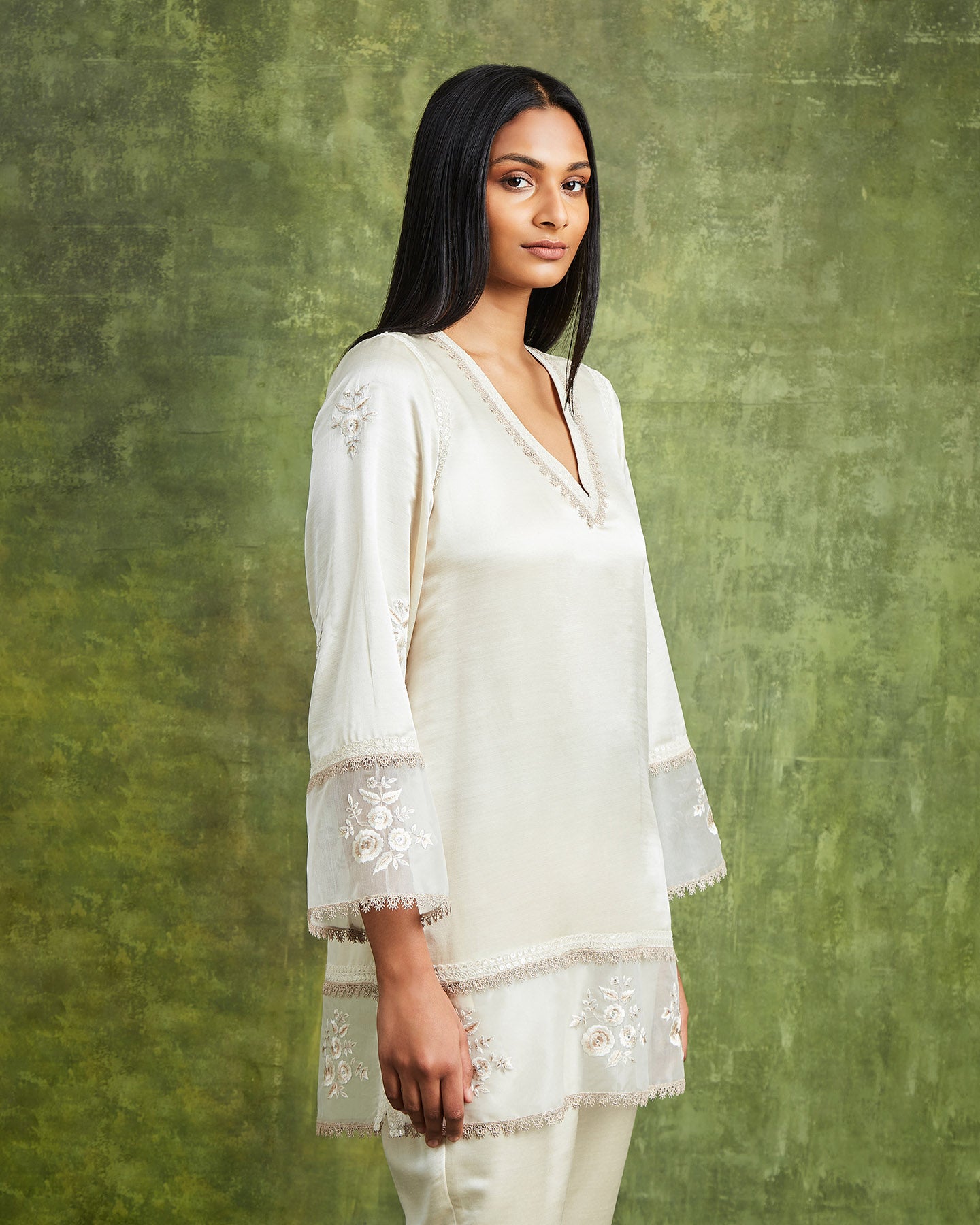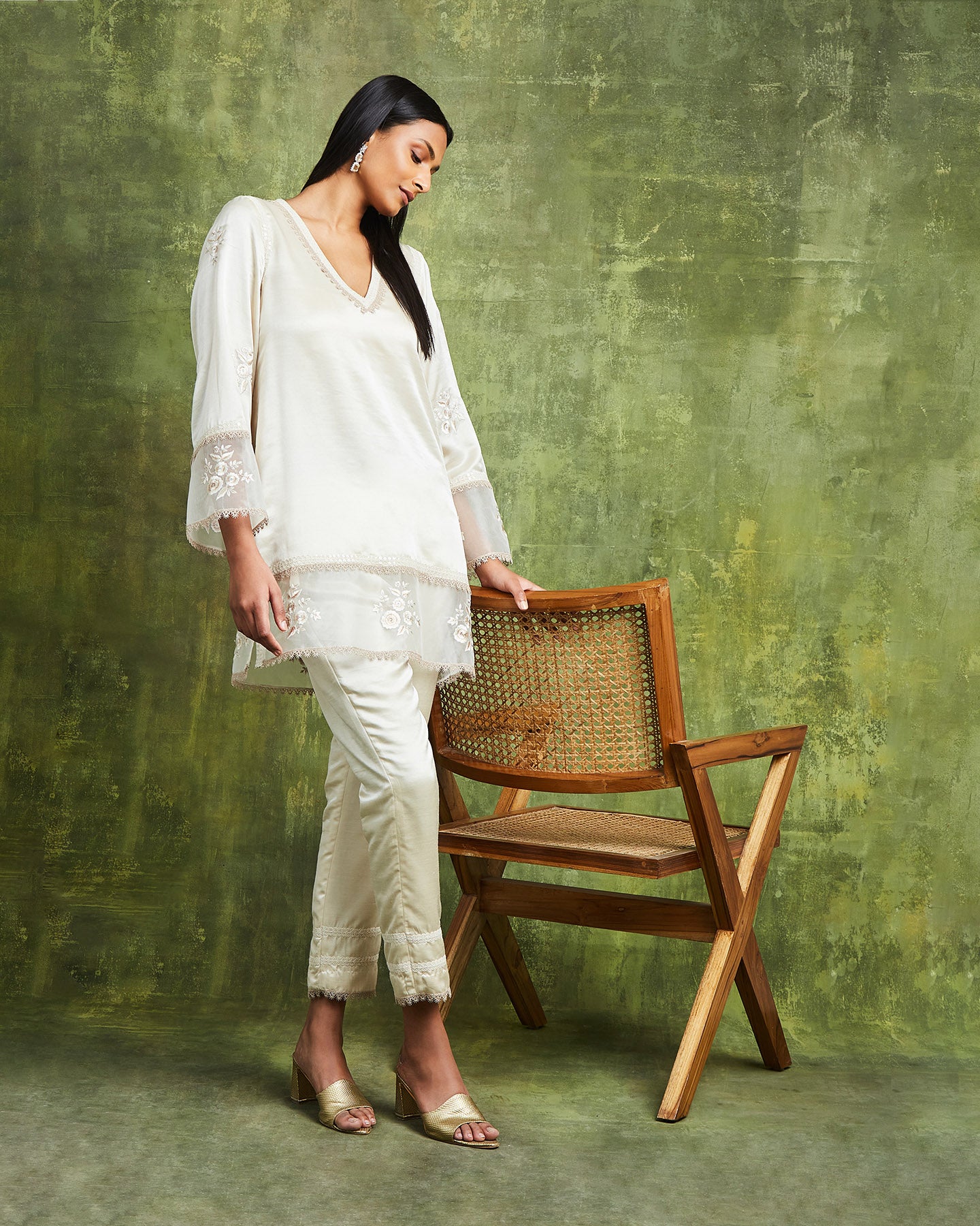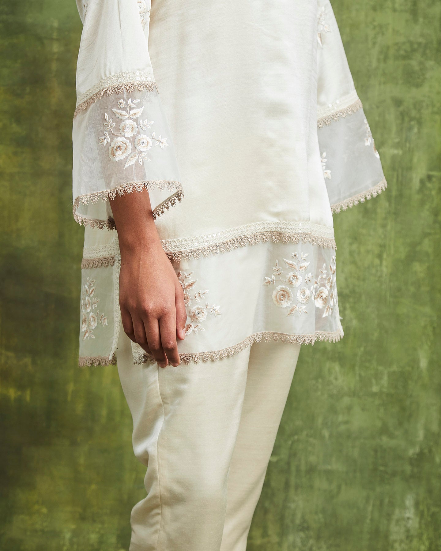 Embroidery Beautiful silk thread work floral motifs and lace detailing adorn this coordinate set.