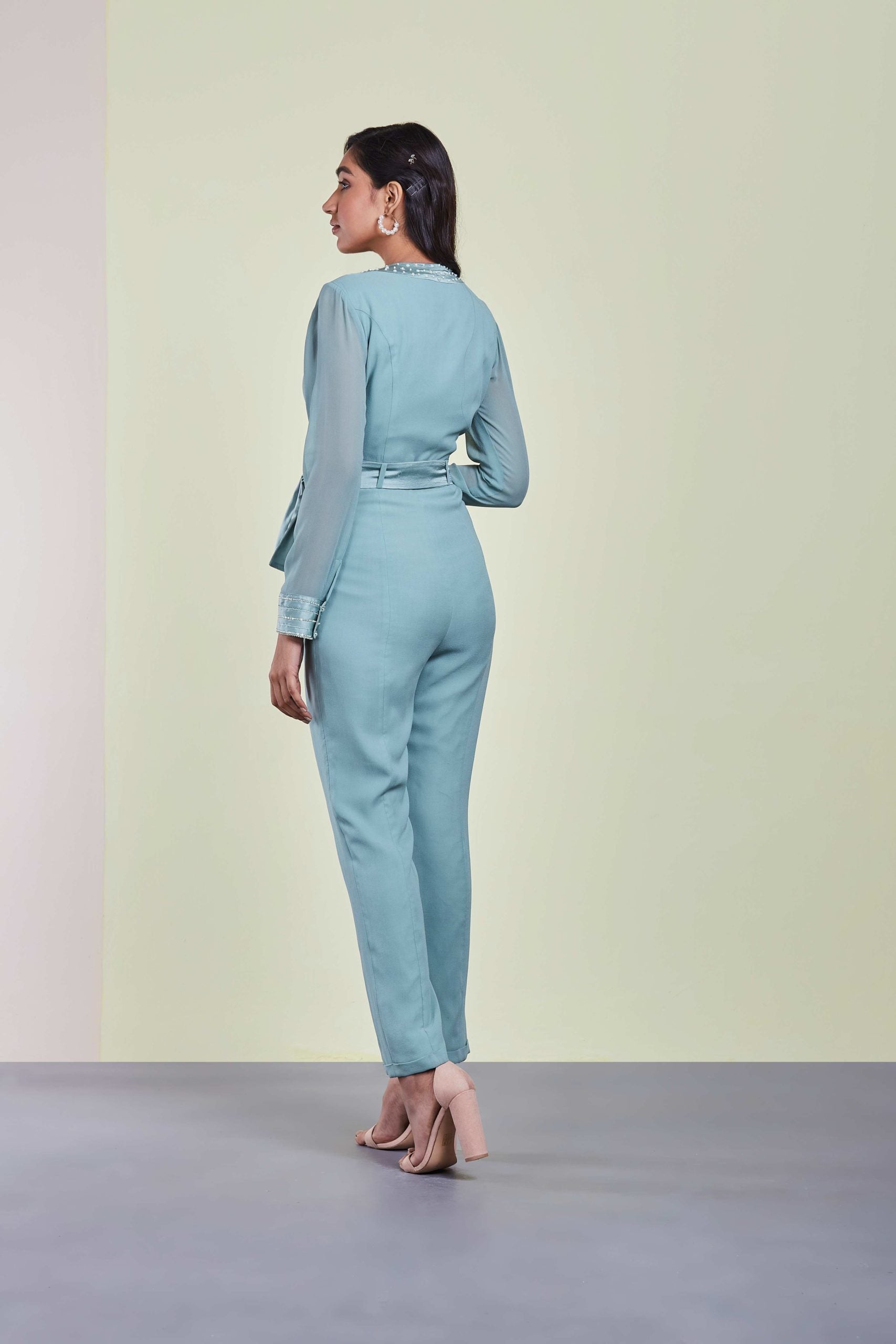 Featuring blue surf georgette embroidered jumpsuit accentuated with an embroidered satin bow.