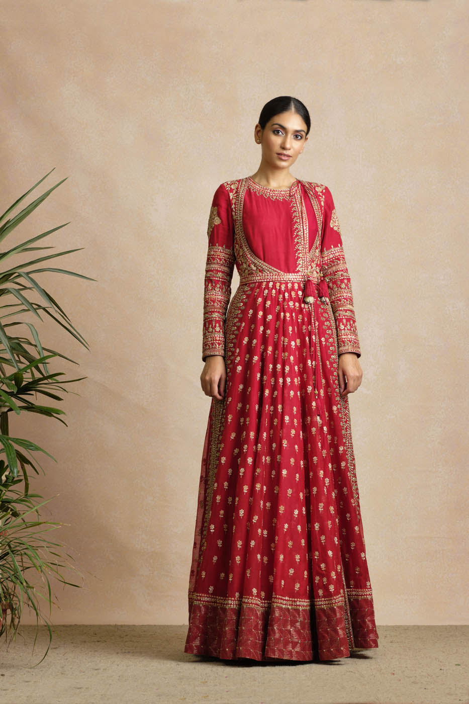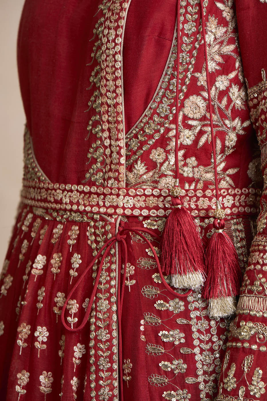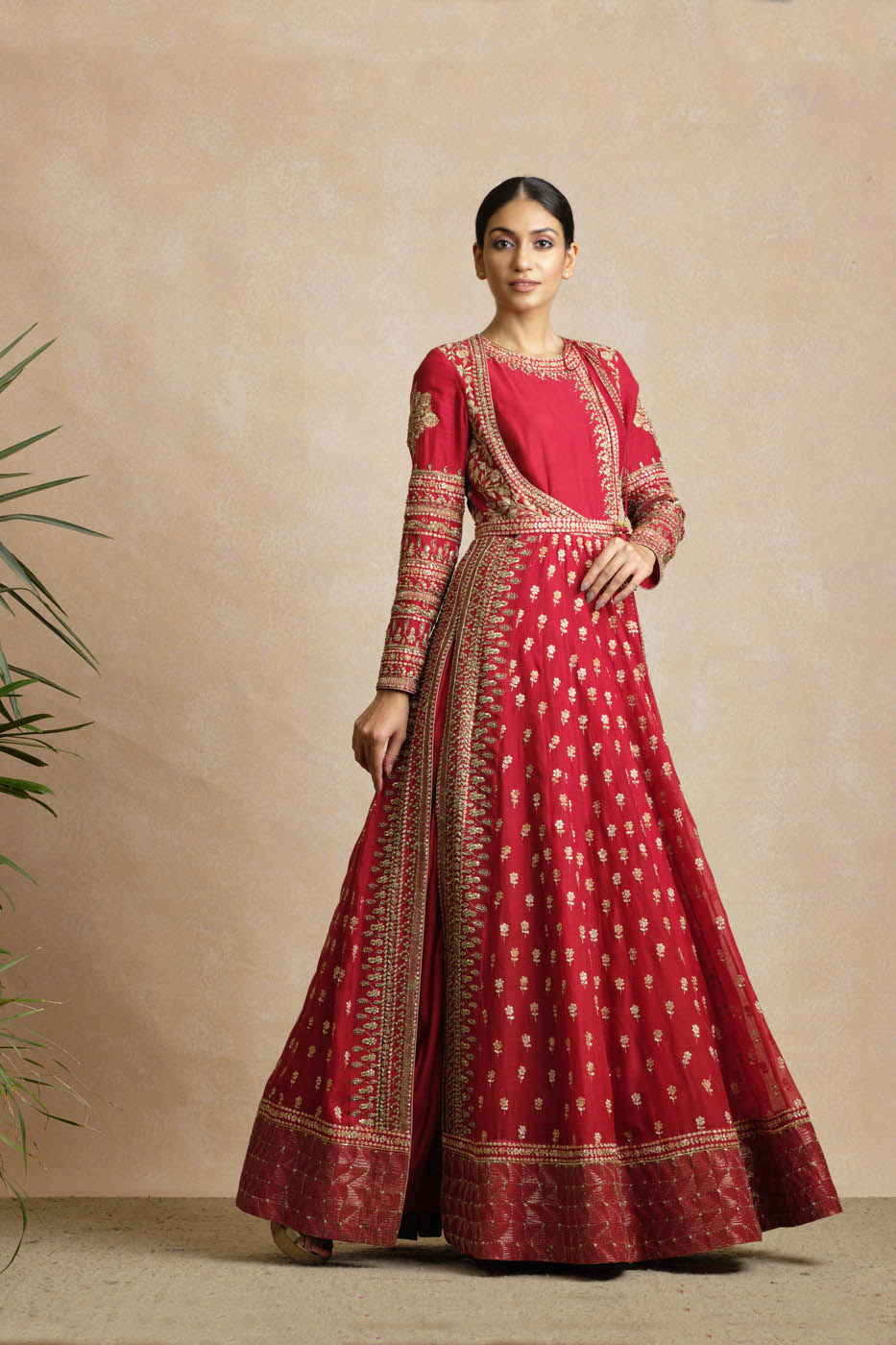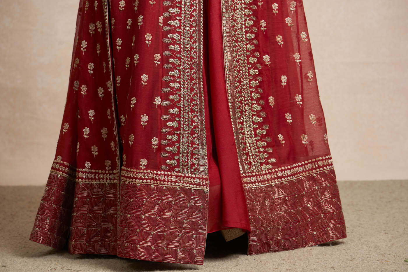 This sultani surk red set features a handloom maheshwari cotton embroidered angrakha anarkali with a loose bottom.