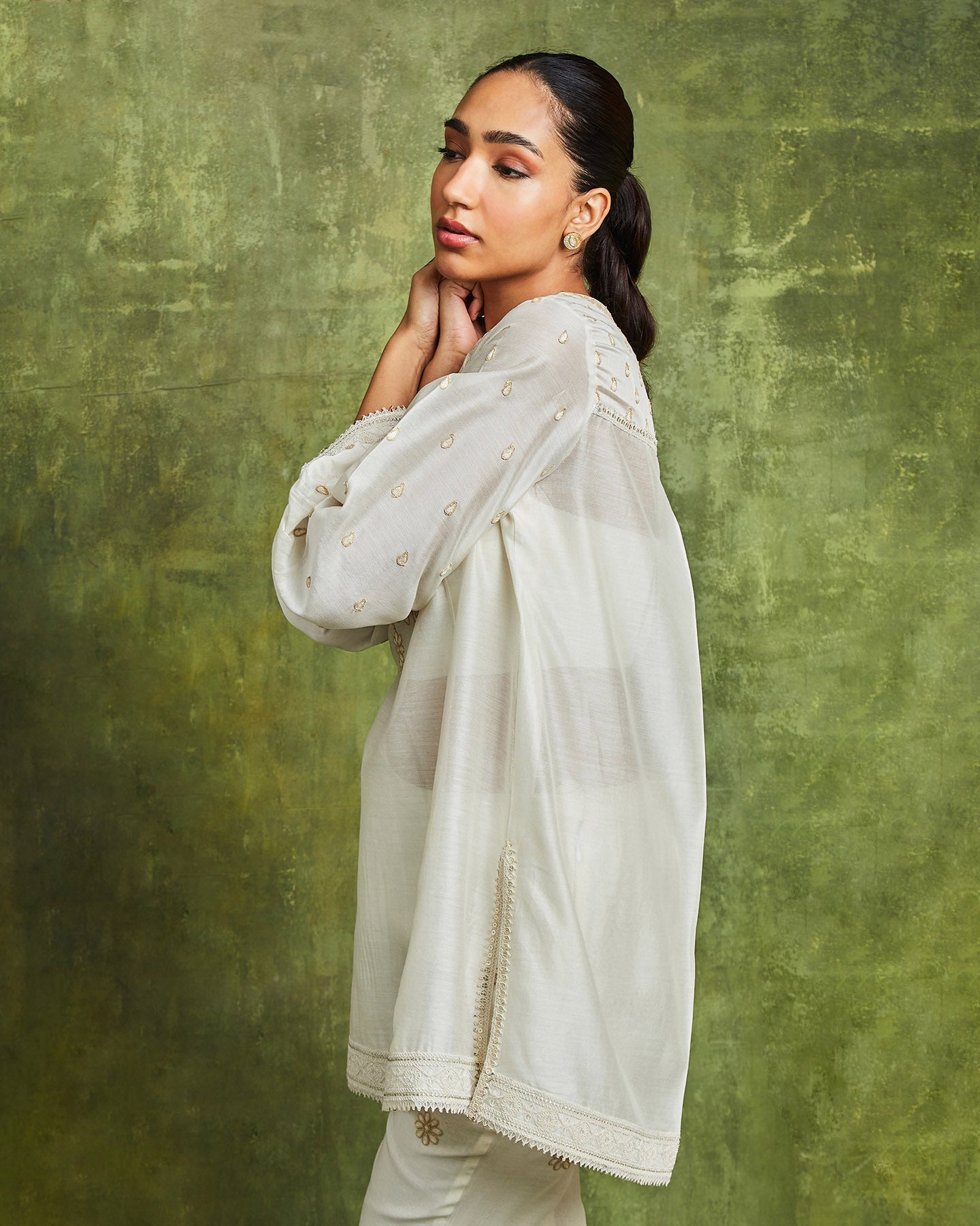 Embroidery Tonal dori embroidery along with lace trim detailing, add depth and dimension to the beautiful design.