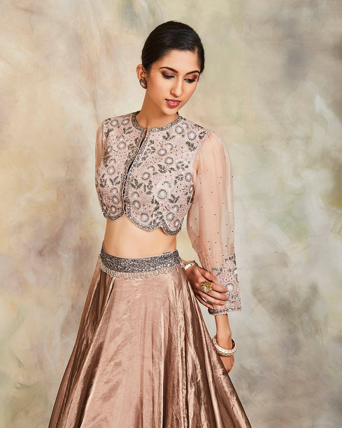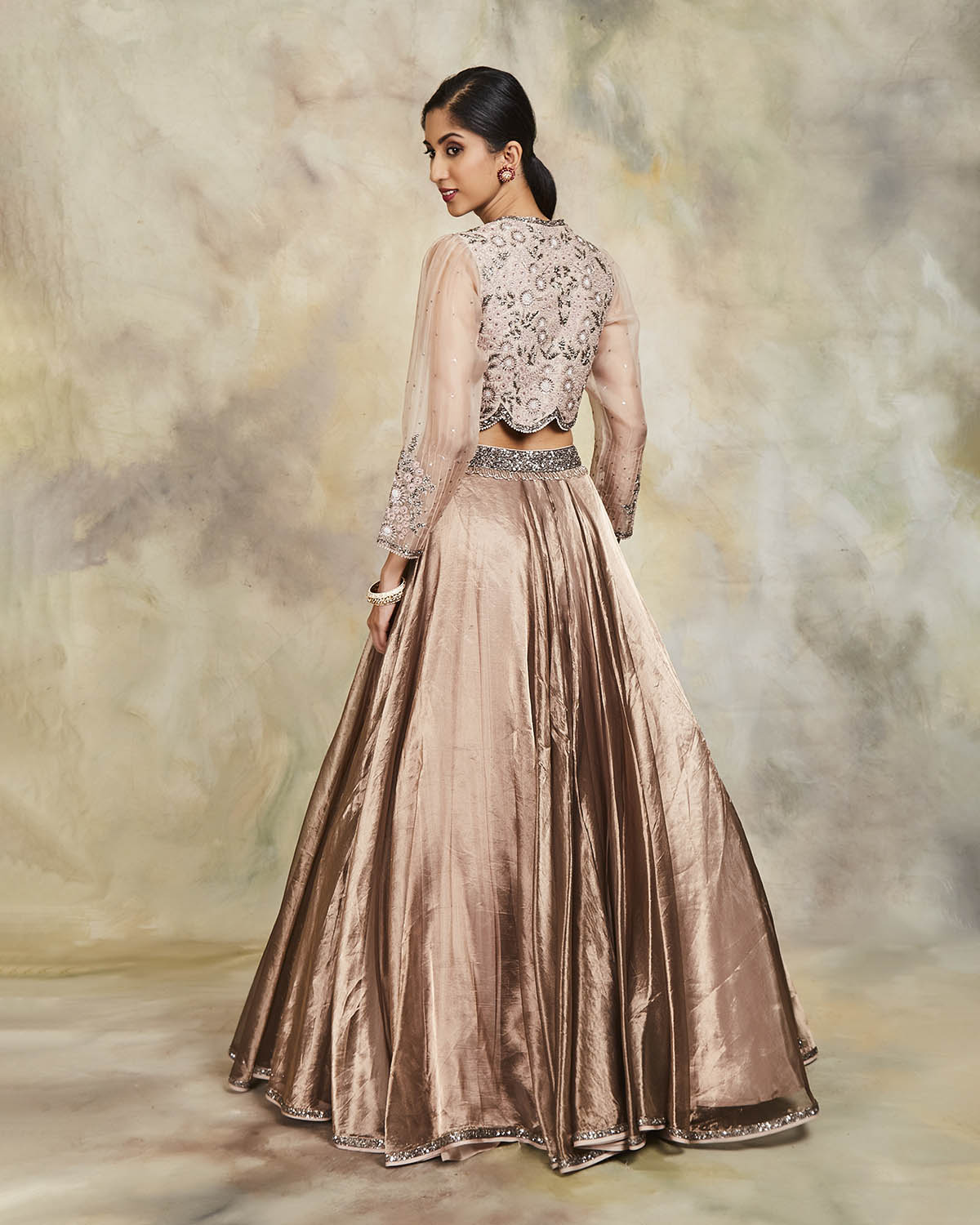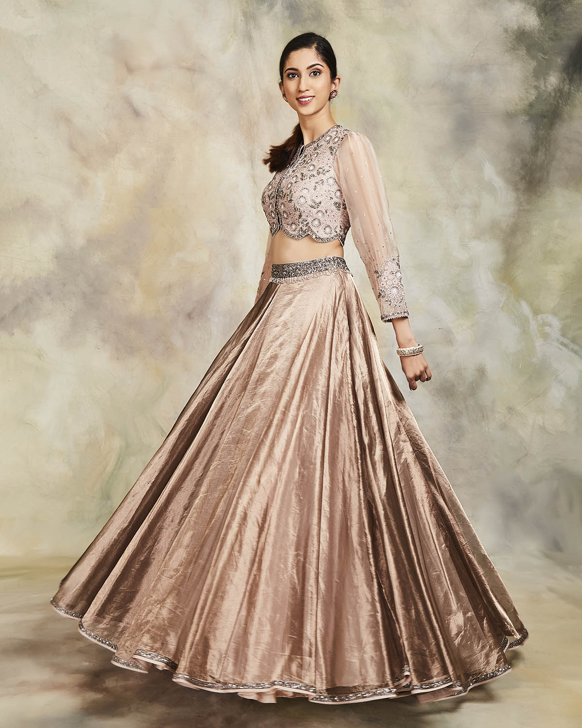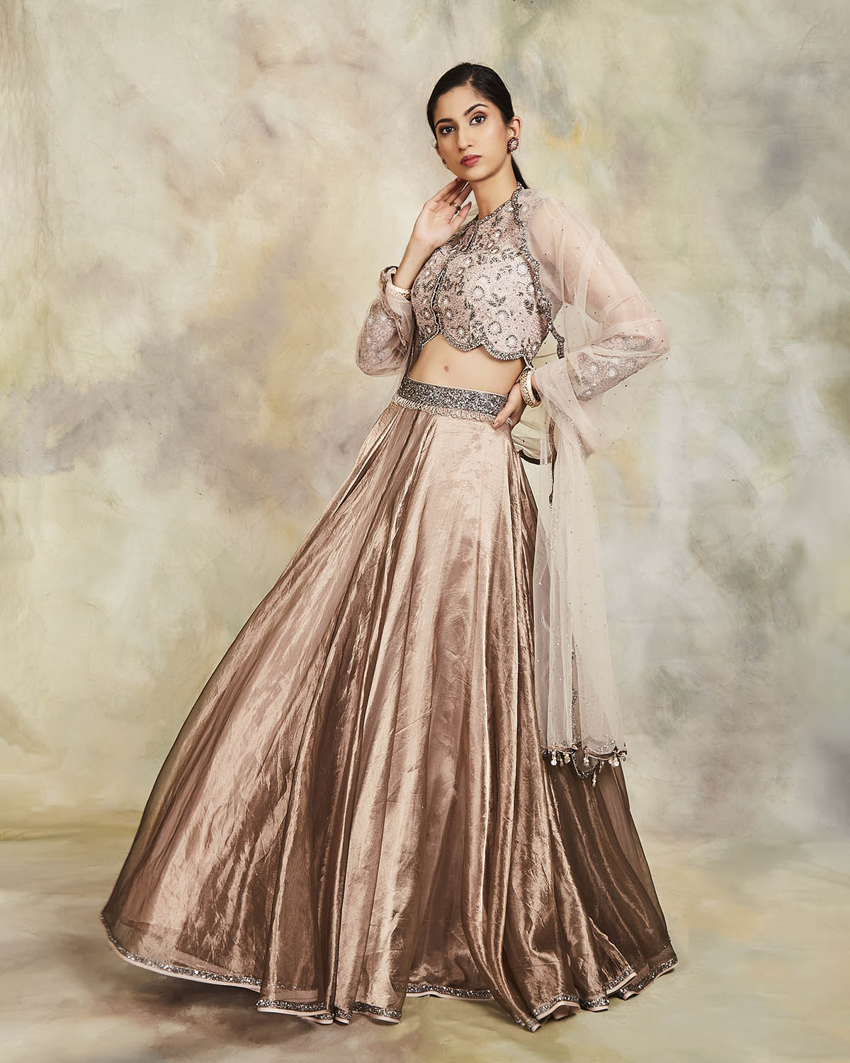 This grey tissue lehenga has been highlighted with sequins. It comes with an embroidered raw silk blouse and an embroidered scalloped tulle dupatta.