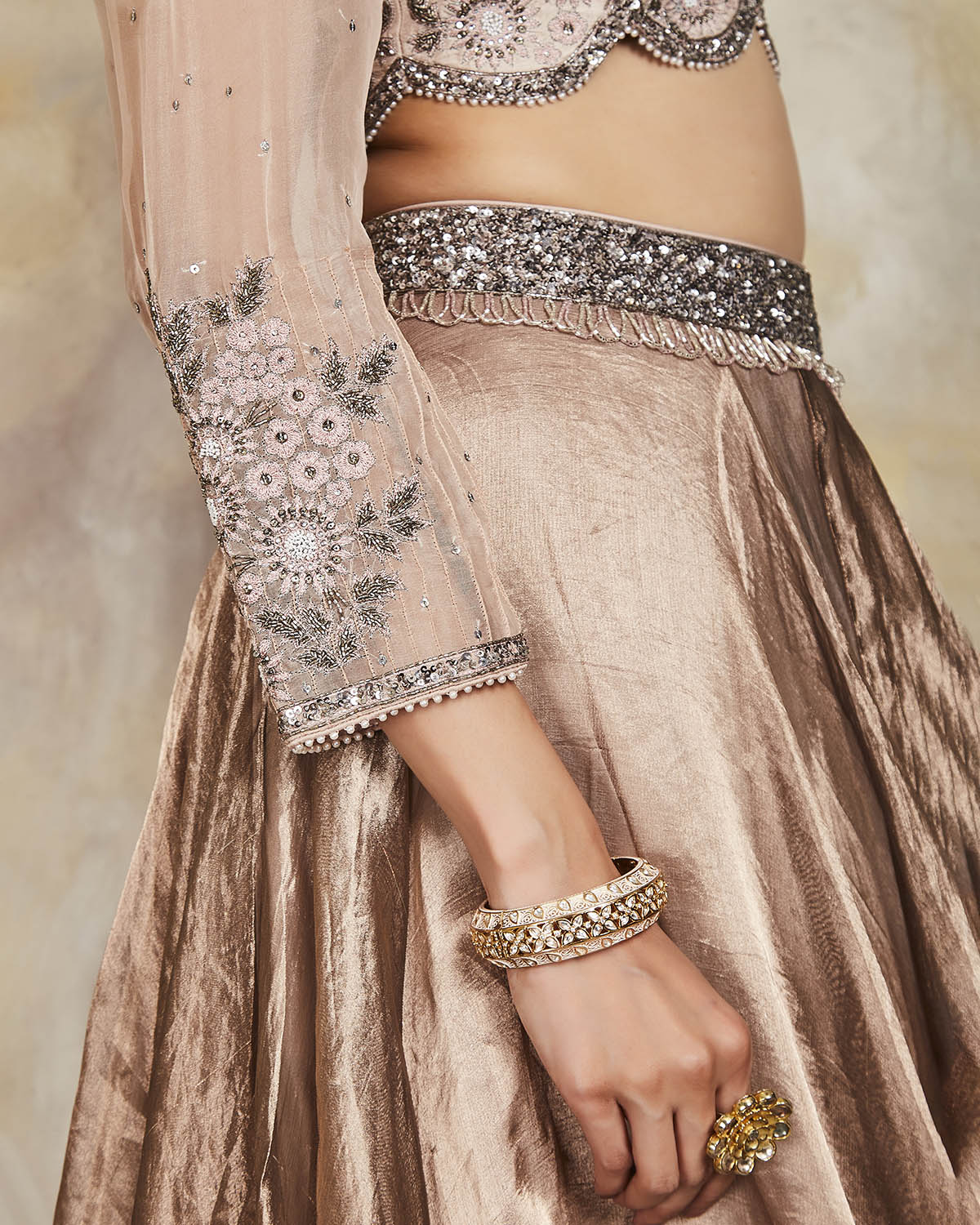 Embroidery Hand embroidered floral motifs using sequins.
