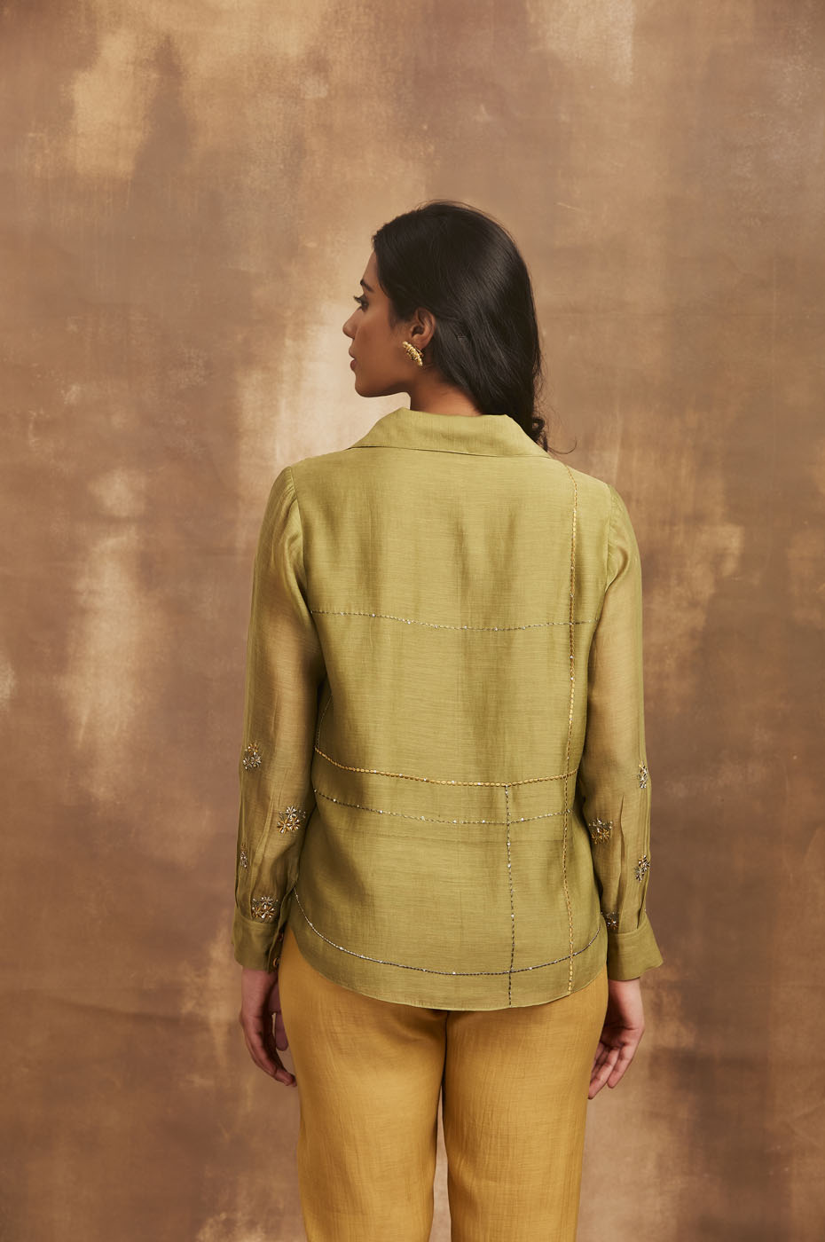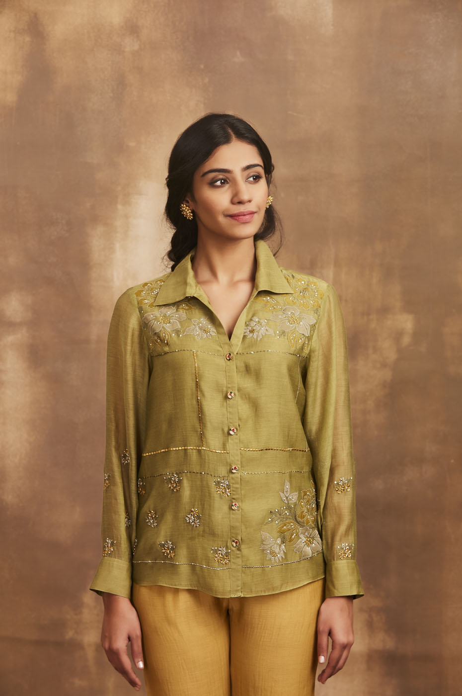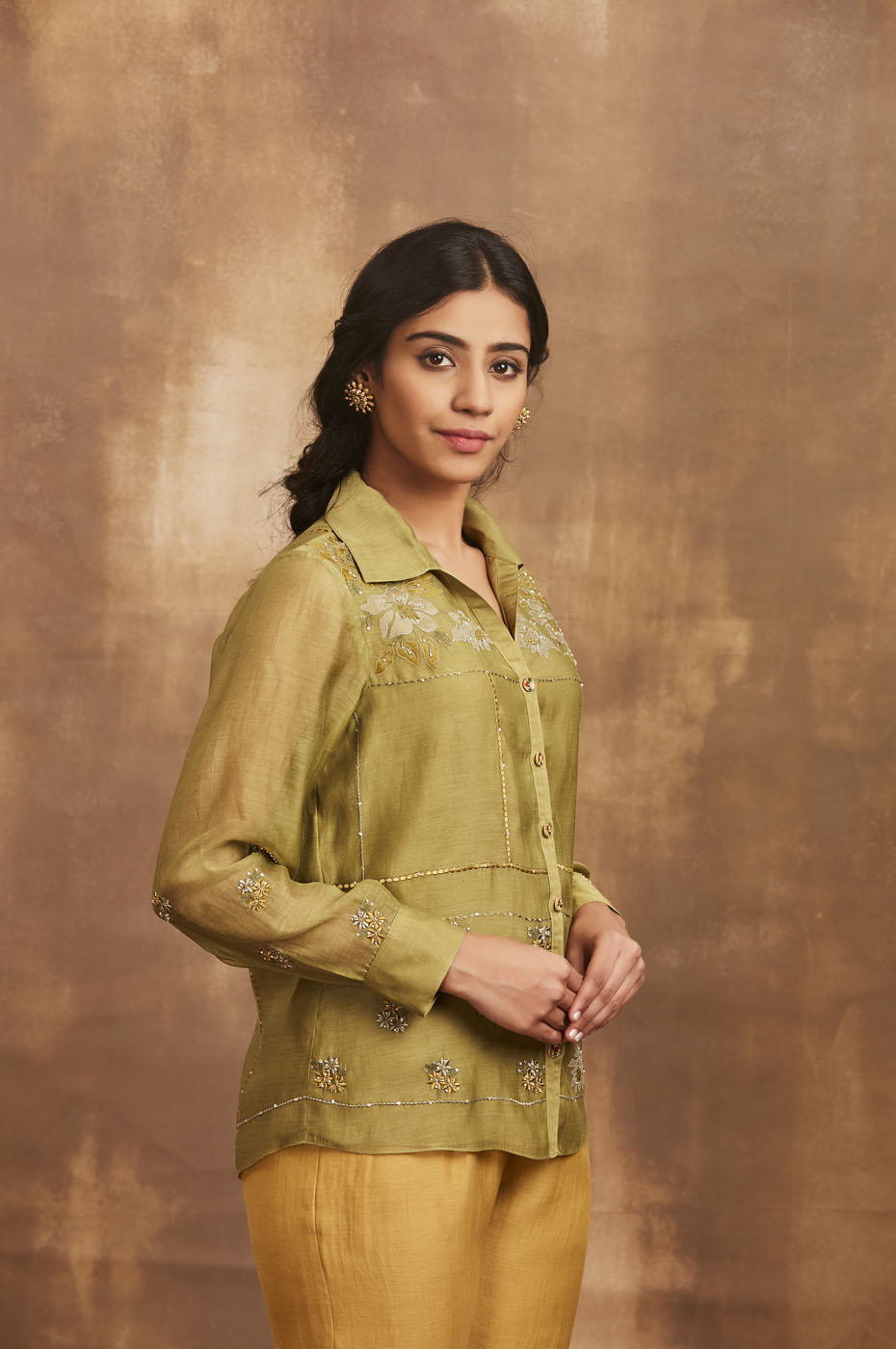 This set features olive green mal embroidered shirt with placement embroidery.