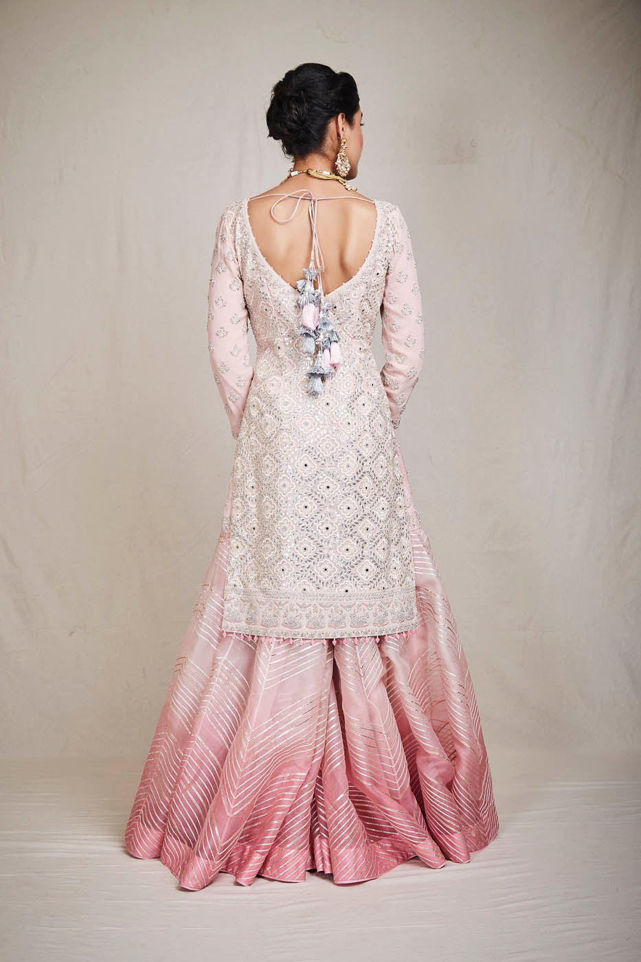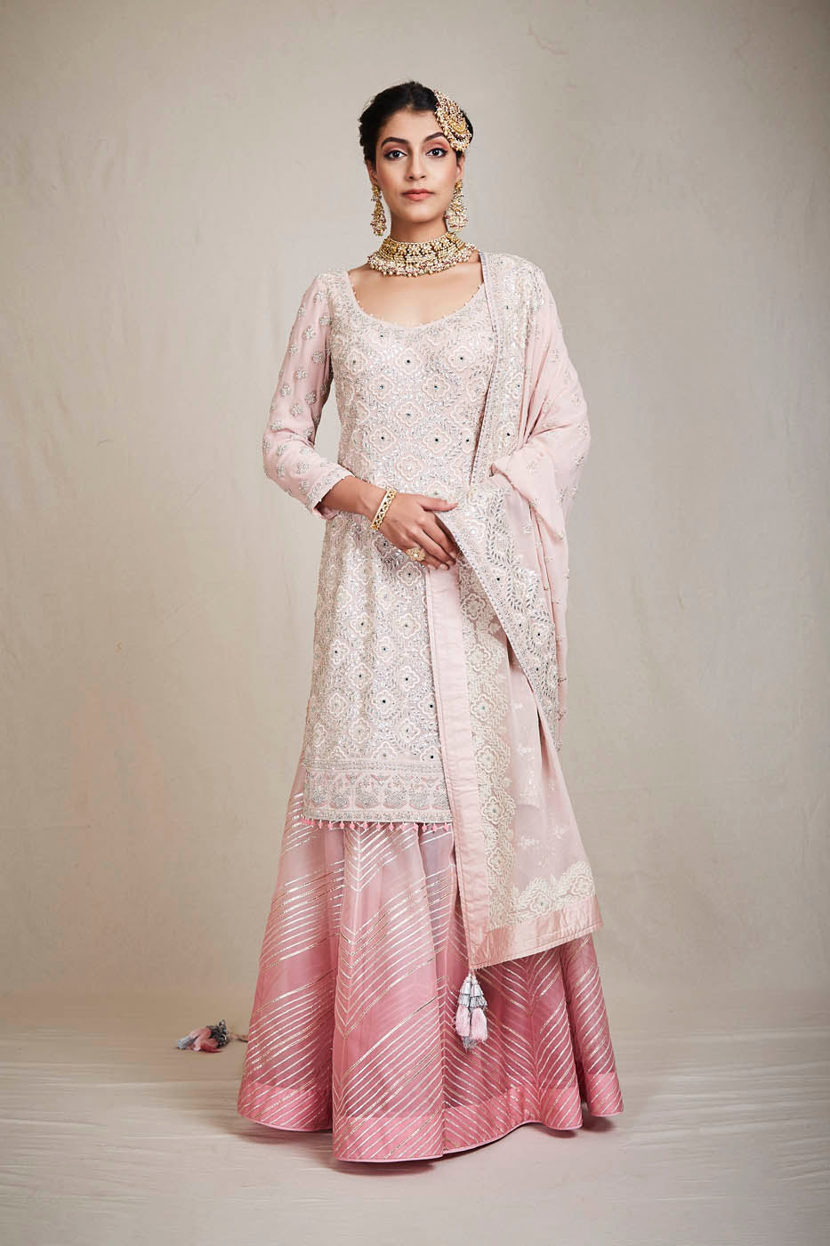 This set features a pink georgette kurta enhanced with embroidred jaal and floral butis. It comes with an ombre organza sharara and an georgette dupatta.