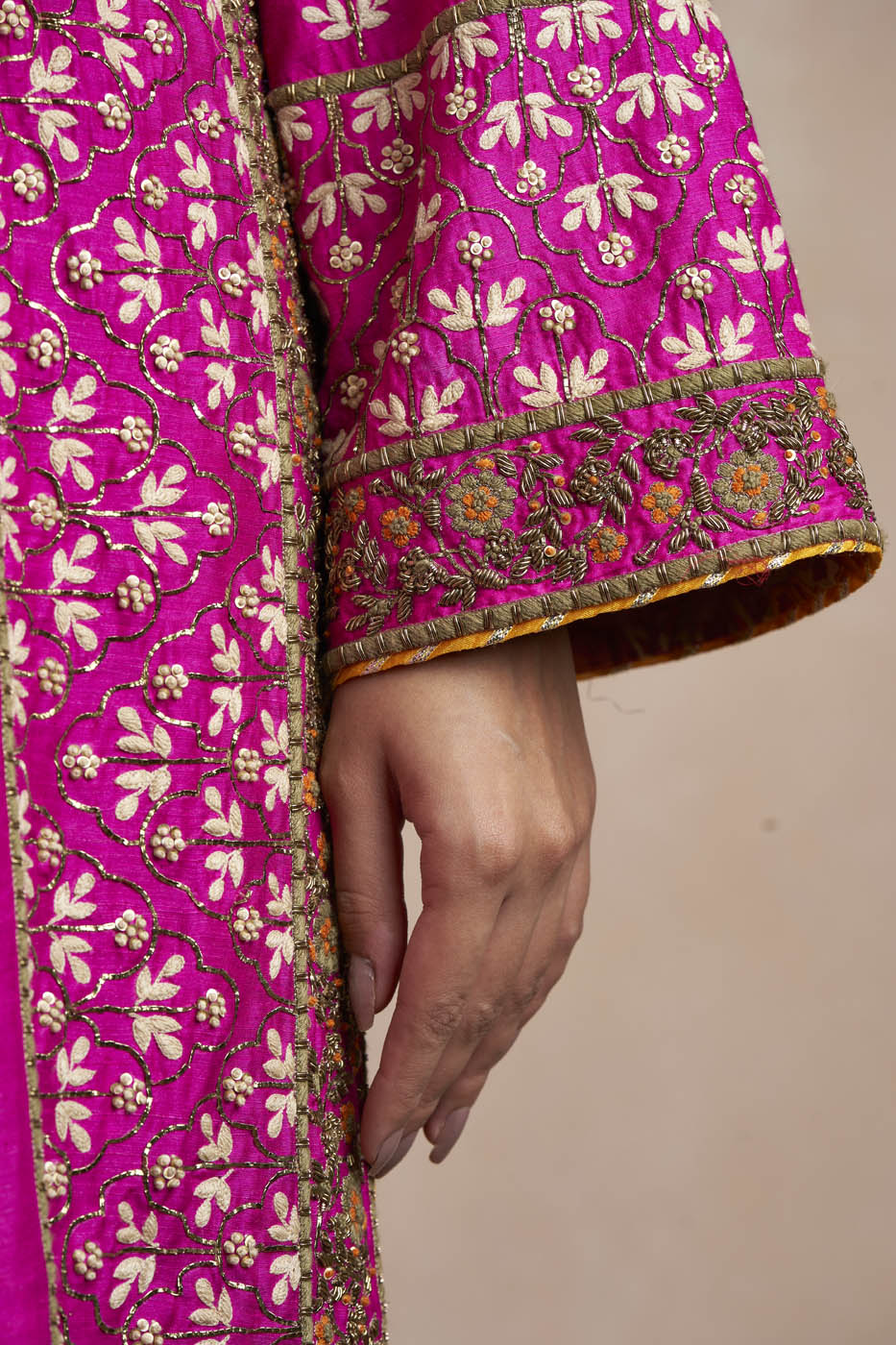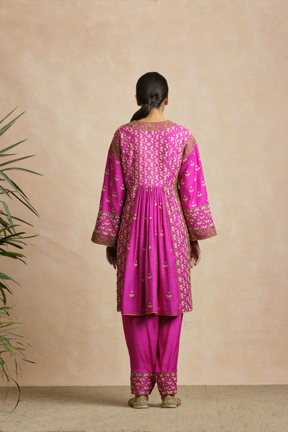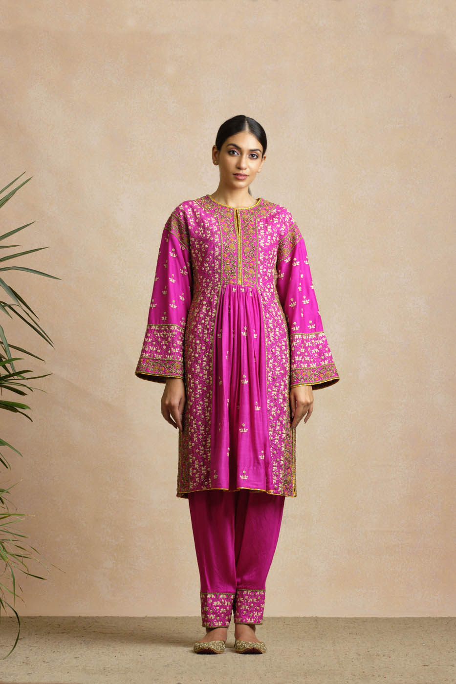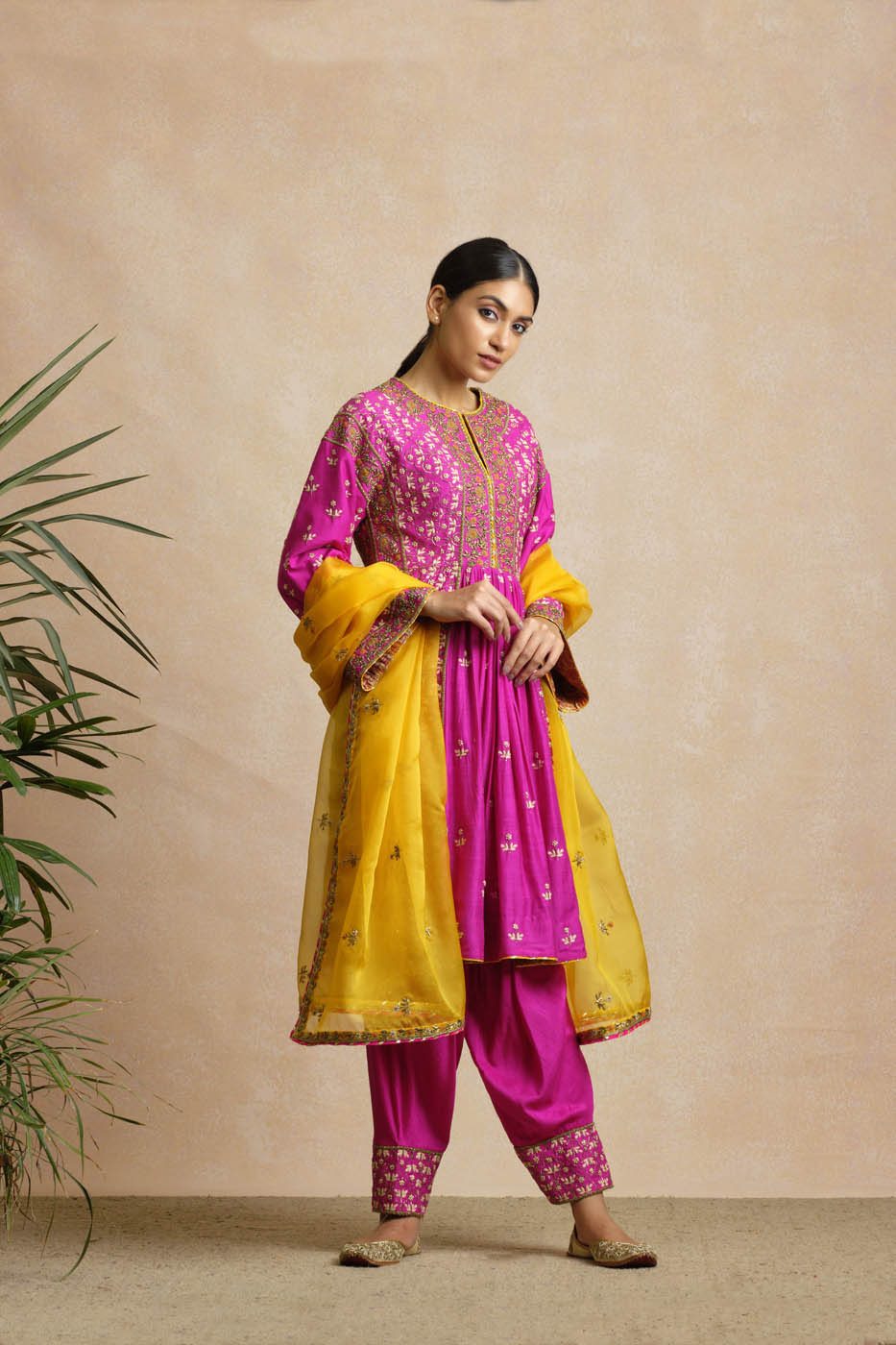 This set featuring Pink embroidered short geathered shirt and salwar paired with yellow dupatta