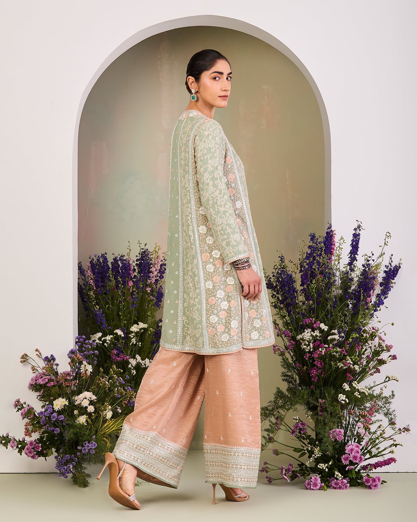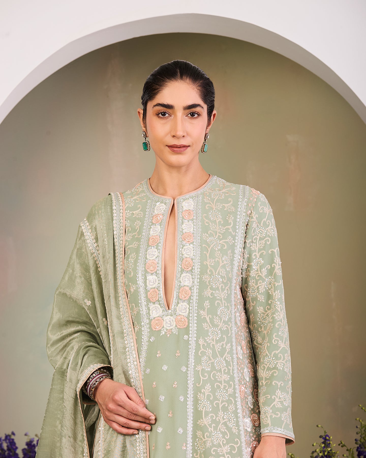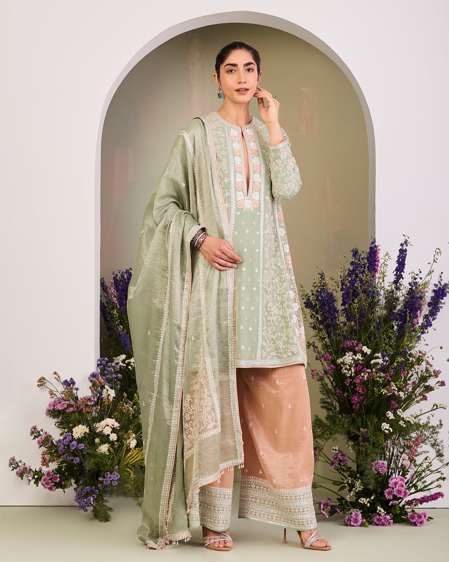 This sage green pure georgette short kurta features a touch neck with a slit and loose-fit full sleeves. It is paired with a peach handwoven cotton tissue farshi salwar and a sage green handwoven cotton tissue dupatta. The set showcases multi-colour silk thread rose flowers and a vintage pattern handcrafted using the aari technique. Enhanced with sequins, zari, contrast piping and Swarovski crystals.