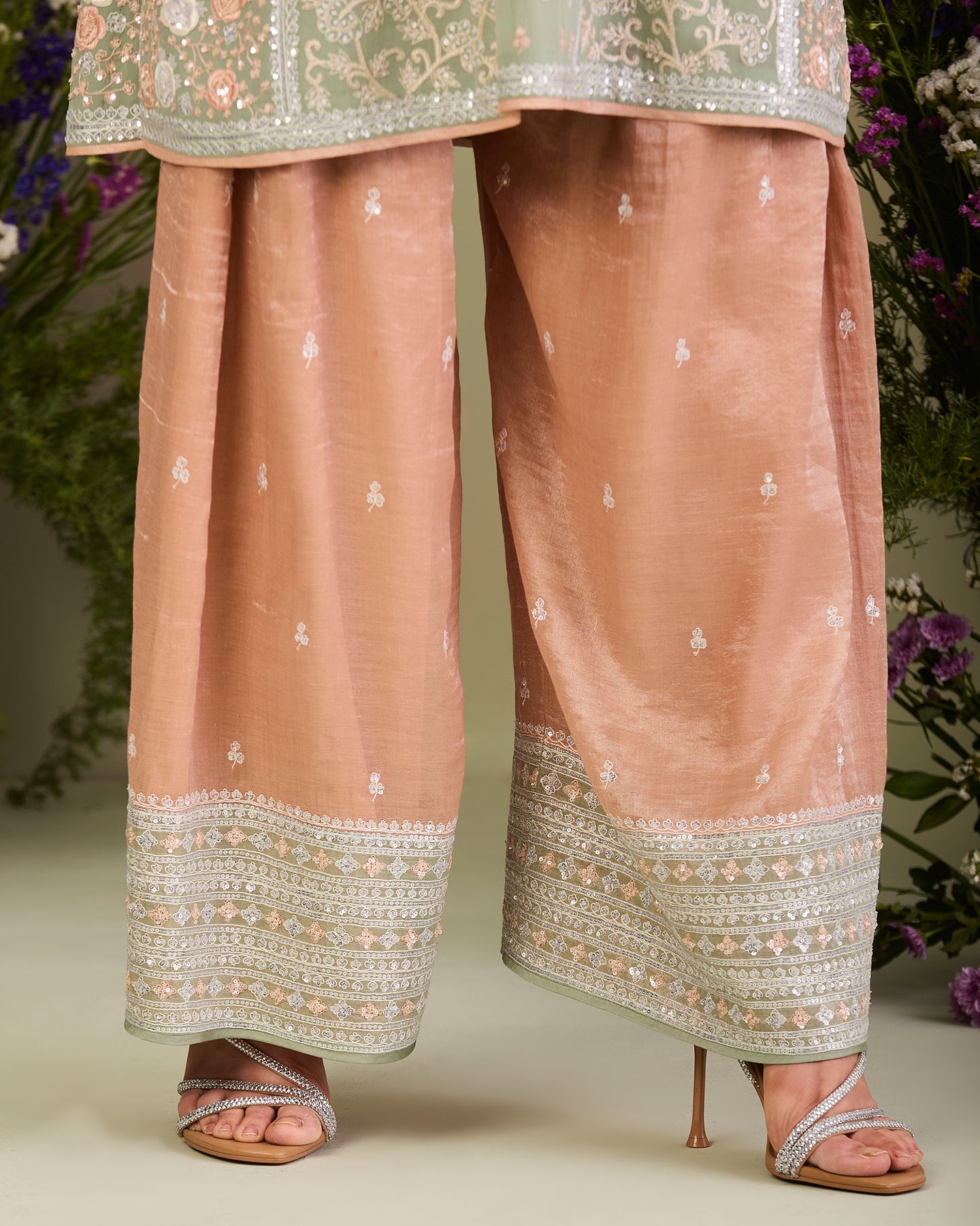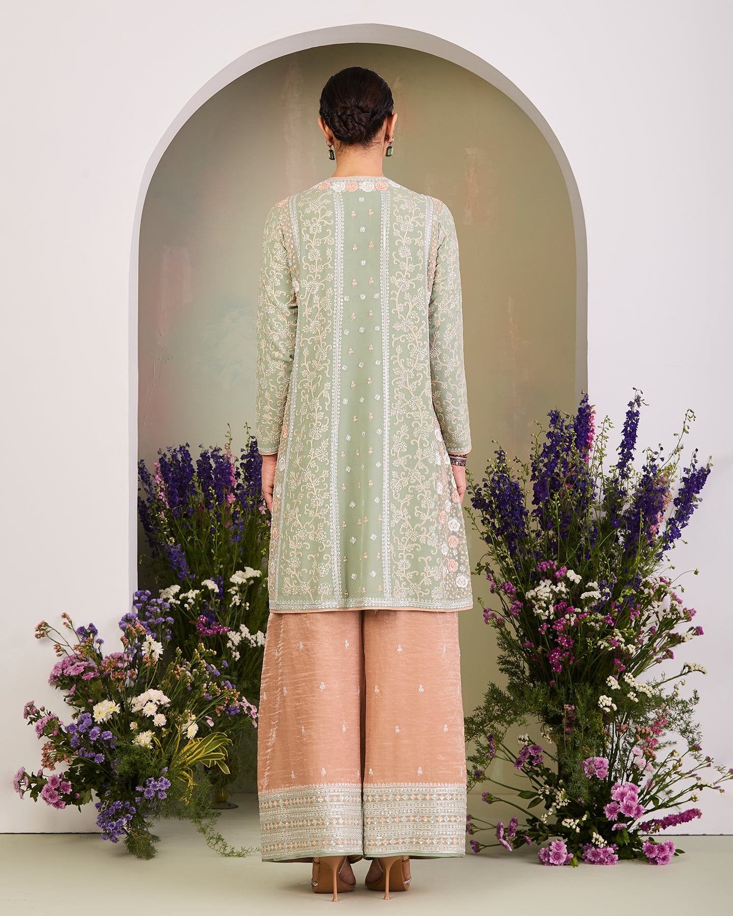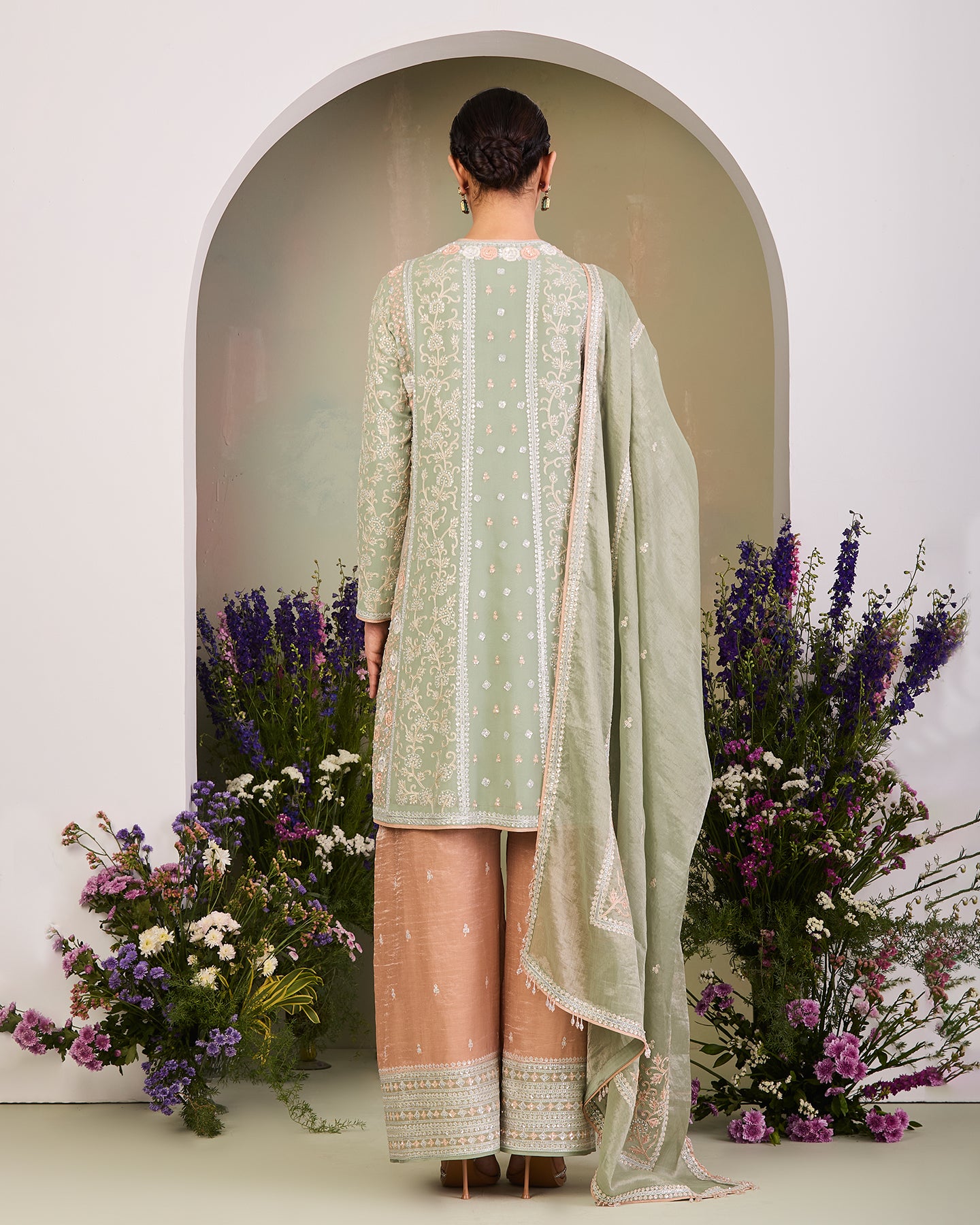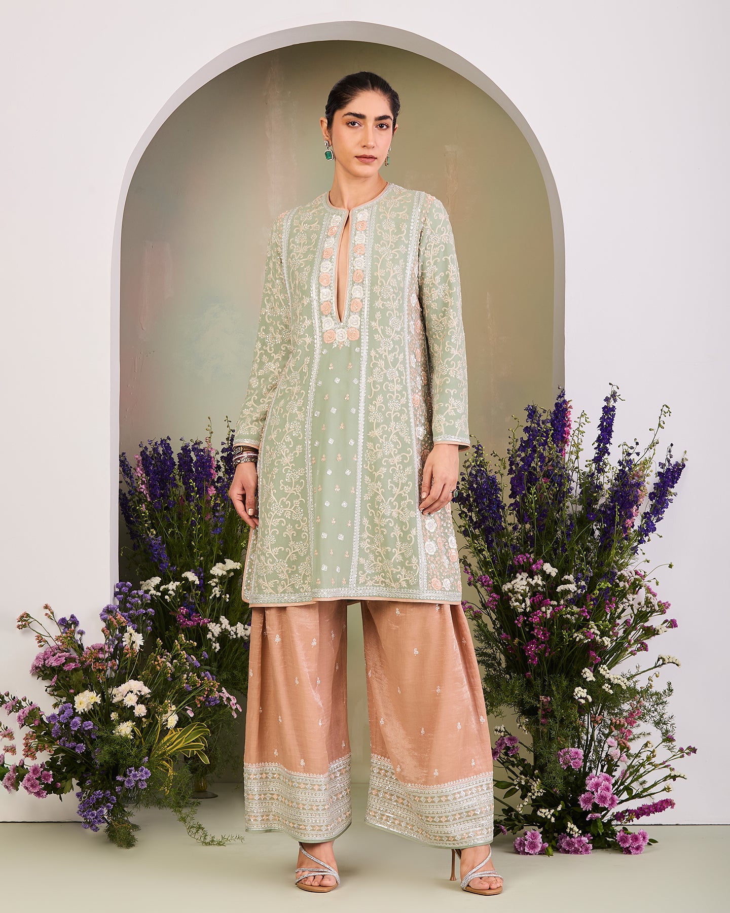 This sage green pure georgette short kurta features a touch neck with a slit and loose-fit full sleeves. It is paired with a peach handwoven cotton tissue farshi salwar and a sage green handwoven cotton tissue dupatta. The set showcases multi-colour silk thread rose flowers and a vintage pattern handcrafted using the aari technique. Enhanced with sequins, zari, contrast piping and Swarovski crystals.