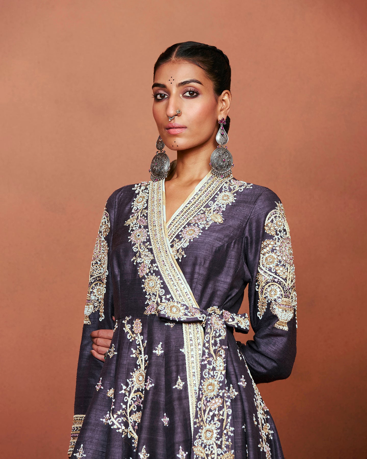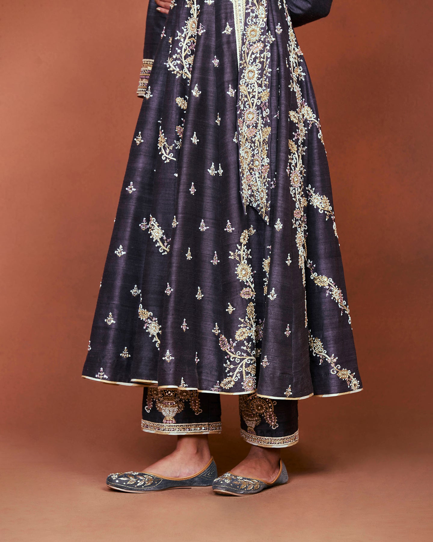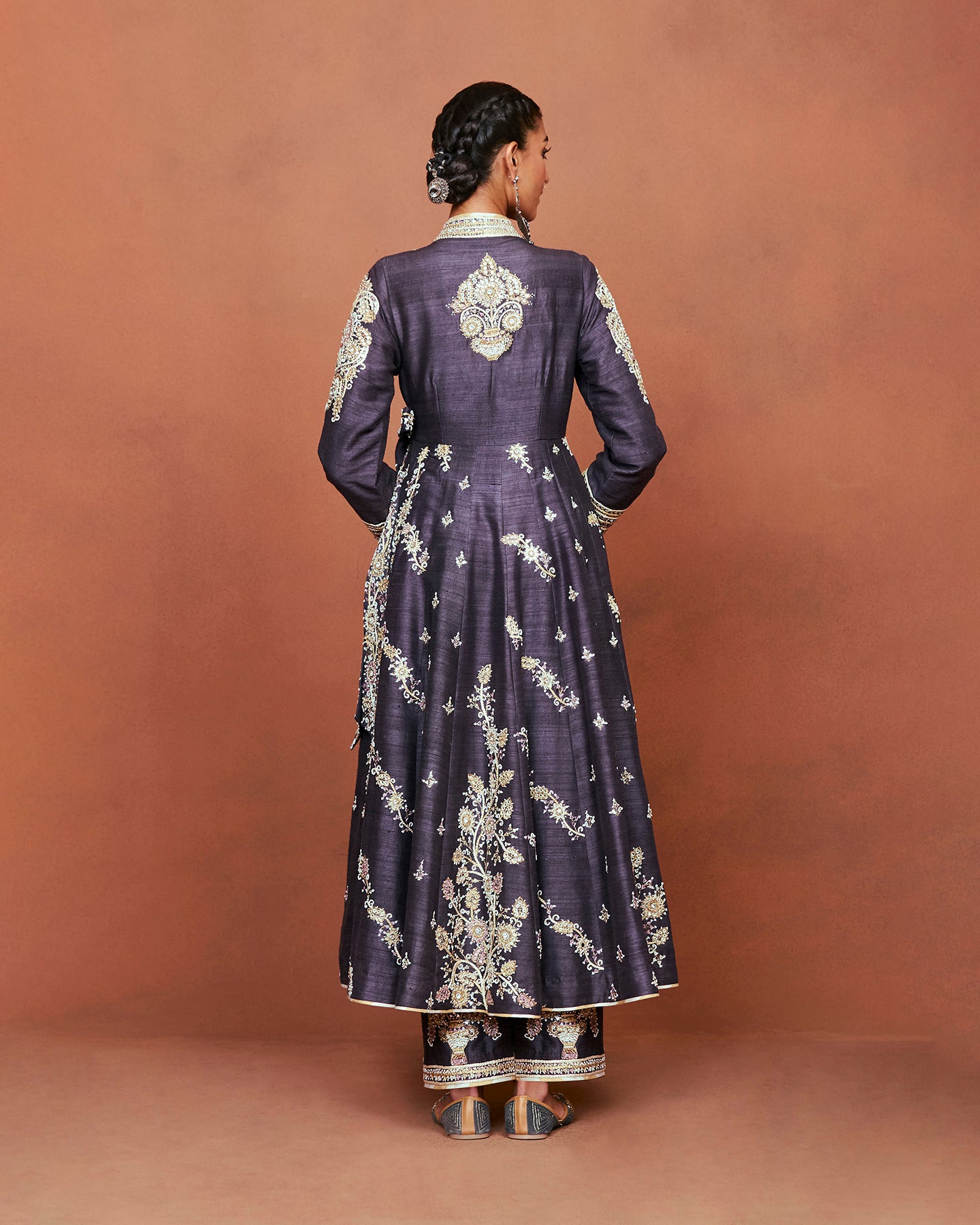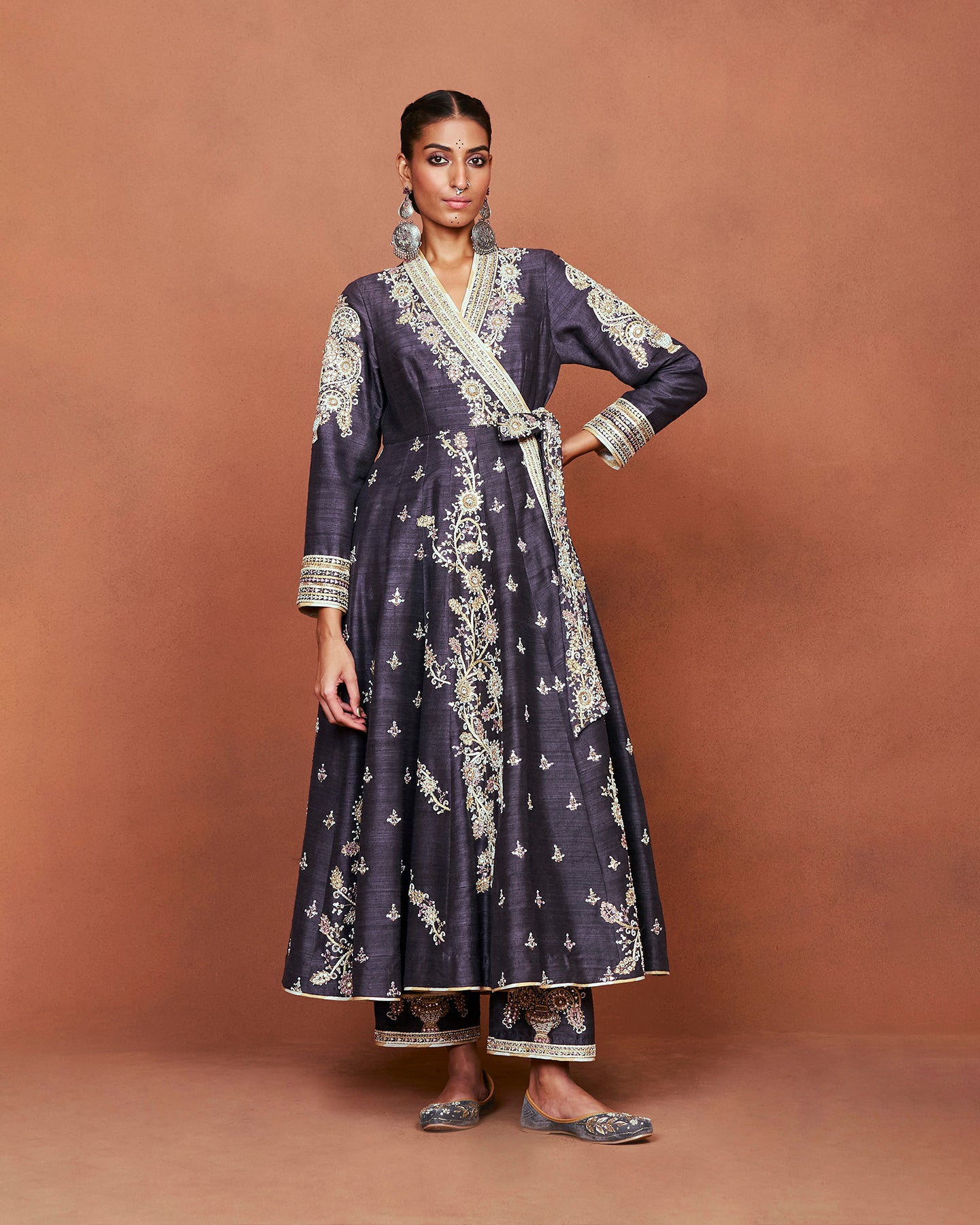 This is an exquisite long kalidar angrakha, crafted in charcoal grey raw silk. It features a deep V-neckline, full sleeves, and an attached belt. Paired with matching straight fit pants. The set is adorned with beautiful motifs inspired from Rajasthan's traditional thikri work. Embroidered using silk threads, patri work, pearls, pitta work, and Swarovski.